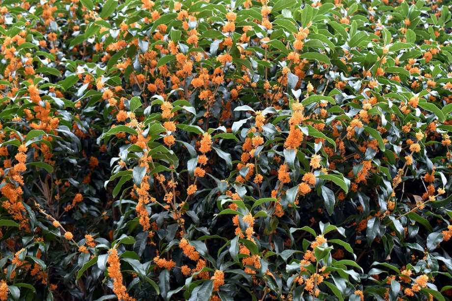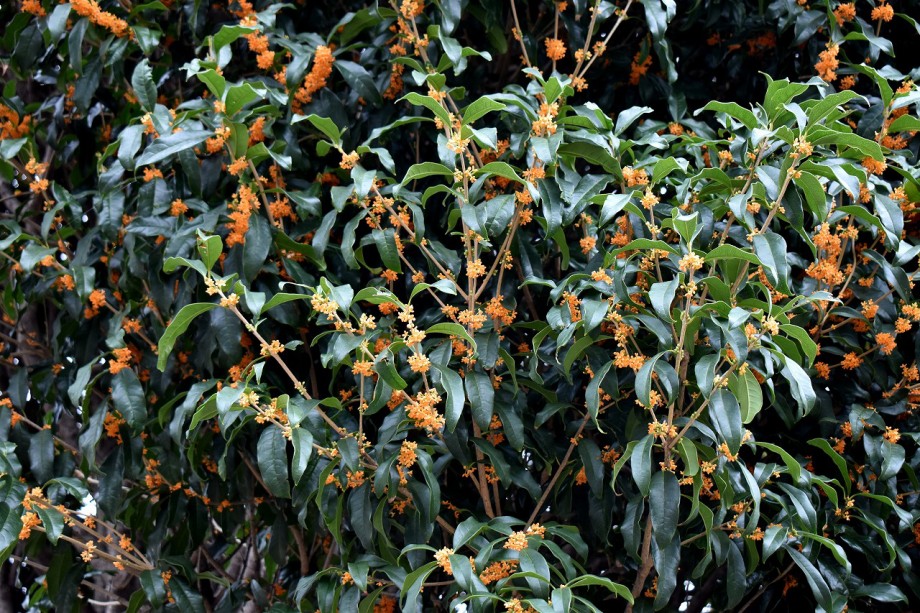 植えられており満開です。オレンジ色の花がたくさん咲いていますので迫力があります。薬王寺には3本の金木犀があり、一斉