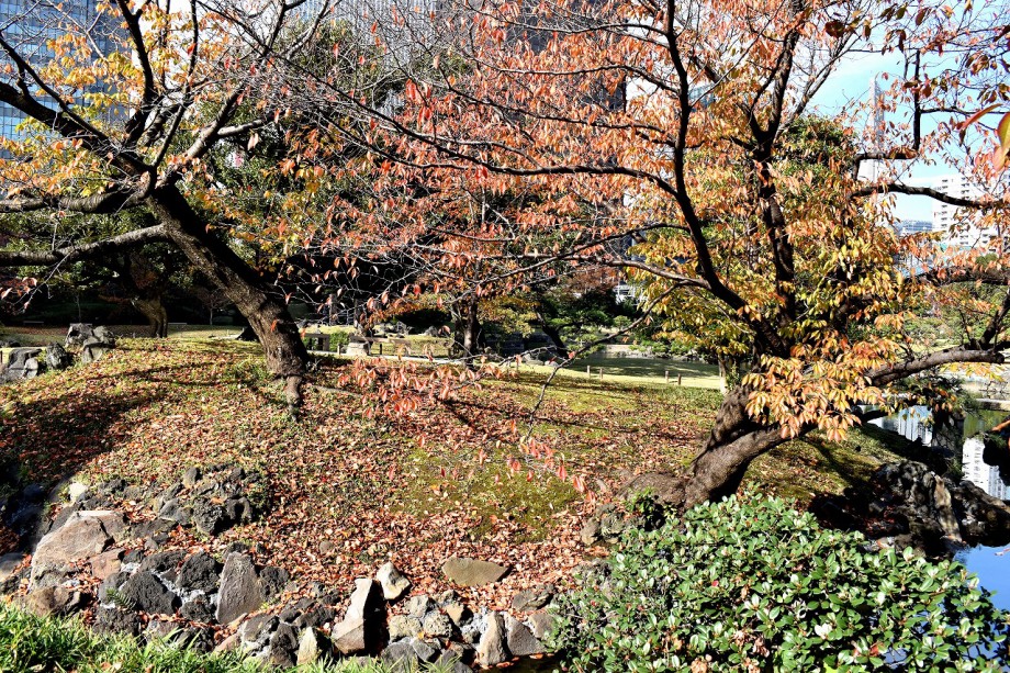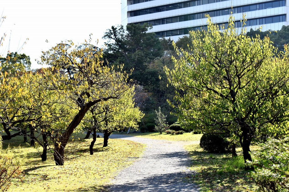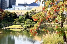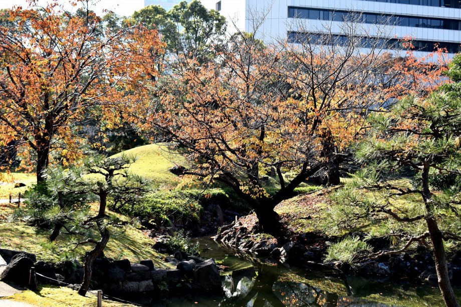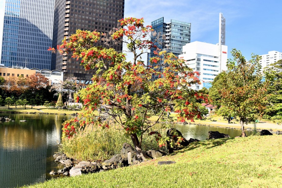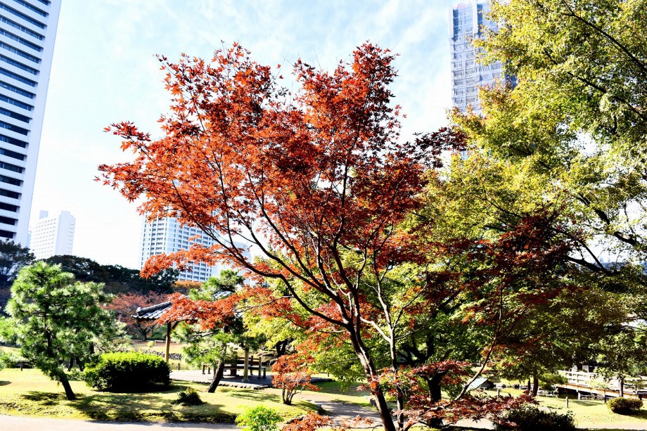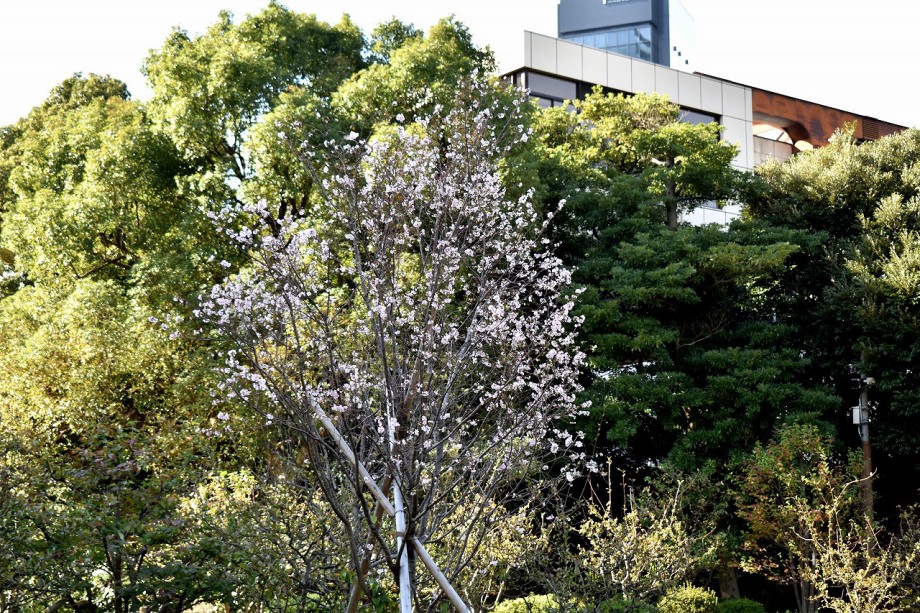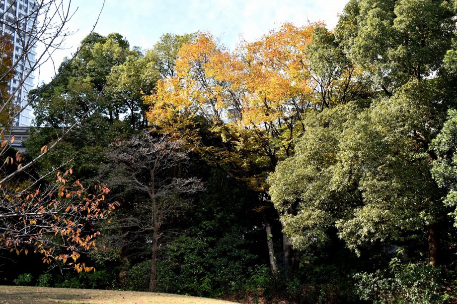 「一言」旧芝離宮に行きました。モミジの紅葉は始まったところという状況ですが、木々の葉が茶色に変わっていて陽射しに当たると 輝いていて秋の感じがしました。十月桜は満開できれいでした。モチツツジが白い花を付けていました。入り口の近くの桔梗が 一輪だけが咲いていました。旧芝離宮の横の公園の大きな木が黄葉して輝いていて綺麗でした。