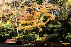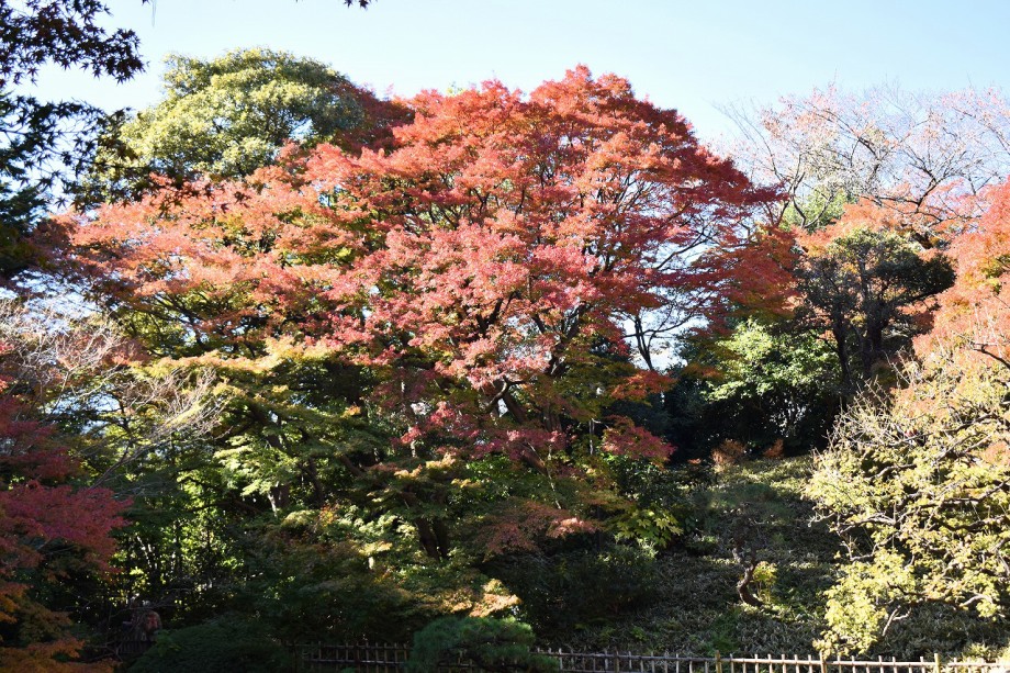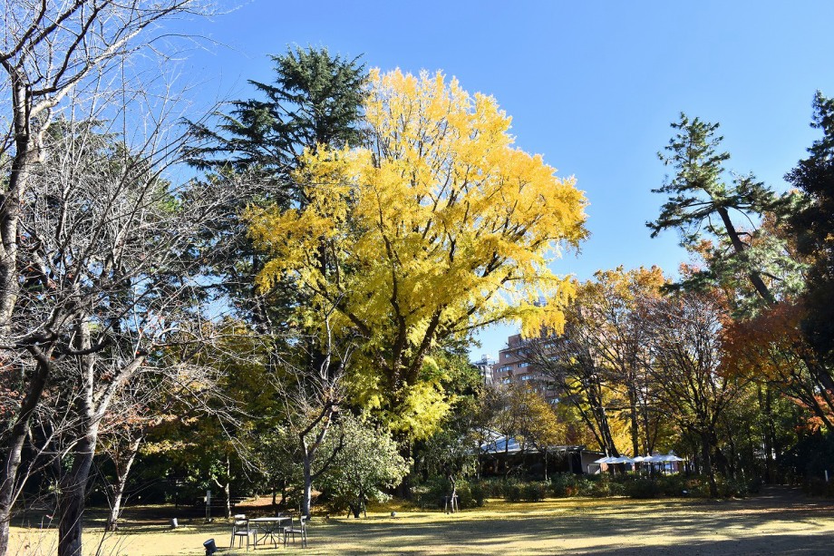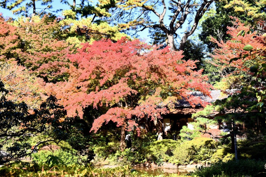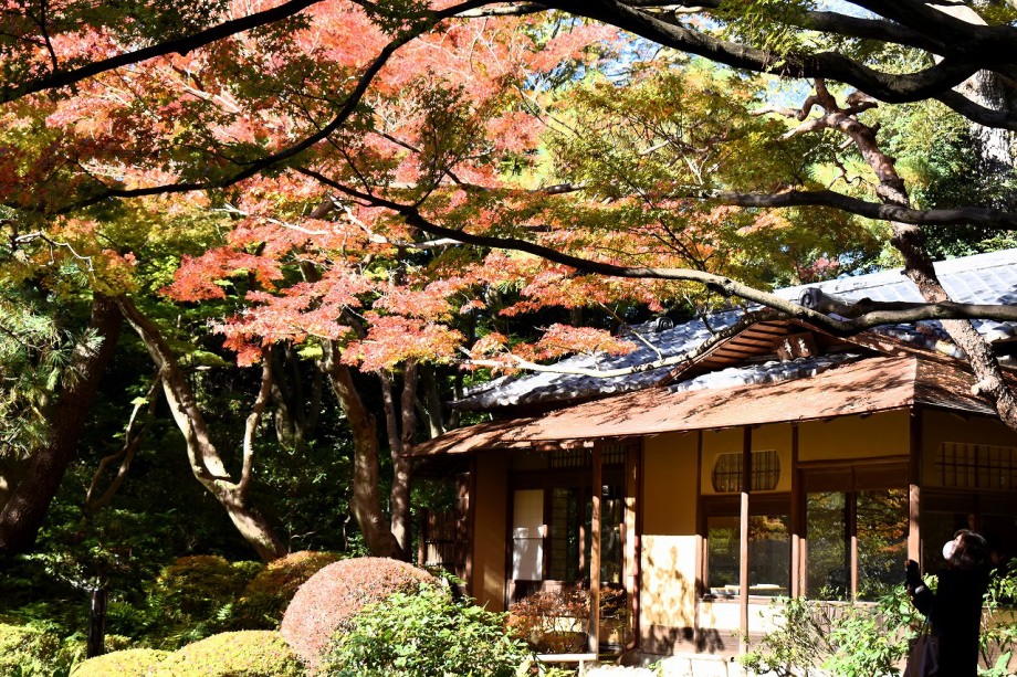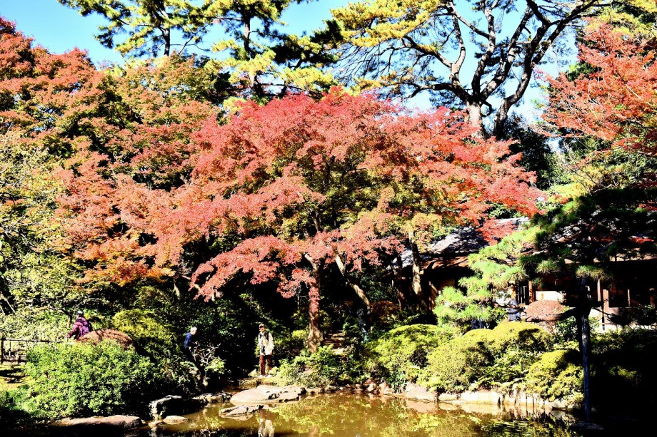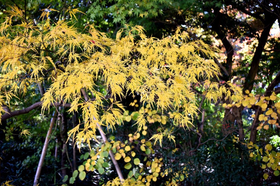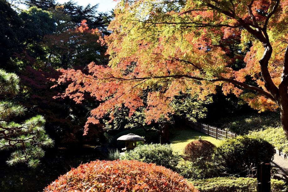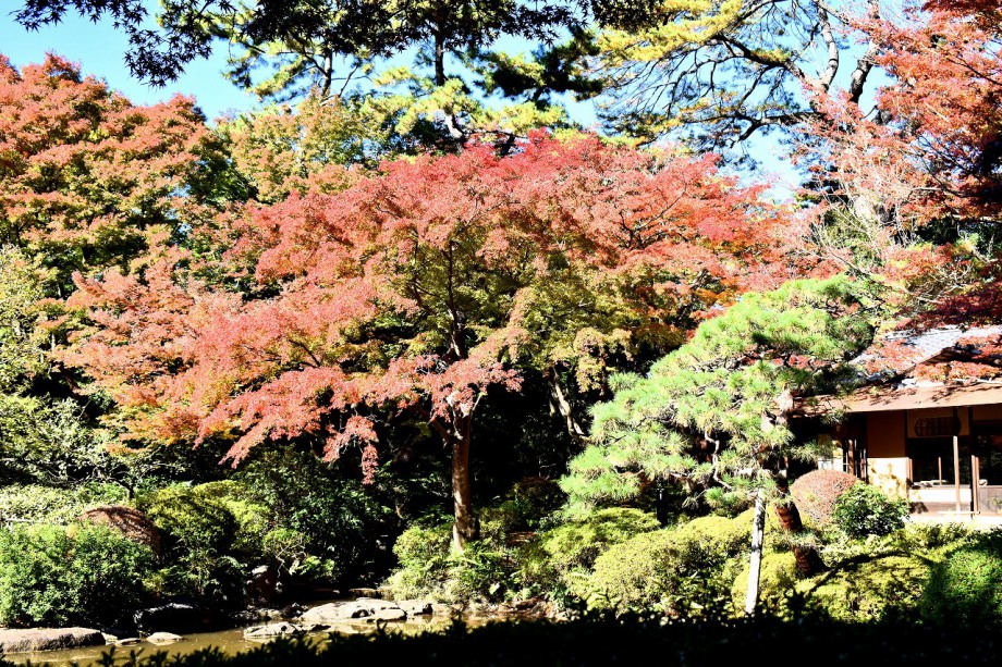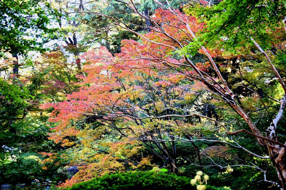 「一言」東京都庭園美術館の日本庭園のモミジが紅葉しています。こじんまりした日本庭園ですが紅葉が雰囲気を良くしていて綺麗です。 西洋庭園の大きなイチョウは黄葉していました。大きな柿の木に柿の実がたくさん実っていてメジロがたくさん飛んできていて柿の実 と啄んでいました。帰りの苔の上の散ったモミジが面白い感じがした。