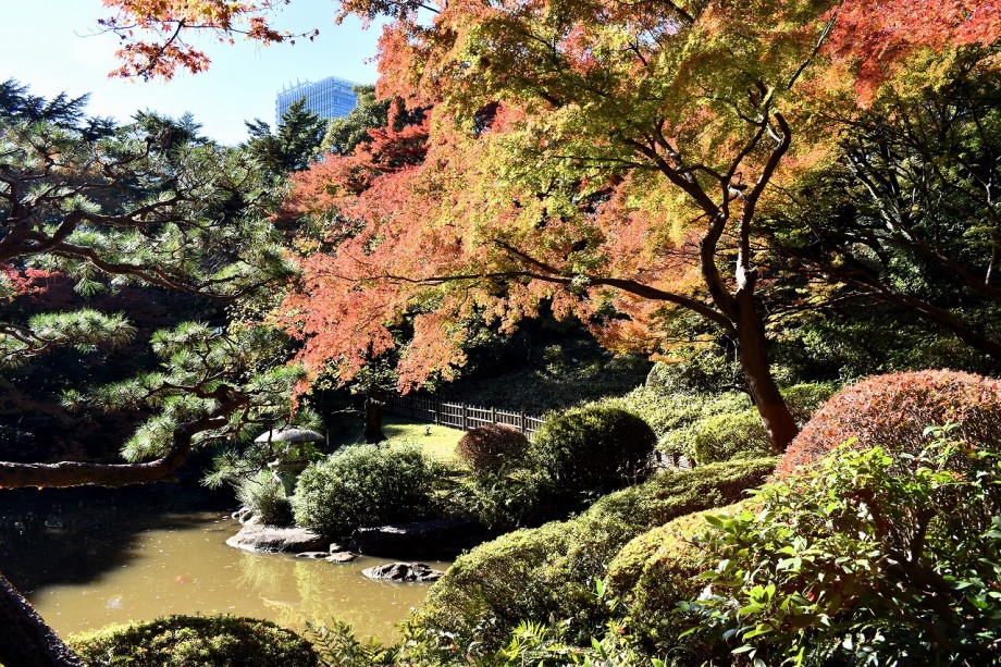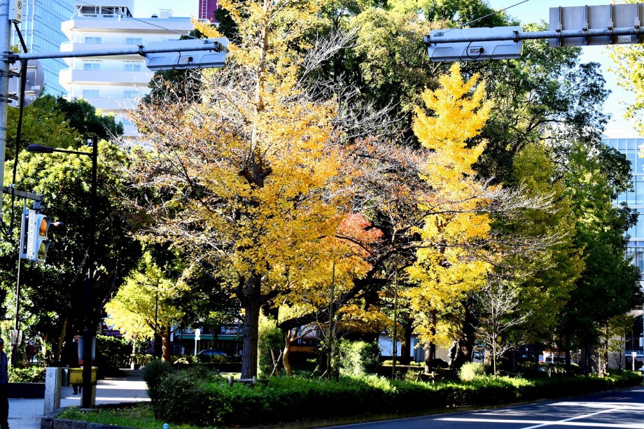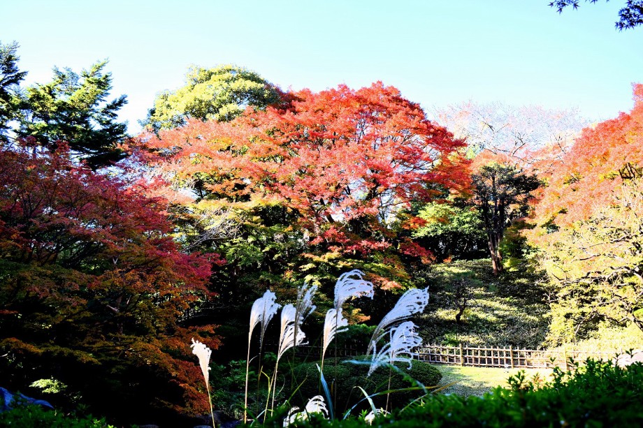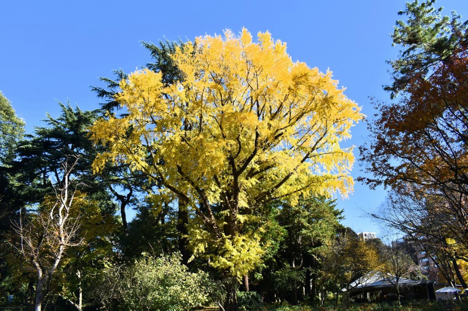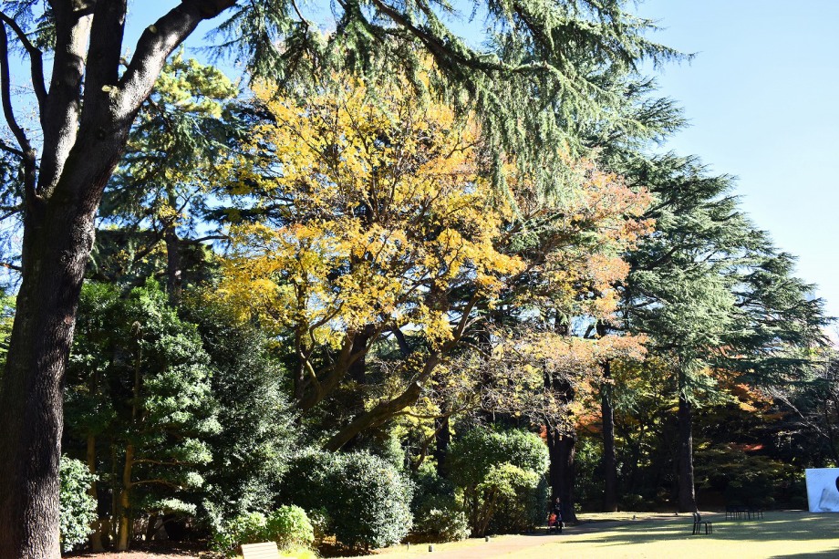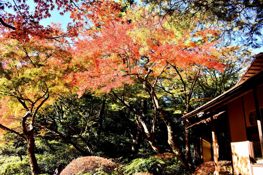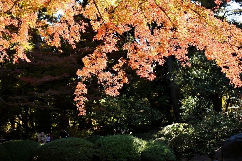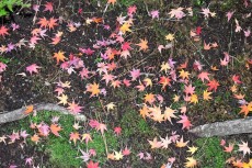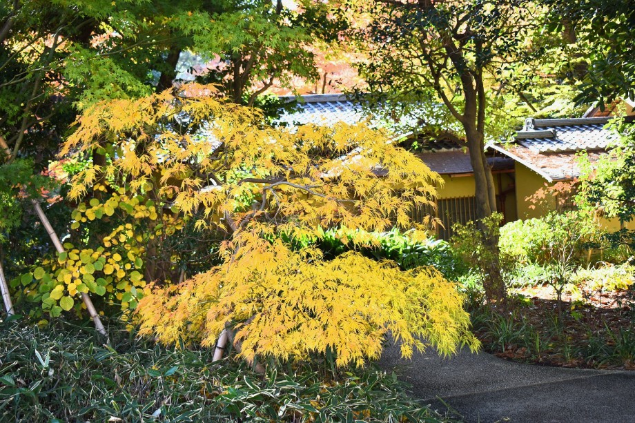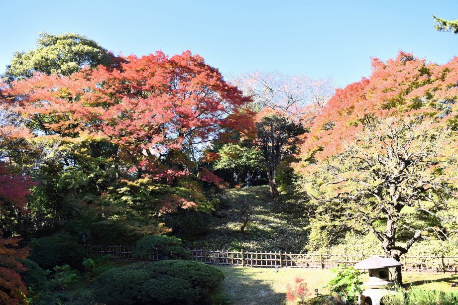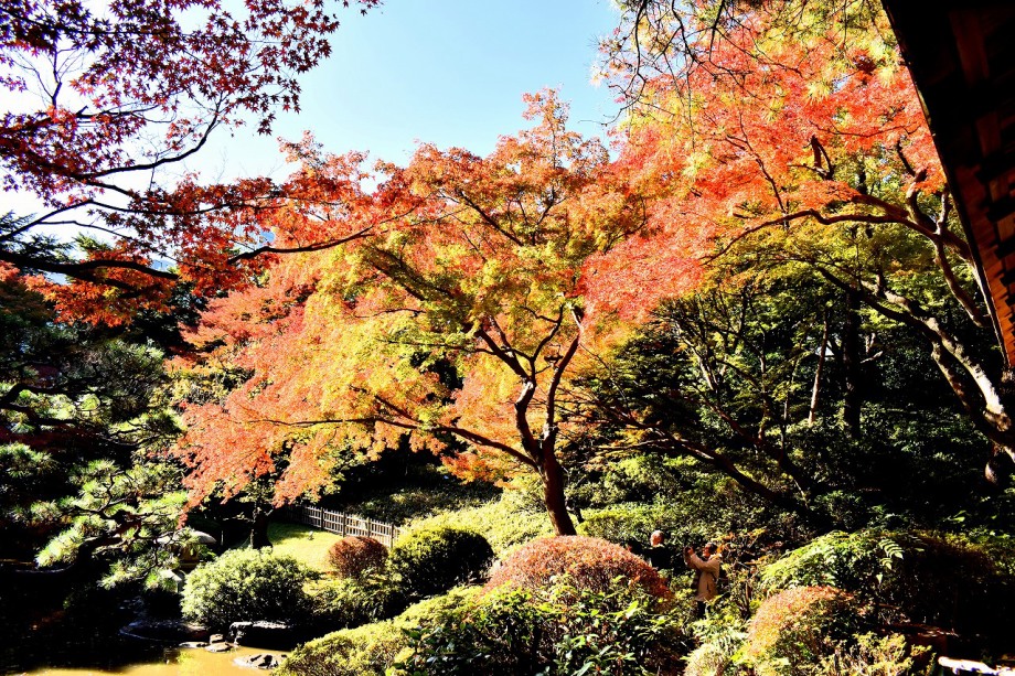 「一言」東京都庭園美術館の日本庭園のモミジが紅葉しています。こじんまりした日本庭園ですが紅葉が雰囲気を良くしていて綺麗です。 西洋庭園の大きなイチョウは黄葉していました。大きな柿の木に柿の実がたくさん実っていてメジロがたくさん飛んできていて柿の実 と啄んでいました。帰りの苔の上の散ったモミジが面白い感じがした。