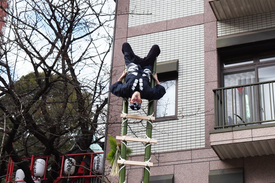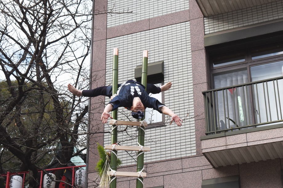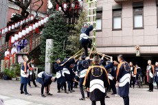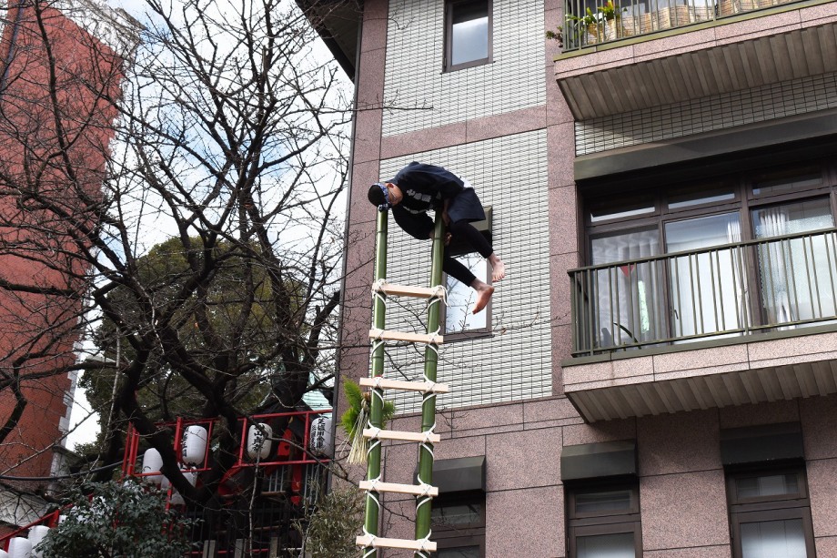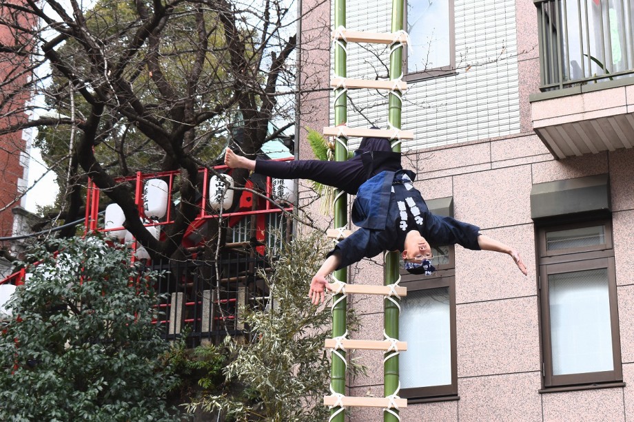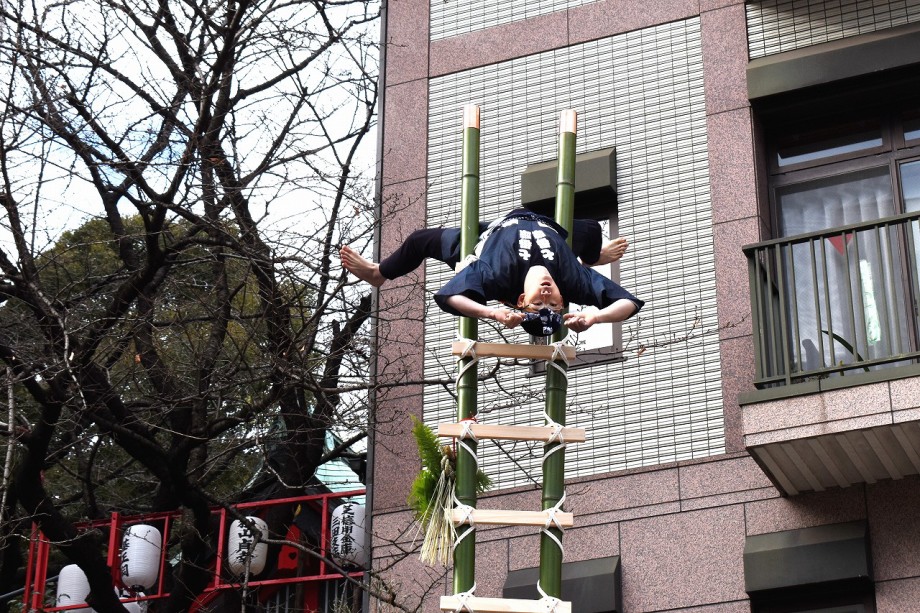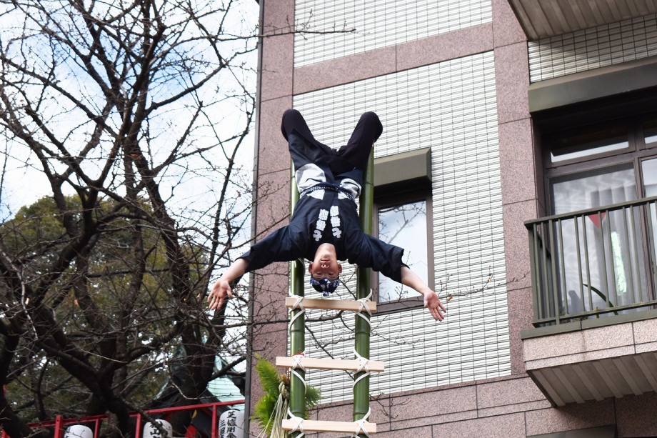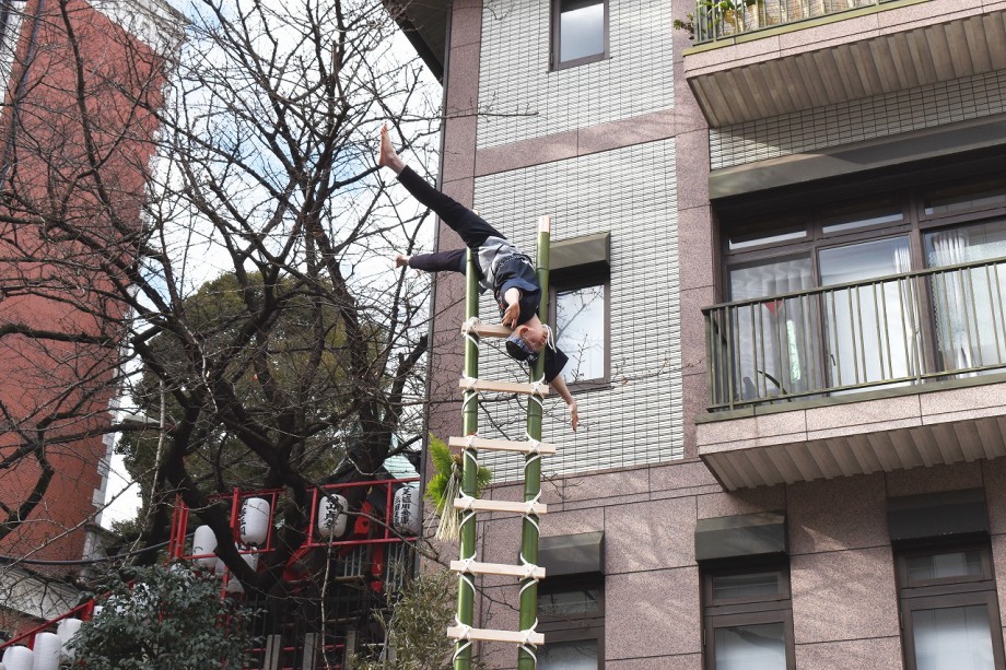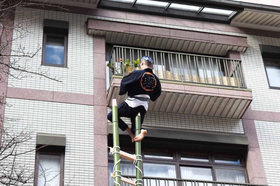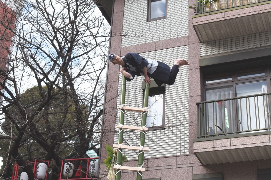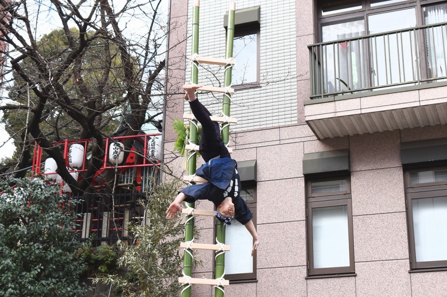 半纏を着た人達がトビ口で梯子を支え、梯子に上って色々な演技をしていましたので写真を撮りました。