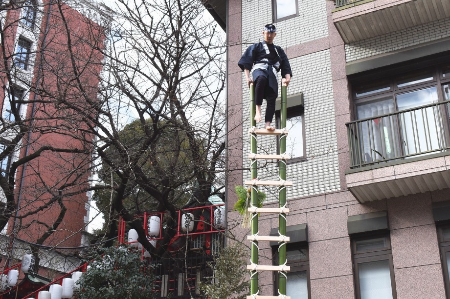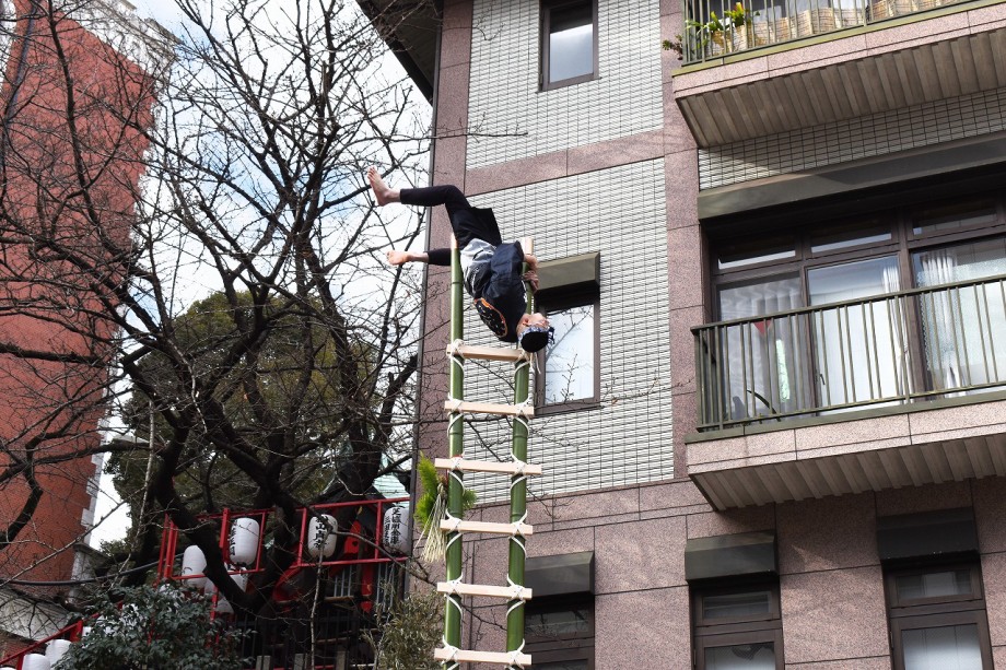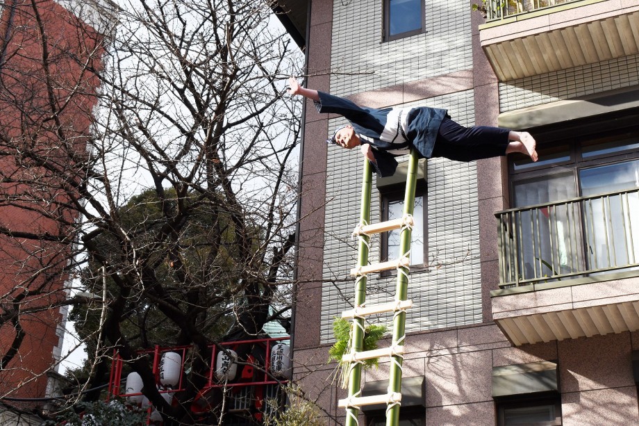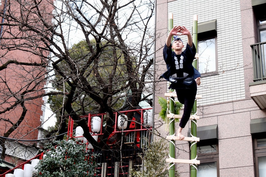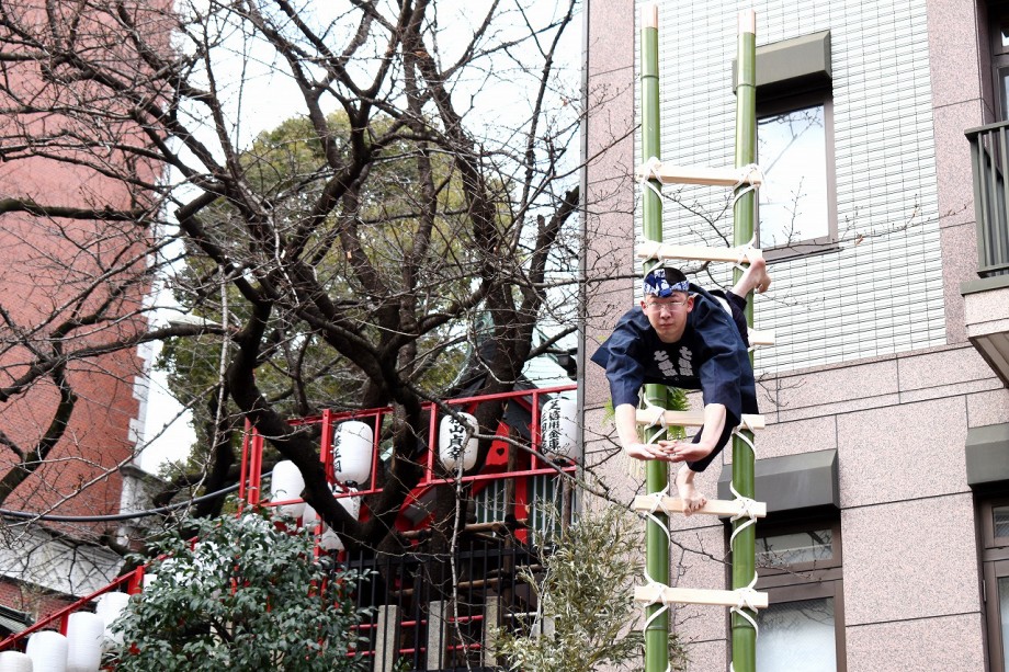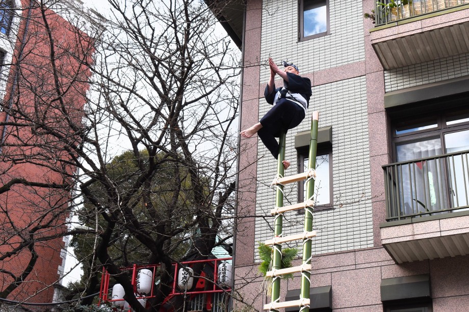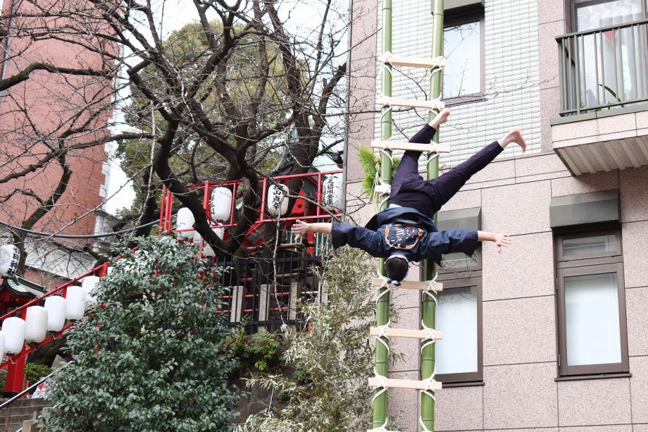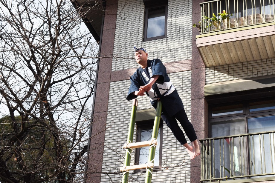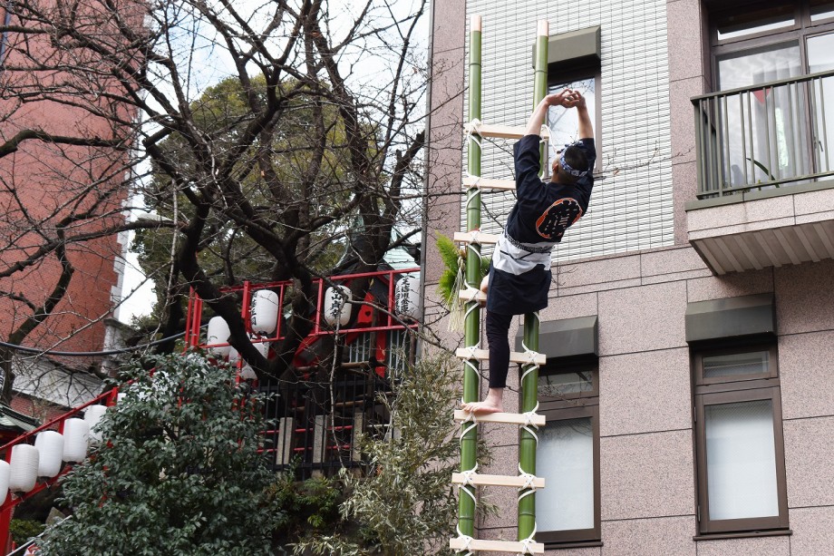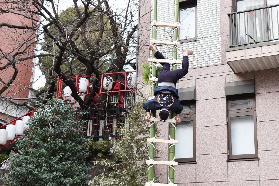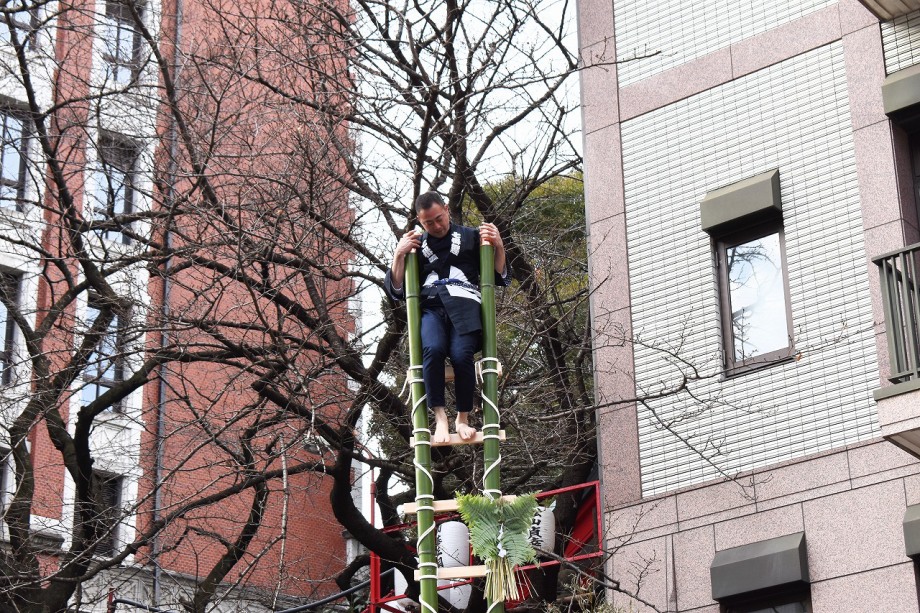 半纏を着た人達がトビ口で梯子を支え、梯子に上って色々な演技をしていましたので写真を撮りました。