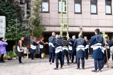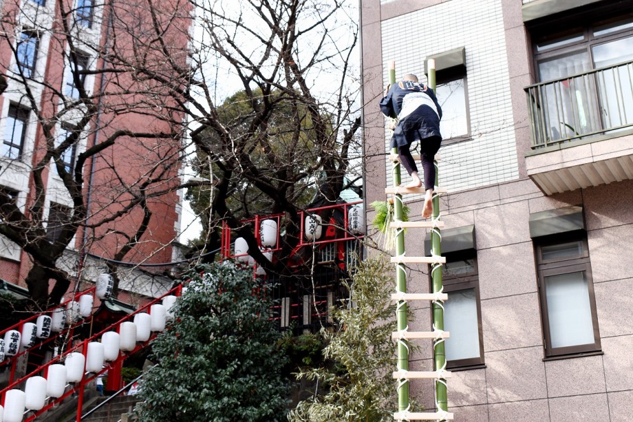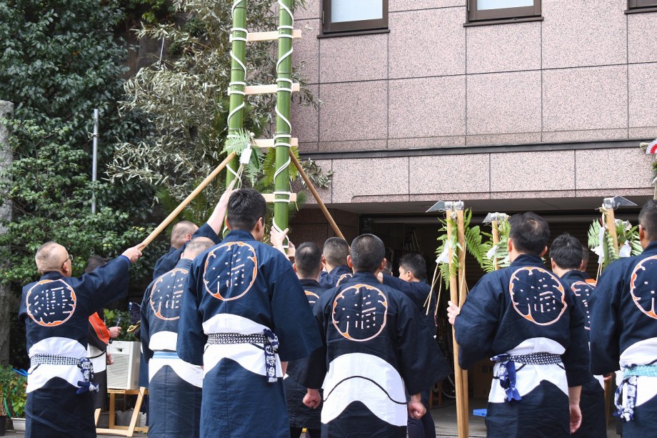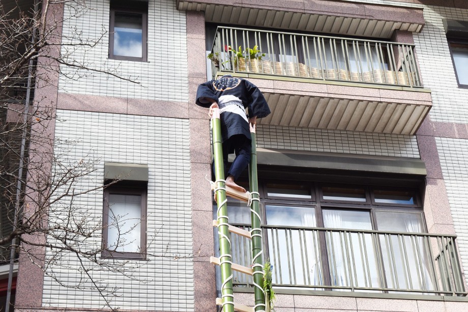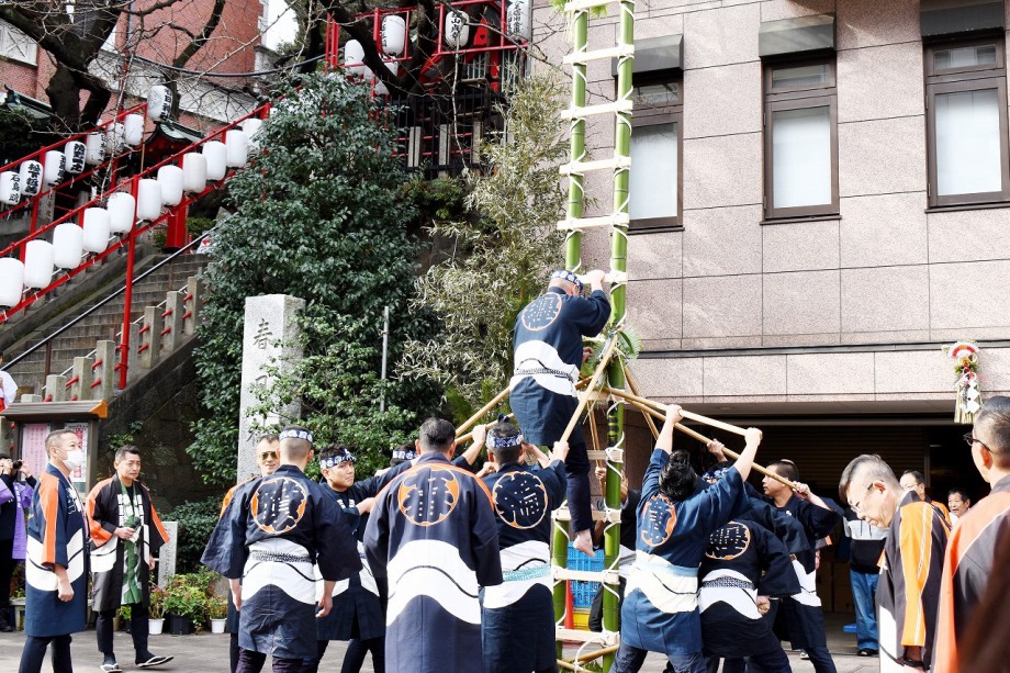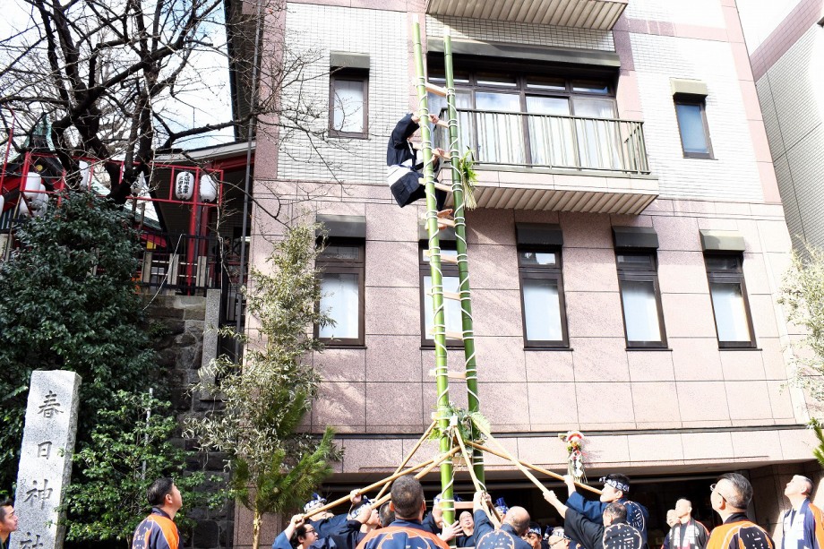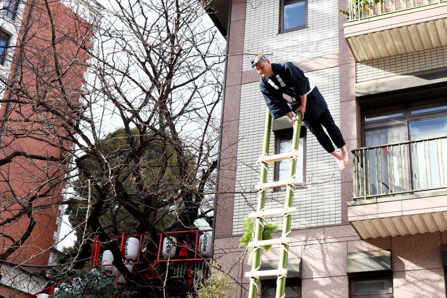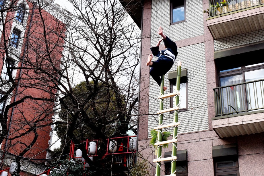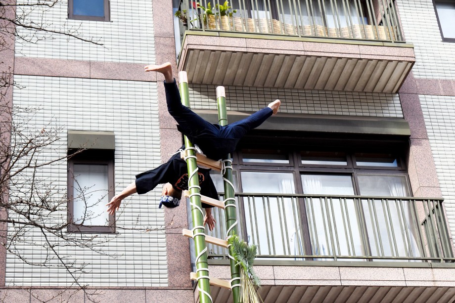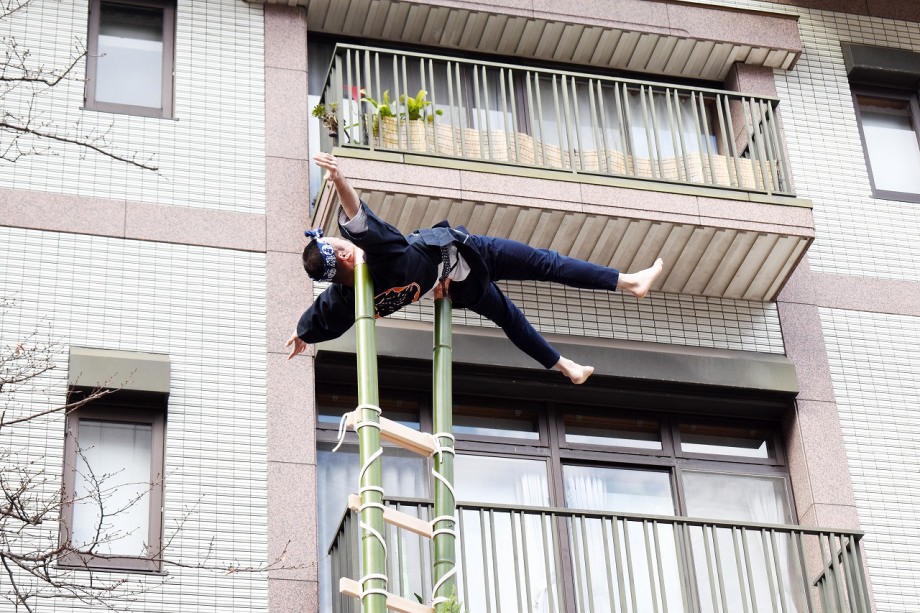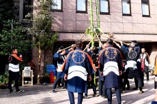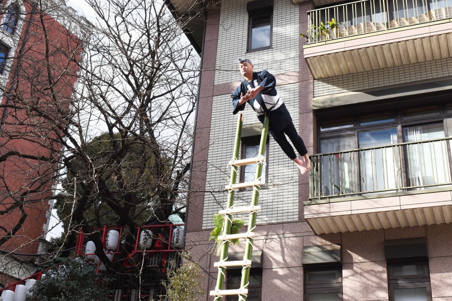 半纏を着た人達がトビ口で梯子を支え、梯子に上って色々な演技をしていましたので写真を撮りました。