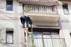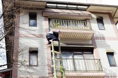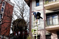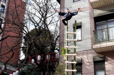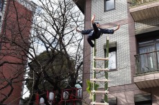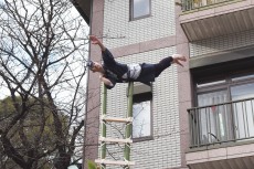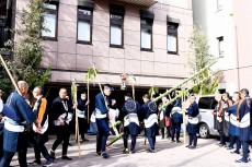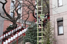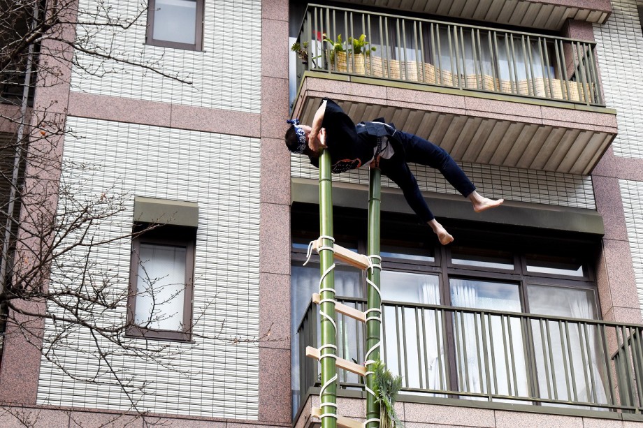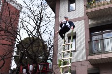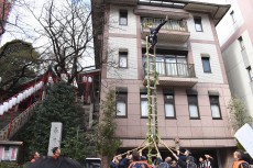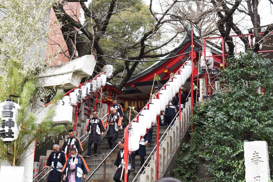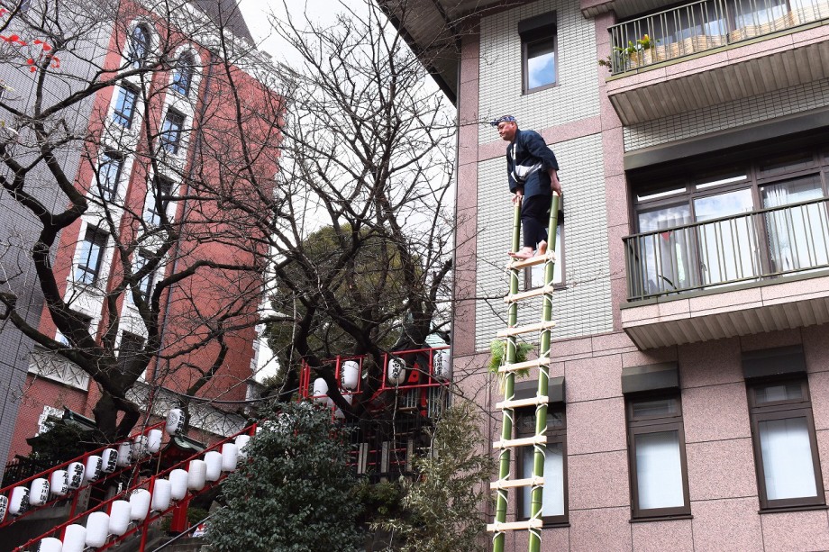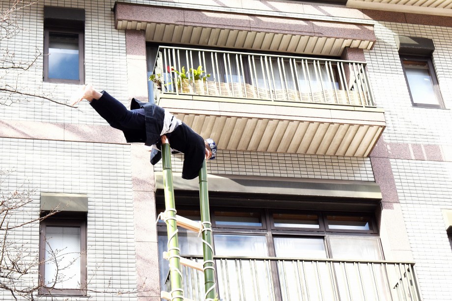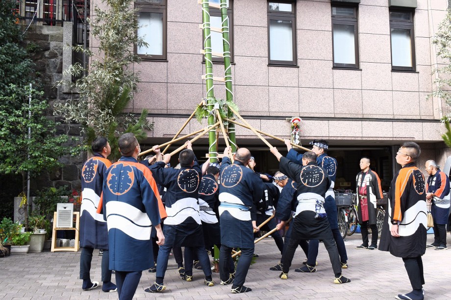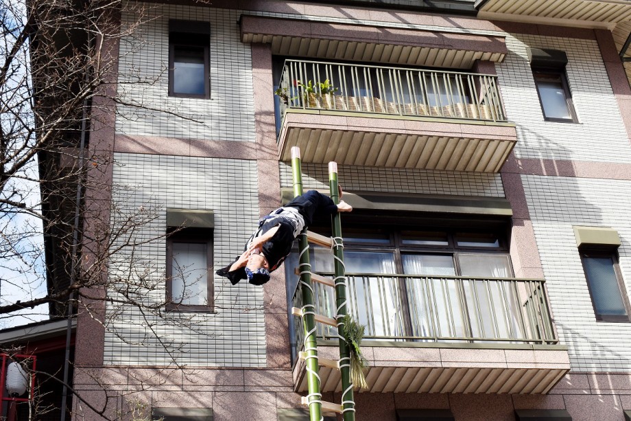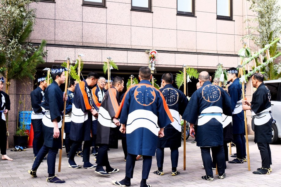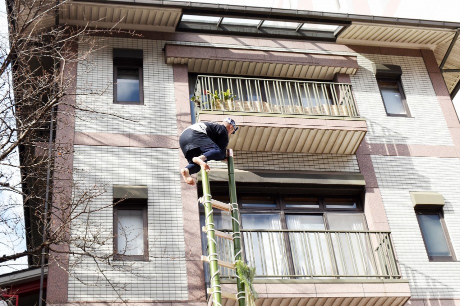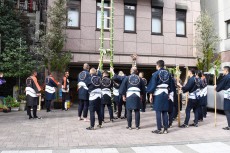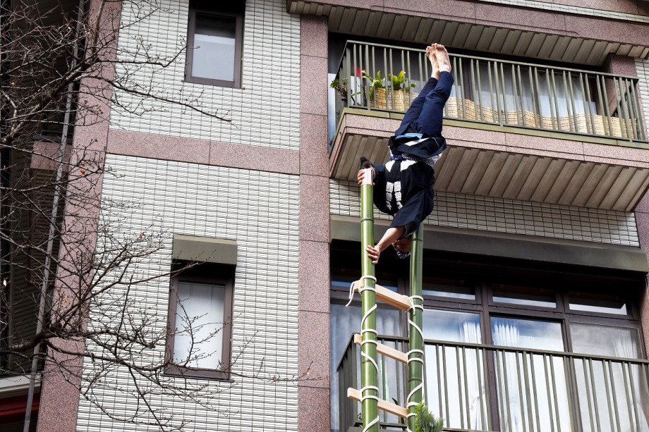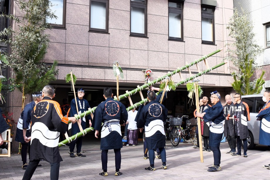 半纏を着た人達がトビ口で梯子を支え、梯子に上って色々な演技をしていましたので写真を撮りました。
