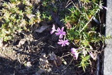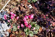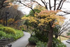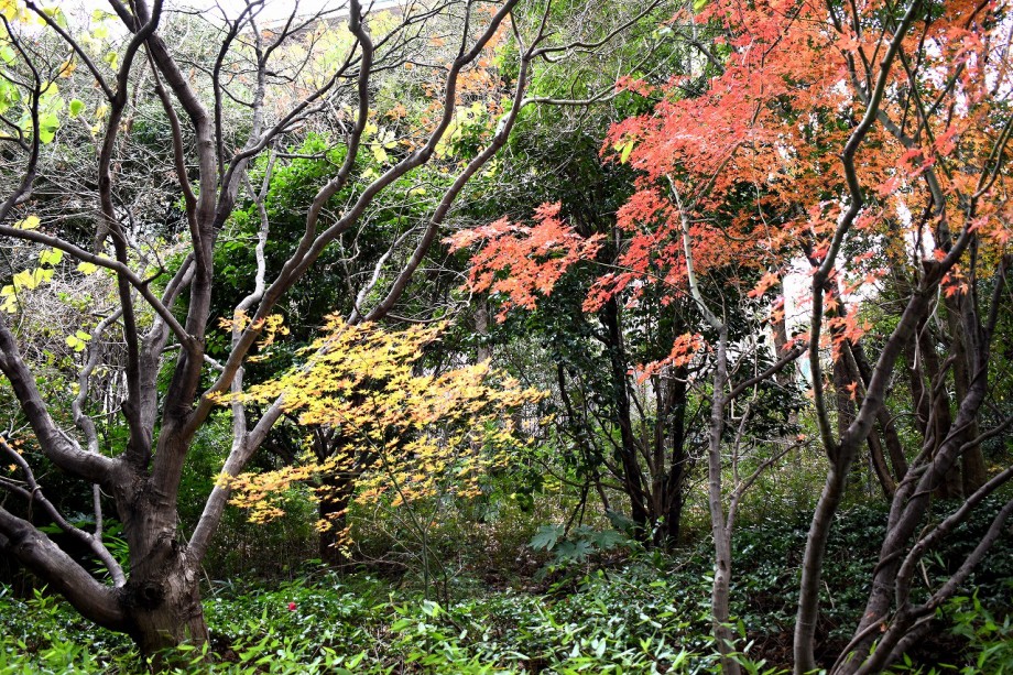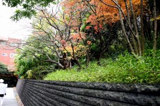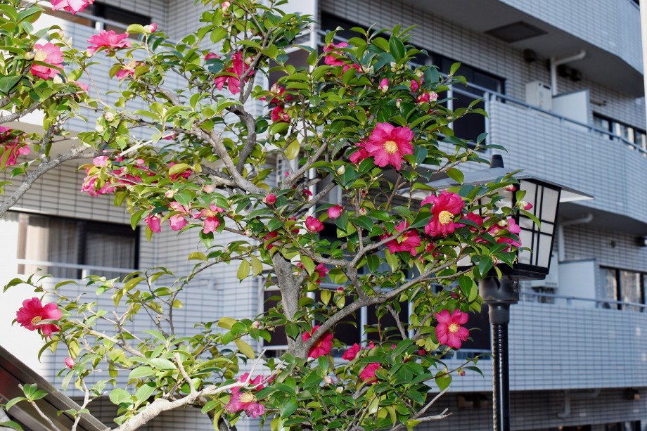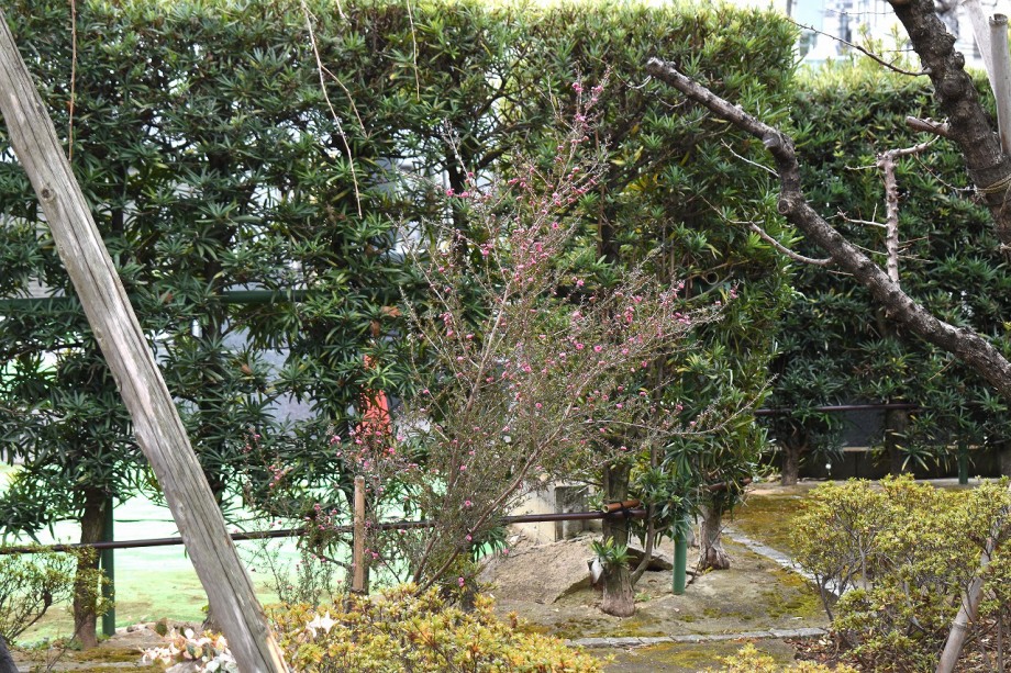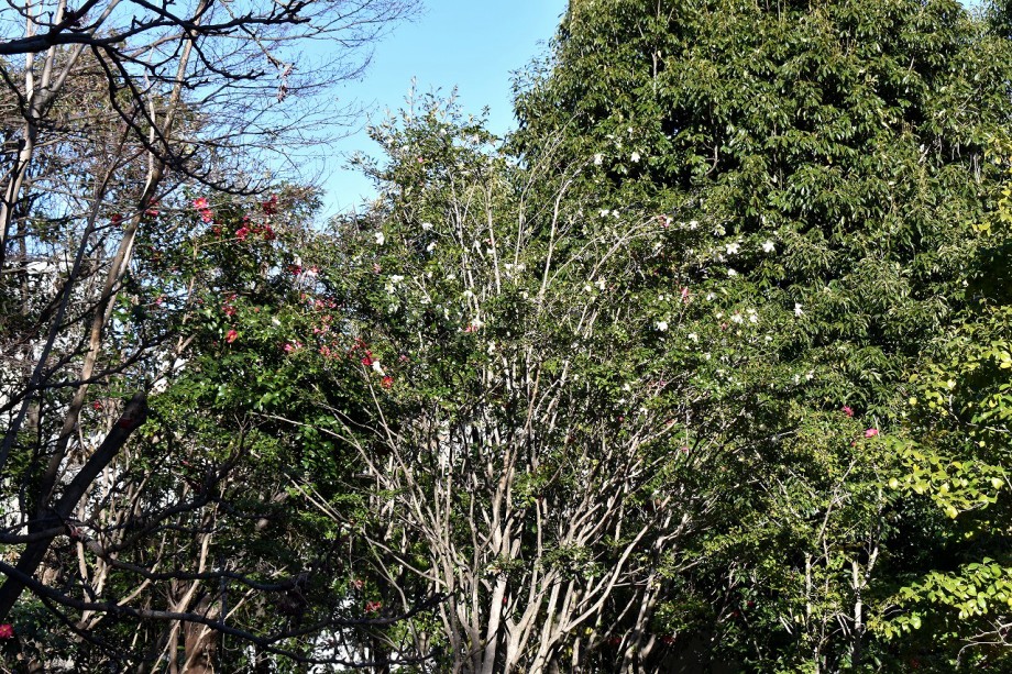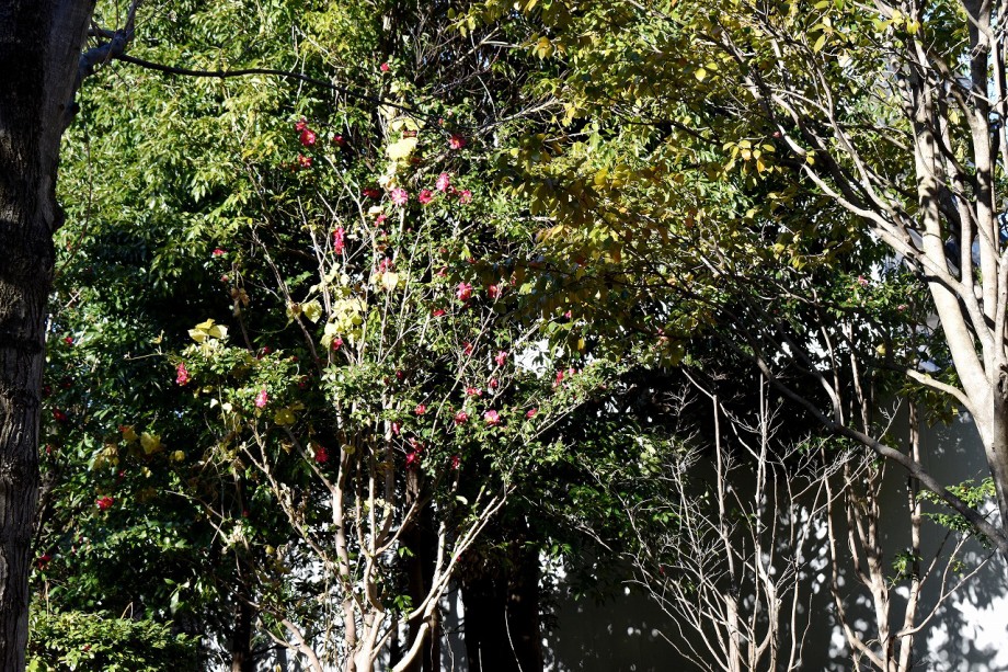 いました。また、ピンク色の小さい花も咲いていました。札ノ辻のビルの裏には紅葉がまだ残っていました。大きな紅白の椿に花が咲いていました。桜草のような