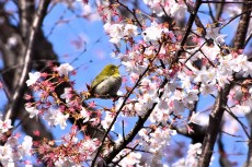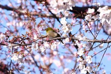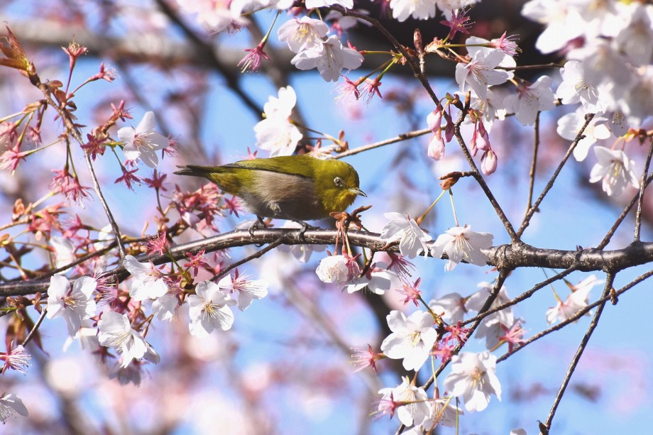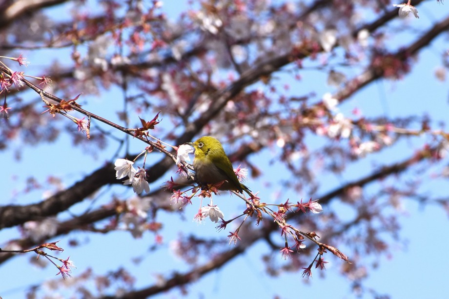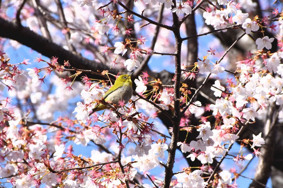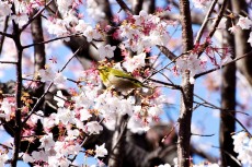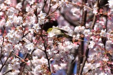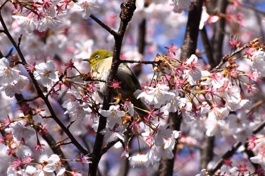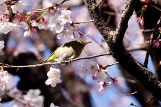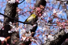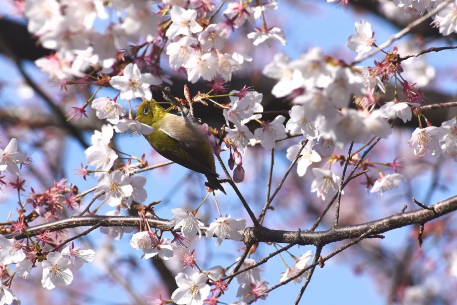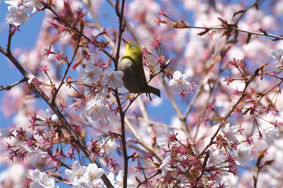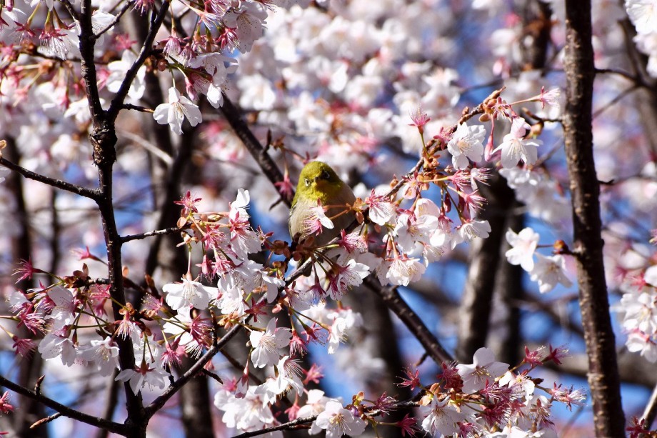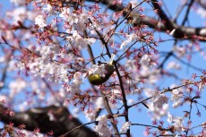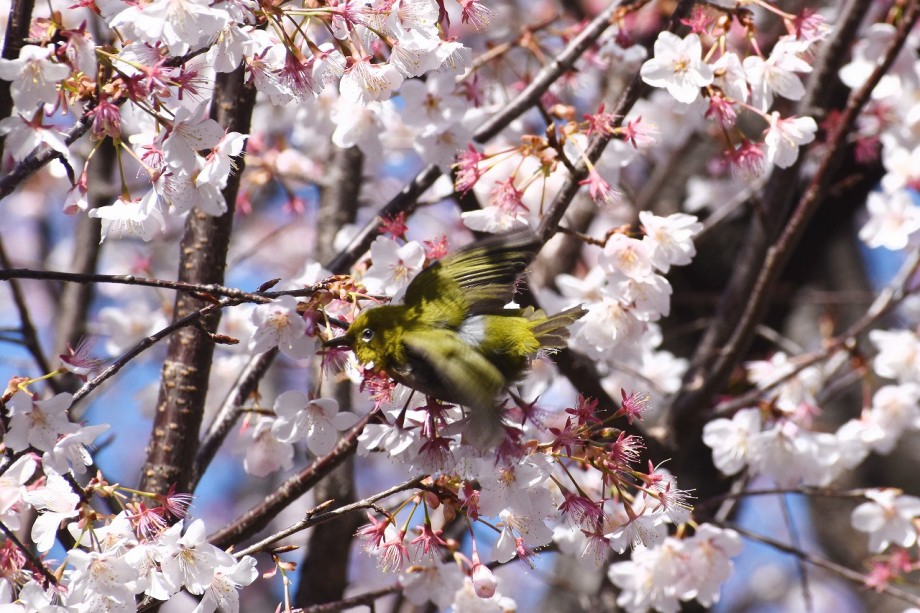「一言」実相寺の早咲き桜が散り始めていますが、メジロやムクドリがたくさん飛んできています。メジロは非常にたくさん桜の木にきて 桜の花を啄んでいます。ムクドリは木の上の方にとまりますので、なかなか写真が撮れませんでした。そのため、メジロを中心 に撮りました。実相寺には椿がいっぱい咲いていました。定林寺いは紅梅、白梅が見頃です。明王院にしだれの梅が咲いています。