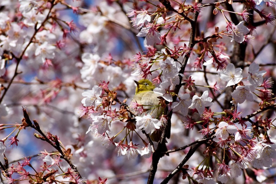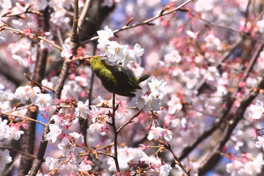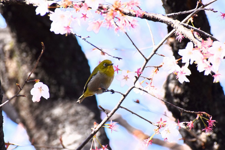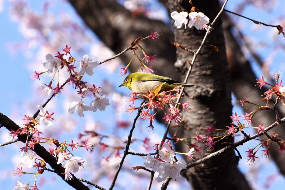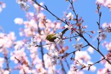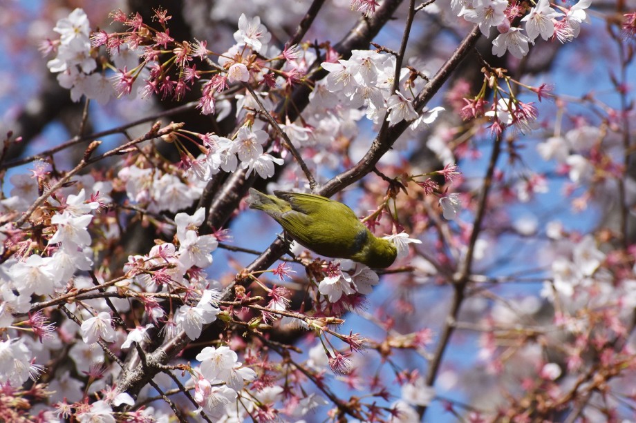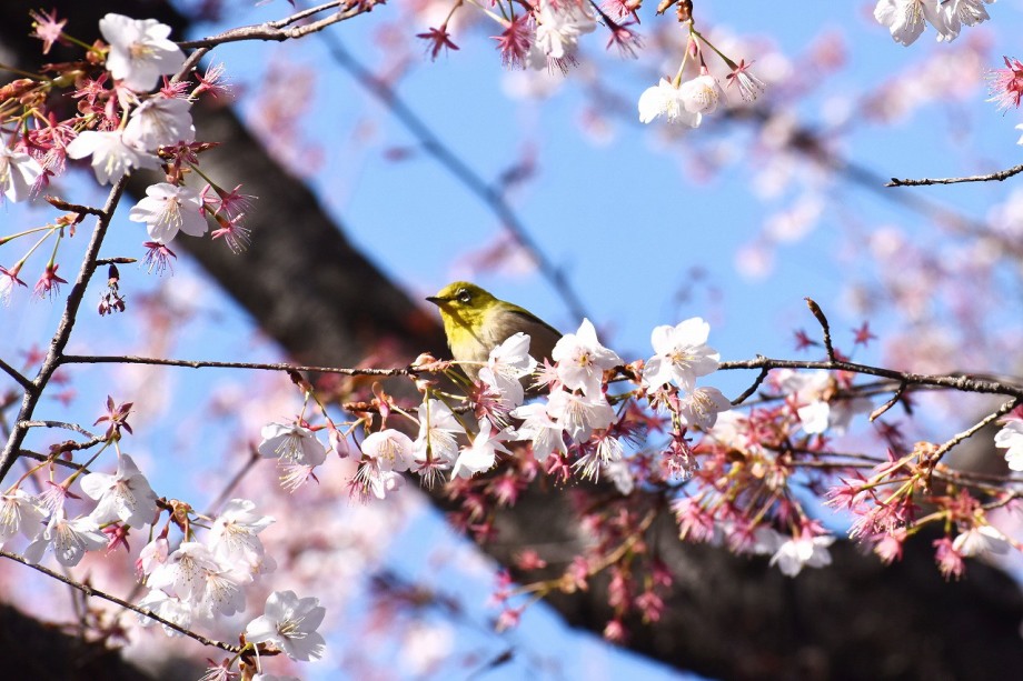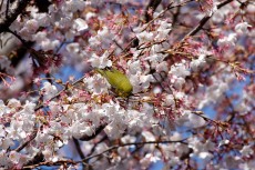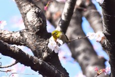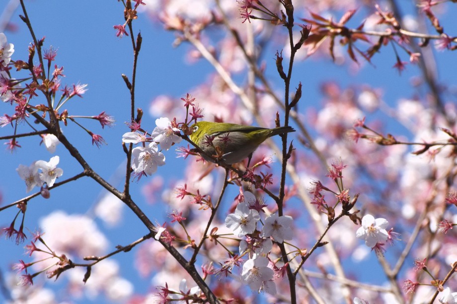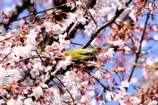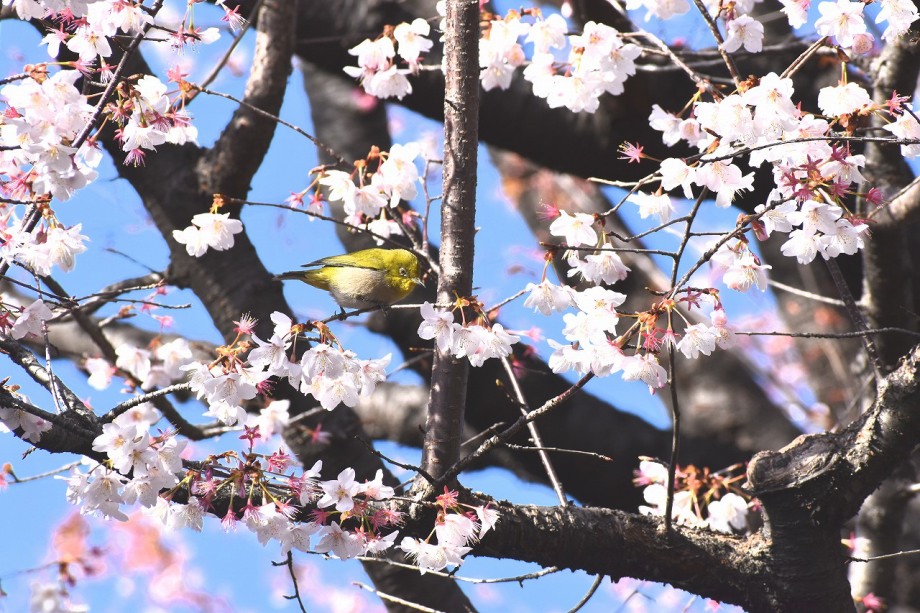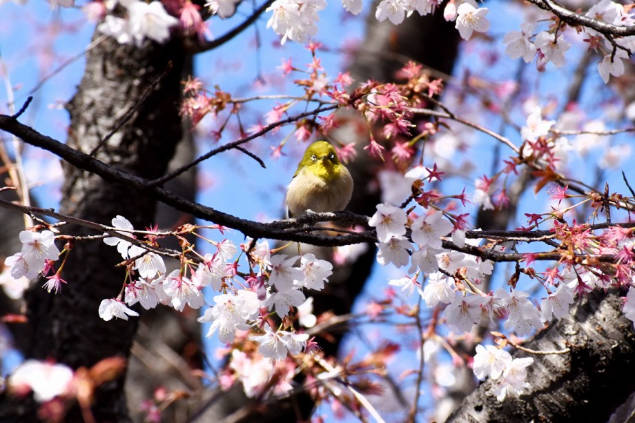 「一言」実相寺の早咲き桜が散り始めていますが、メジロやムクドリがたくさん飛んできています。メジロは非常にたくさん桜の木にきて 桜の花を啄んでいます。ムクドリは木の上の方にとまりますので、なかなか写真が撮れませんでした。そのため、メジロを中心 に撮りました。実相寺には椿がいっぱい咲いていました。定林寺いは紅梅、白梅が見頃です。明王院にしだれの梅が咲いています。
