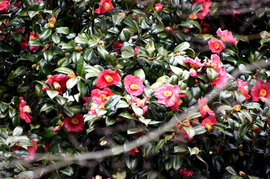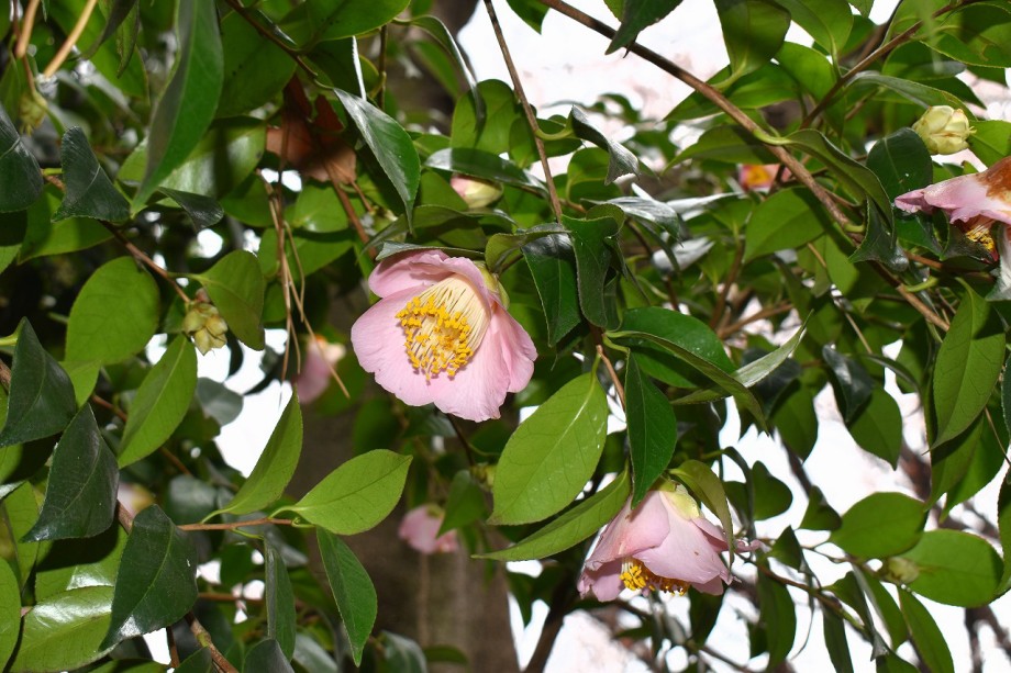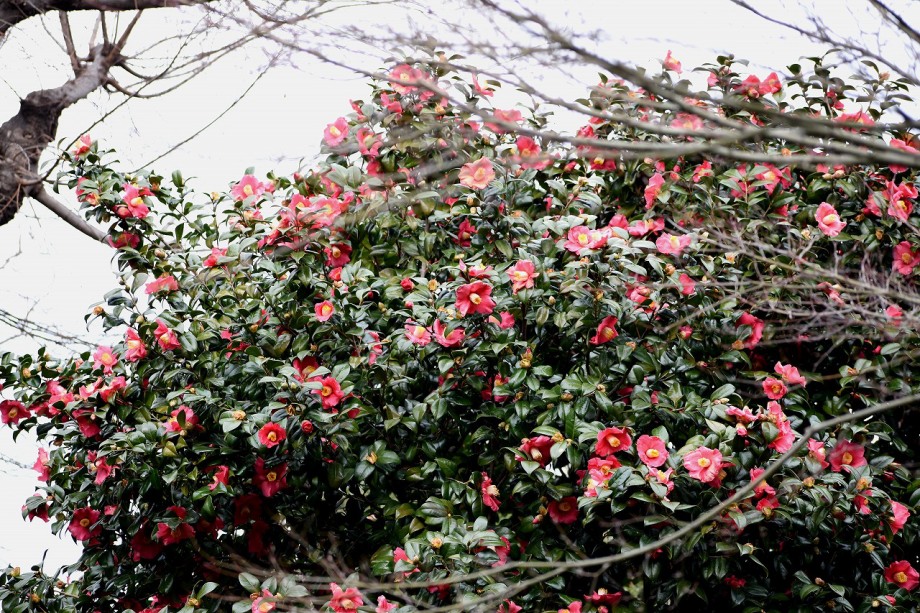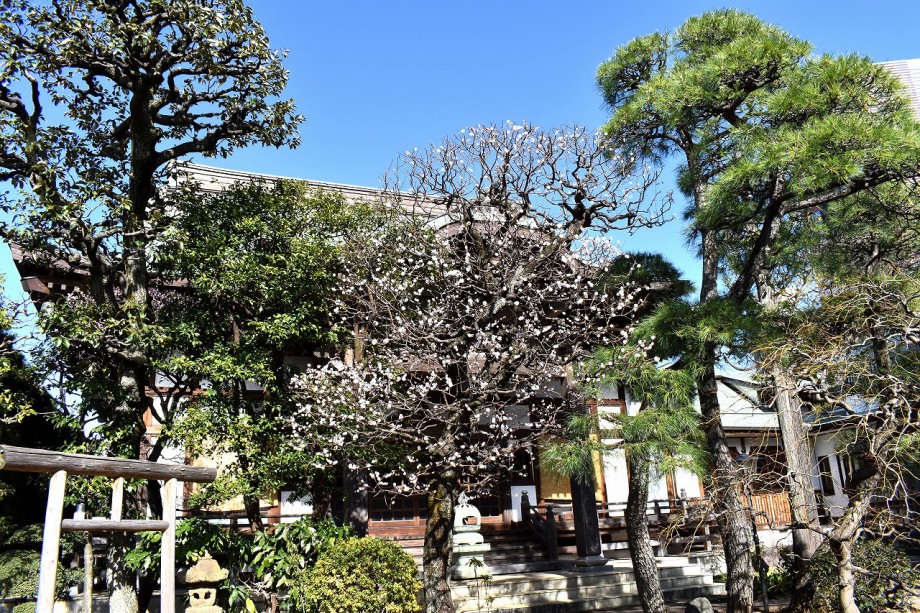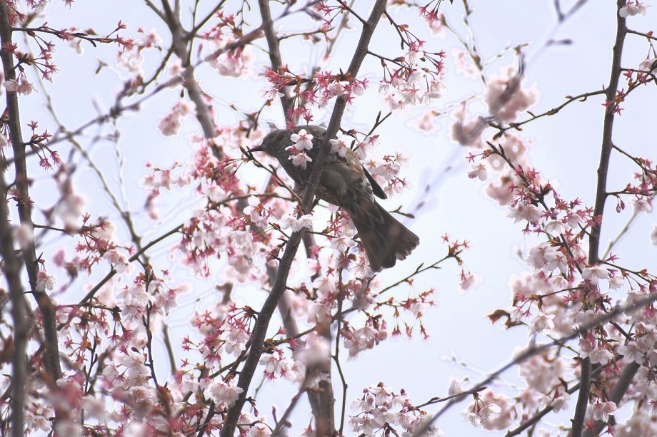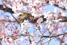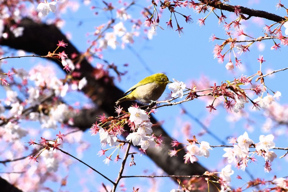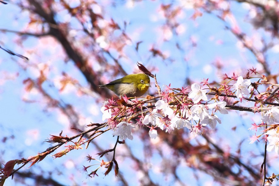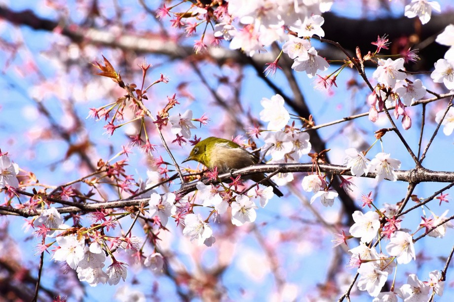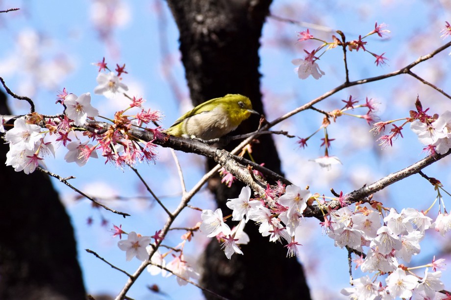 「一言」実相寺の早咲き桜が散り始めていますが、メジロやムクドリがたくさん飛んできています。メジロは非常にたくさん桜の木にきて 桜の花を啄んでいます。ムクドリは木の上の方にとまりますので、なかなか写真が撮れませんでした。そのため、メジロを中心 に撮りました。実相寺には椿がいっぱい咲いていました。定林寺いは紅梅、白梅が見頃です。明王院にしだれの梅が咲いています。