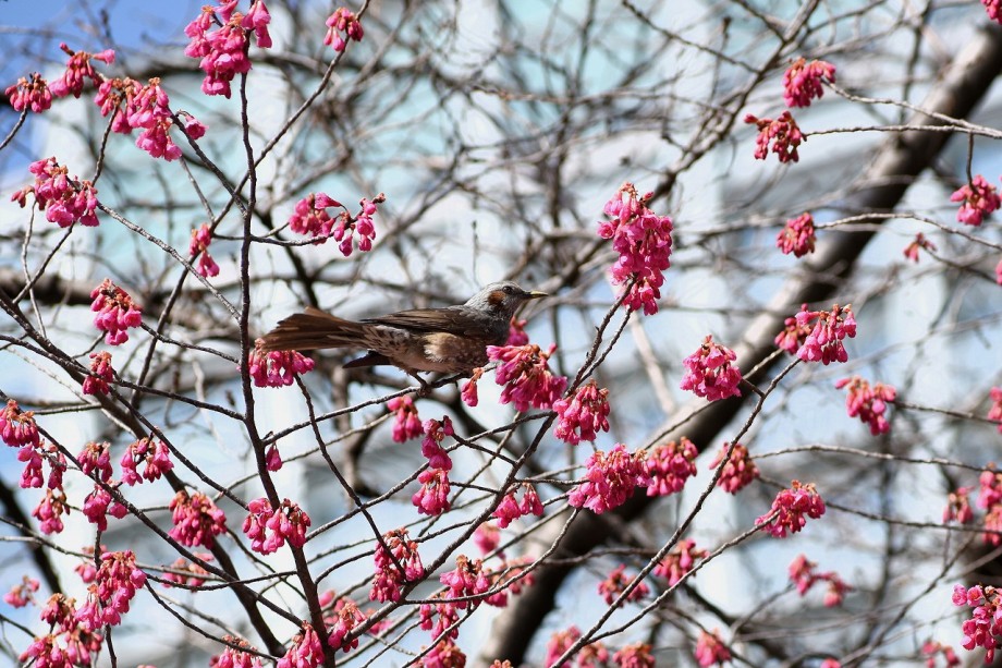 「一言」芝東照宮の寒緋桜が咲き出しました。真っ赤な花に鳥が飛んできていました。旧芝離宮には梅の花が満開です。今年は思いのまま が見当たりませんでした。十月桜や水仙がまだ咲いていました。木瓜や馬酔木も咲いています。池には鴨がたくさん飛んできていて、 色々と面白い動きをしています。