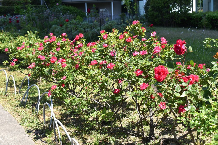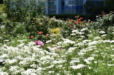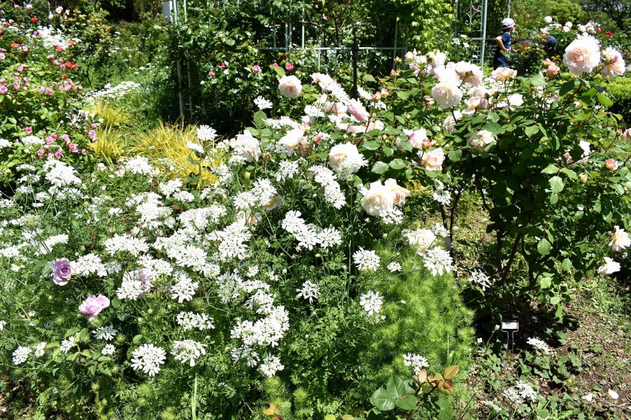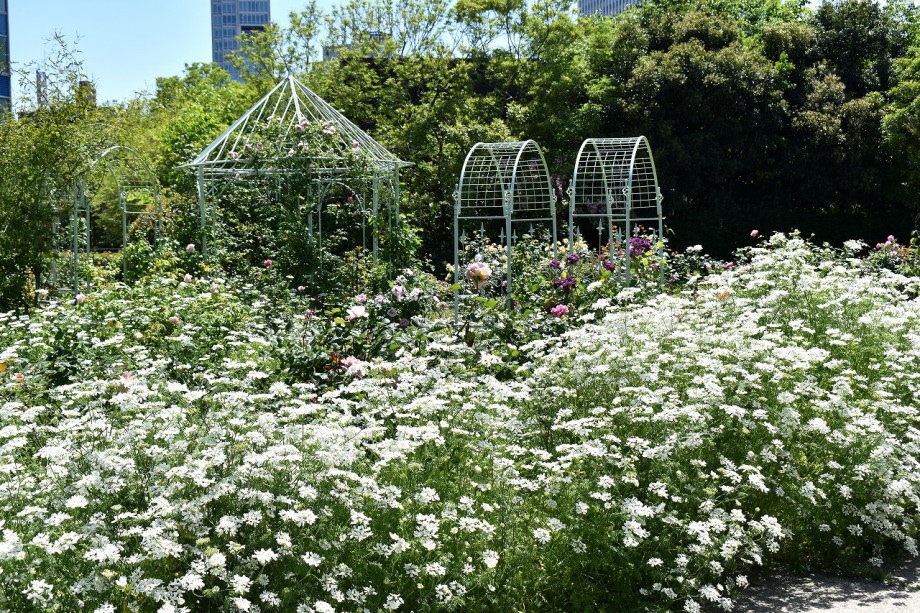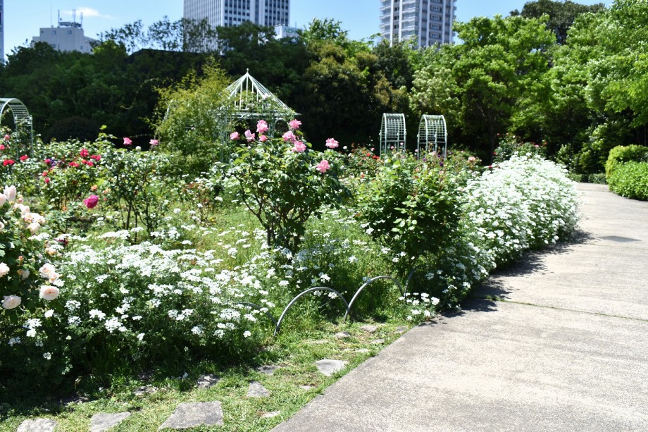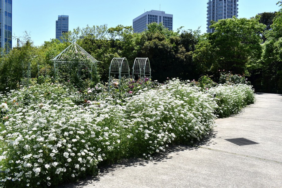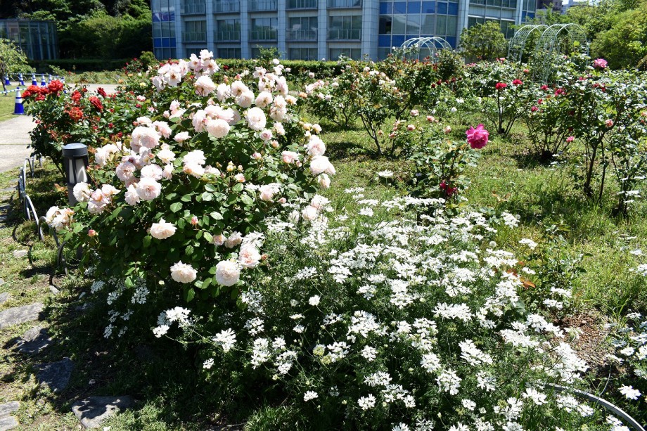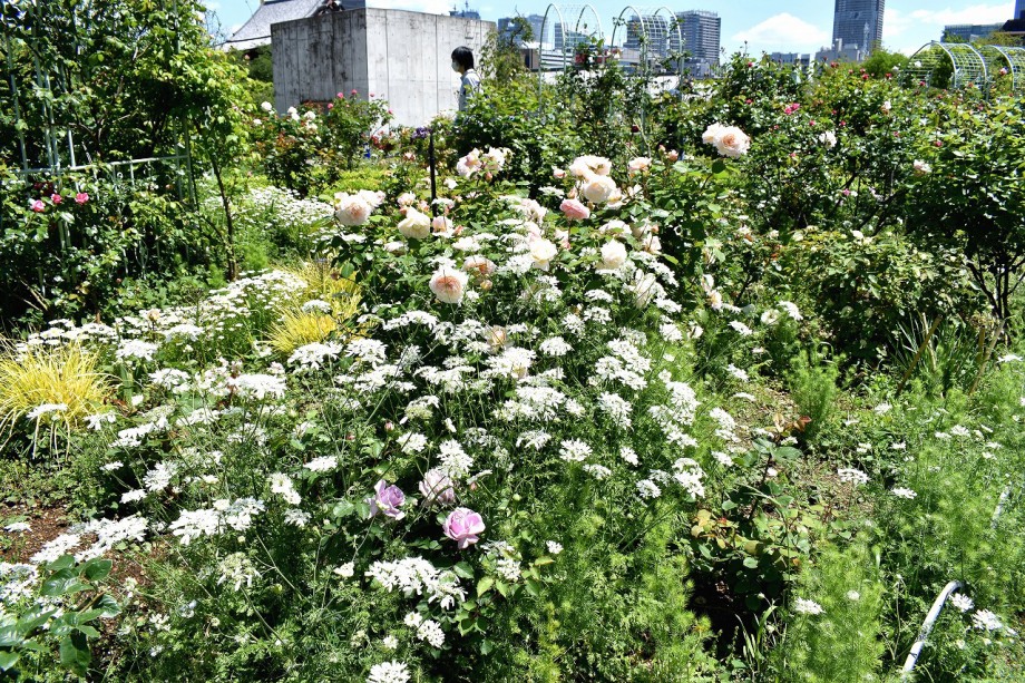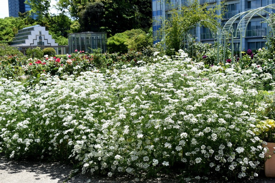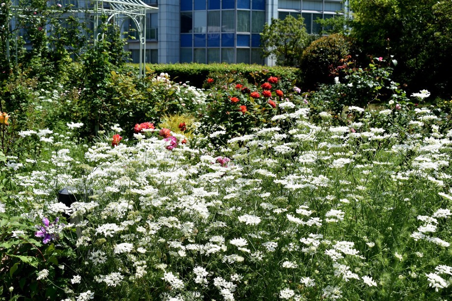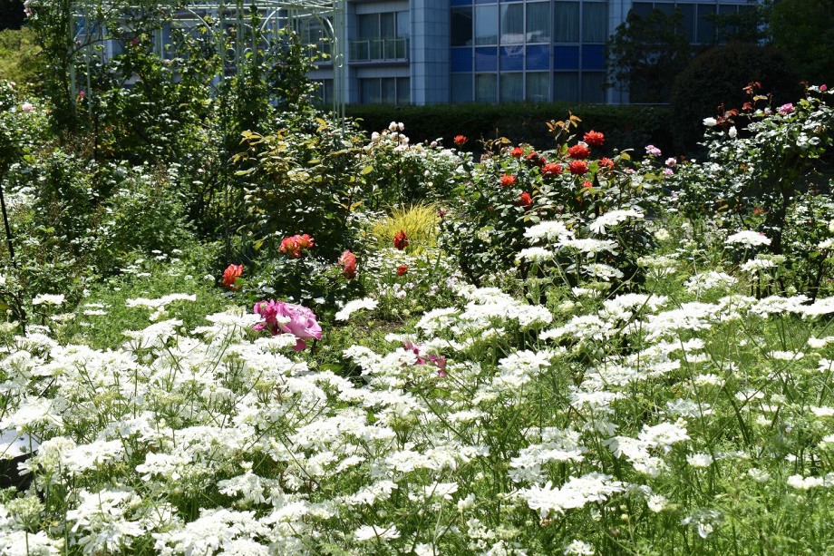 「一言」プリンス芝公園のバラが非常にたくさん咲いて綺麗になってきました。色々な色のバラの花が咲き、花の数も増えて 華やかになりました。白い色のレースフラワー?も一面に咲いていて綺麗です。写真が多いのでバラの花は別にしました。