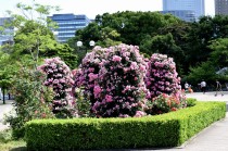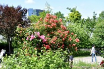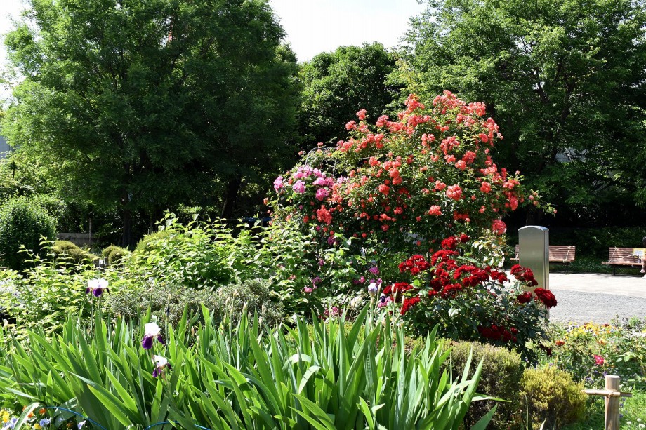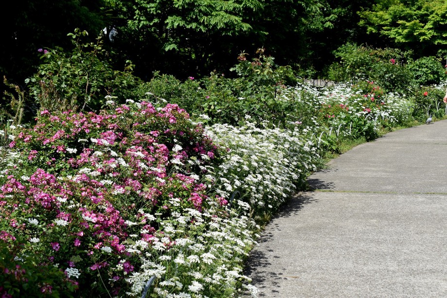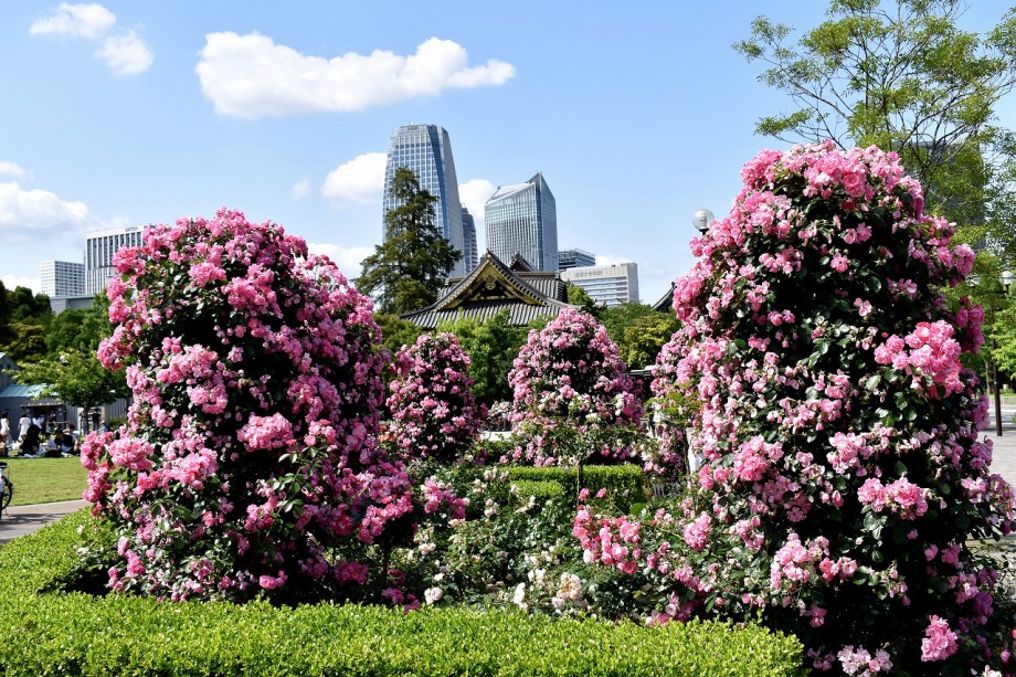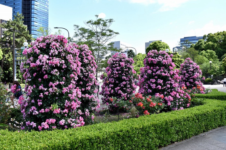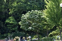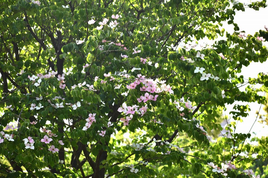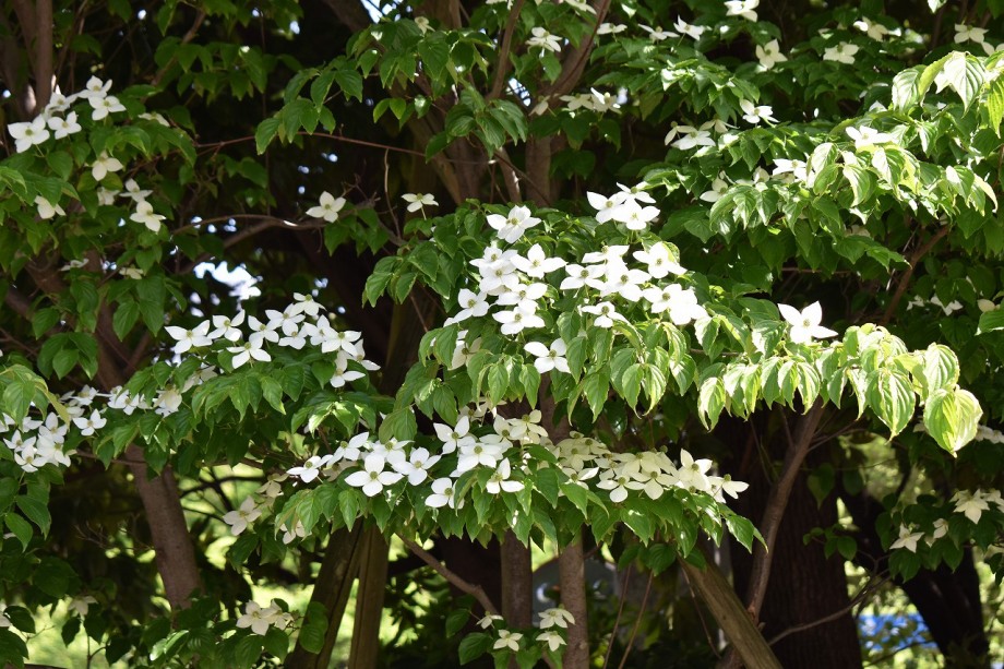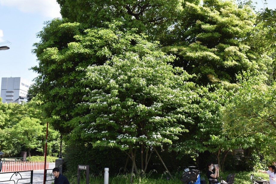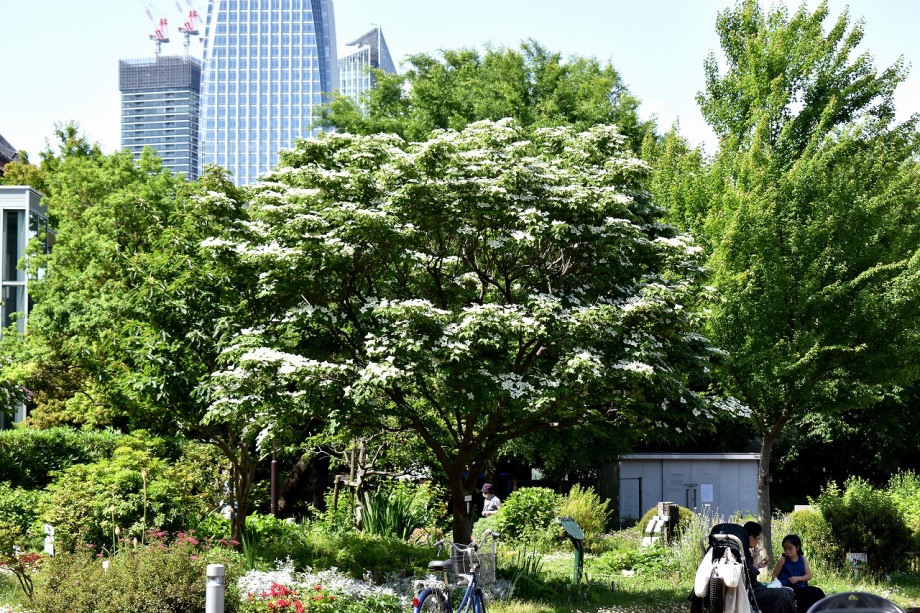 「一言」芝公園の広場には山法師の花が綺麗になりました。真っ白の花の木とピンク色と白色が混ざった花の木があり、どちらも綺麗です。 紫陽花の花も咲き出しました。バラ花もあちこちに咲いています。しもつけのピンク色の花も満開になりました。プリンス芝公園には ツルバラがまだ咲いています。バラの綺麗な花もあちこちに咲いています。