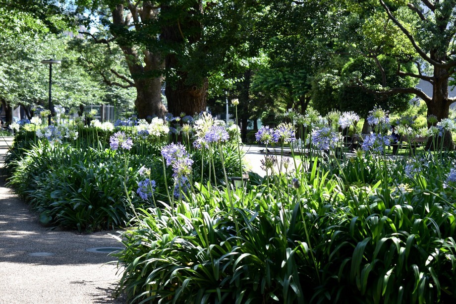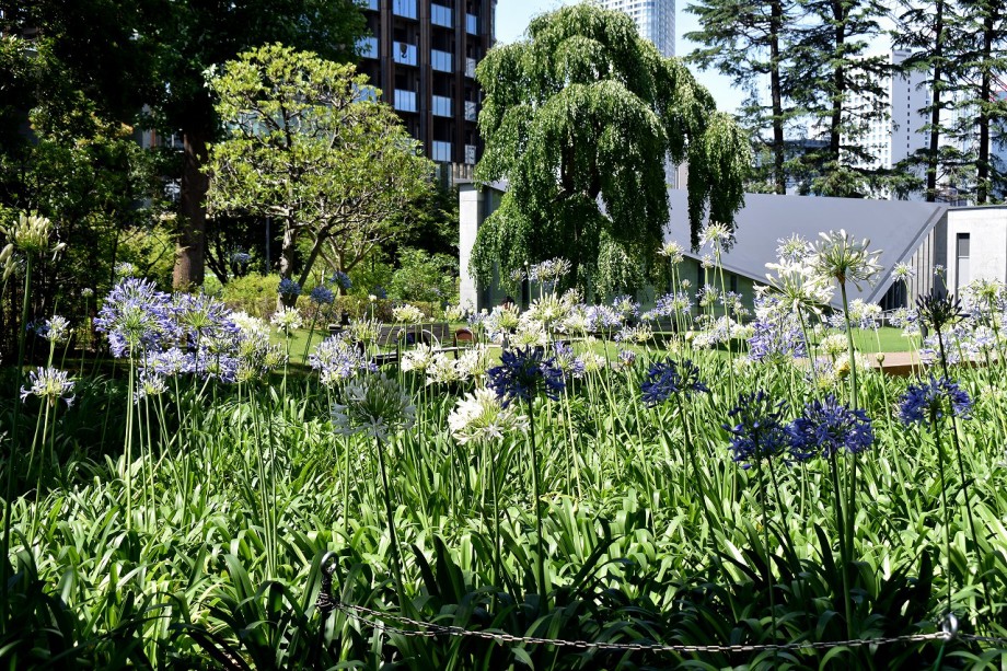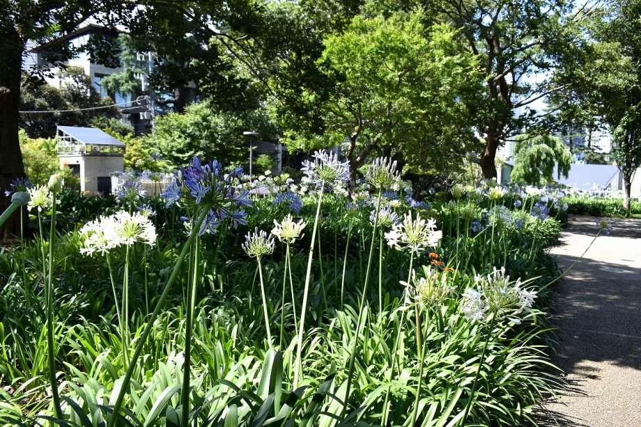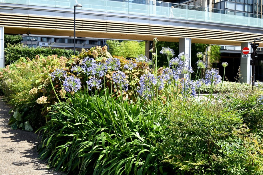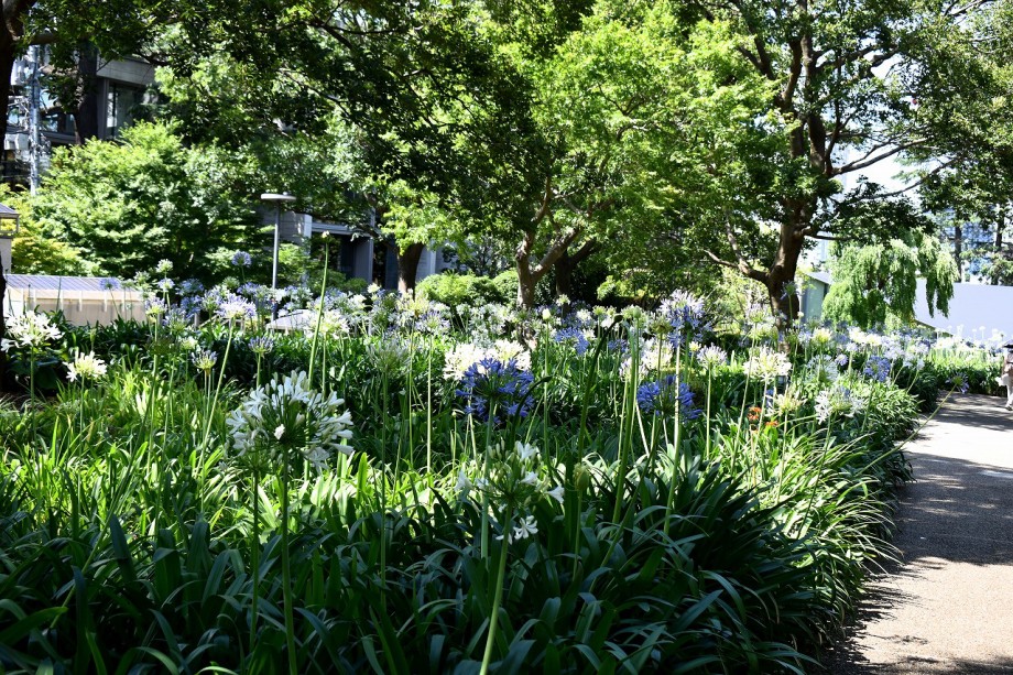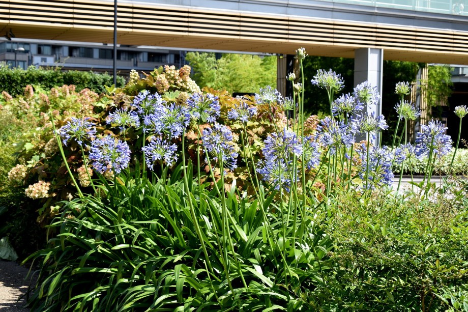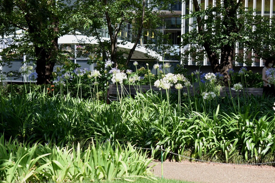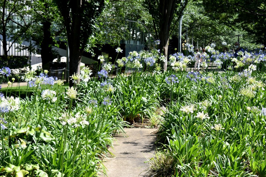 「一言」東京ミッドタウンのガーデンにアガパンパスが一斉に咲きました。青い色の花や白い花が密集して咲いているので賑やかです。 ガーデンの入り口には桔梗やギボウシが咲いています。桧町公園にはノカンゾウや可愛らしいシロシキブの花も咲いています。