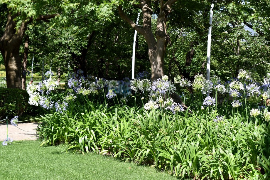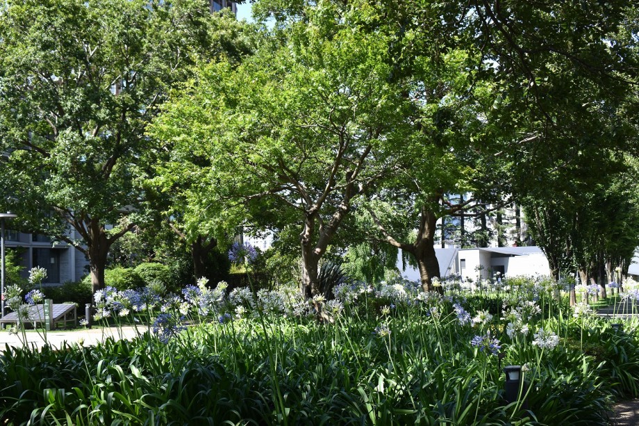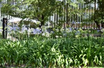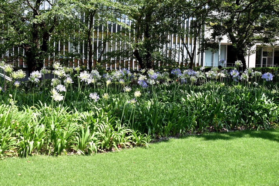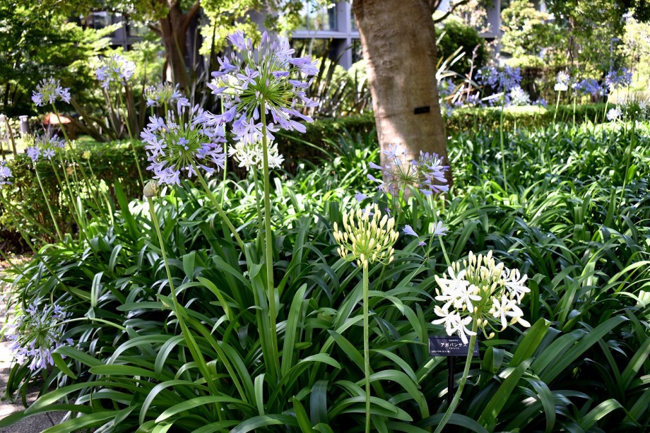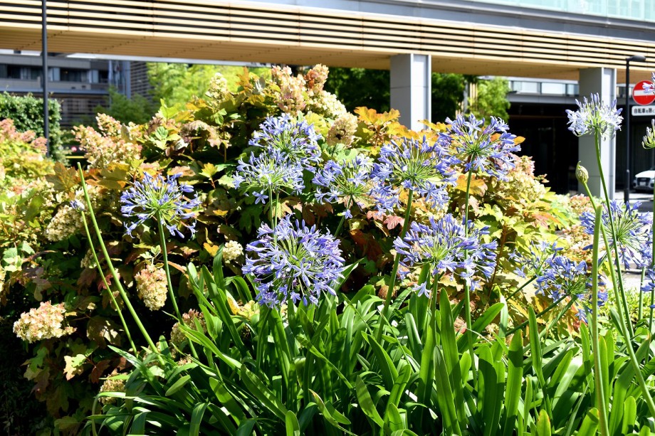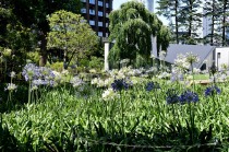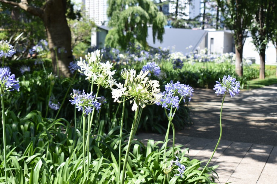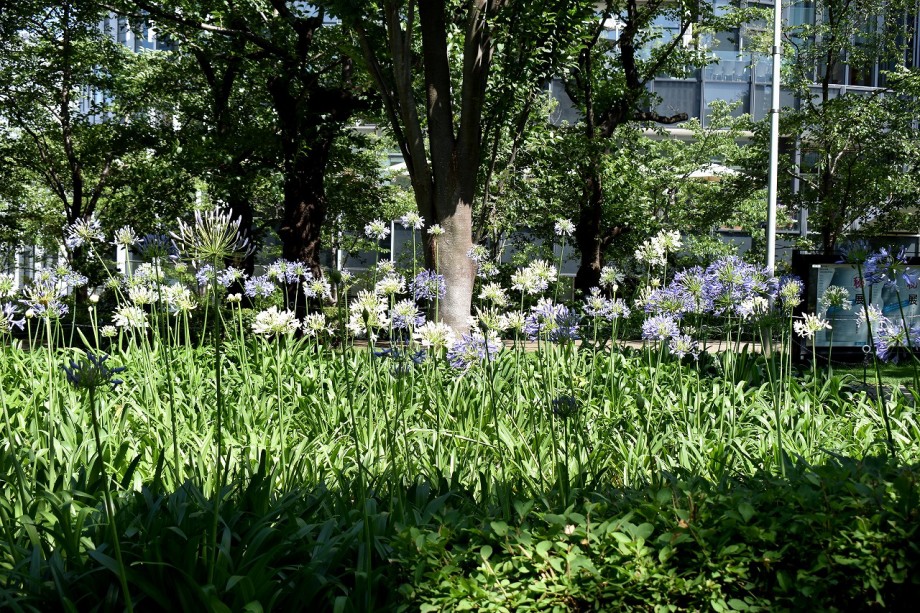「一言」東京ミッドタウンのガーデンにアガパンパスが一斉に咲きました。青い色の花や白い花が密集して咲いているので賑やかです。 ガーデンの入り口には桔梗やギボウシが咲いています。桧町公園にはノカンゾウや可愛らしいシロシキブの花も咲いています。