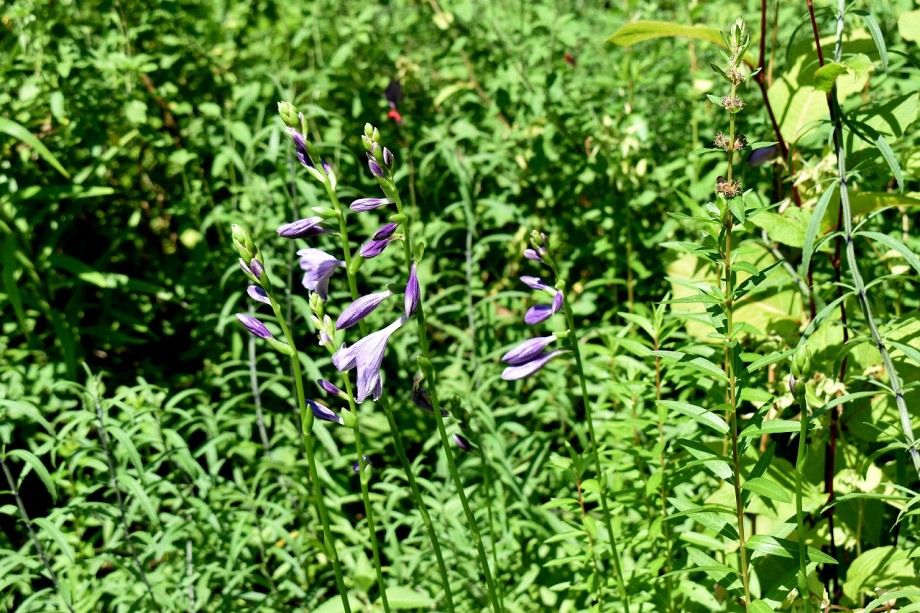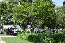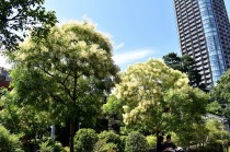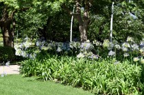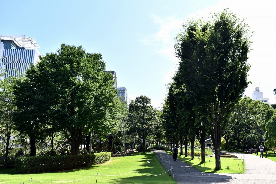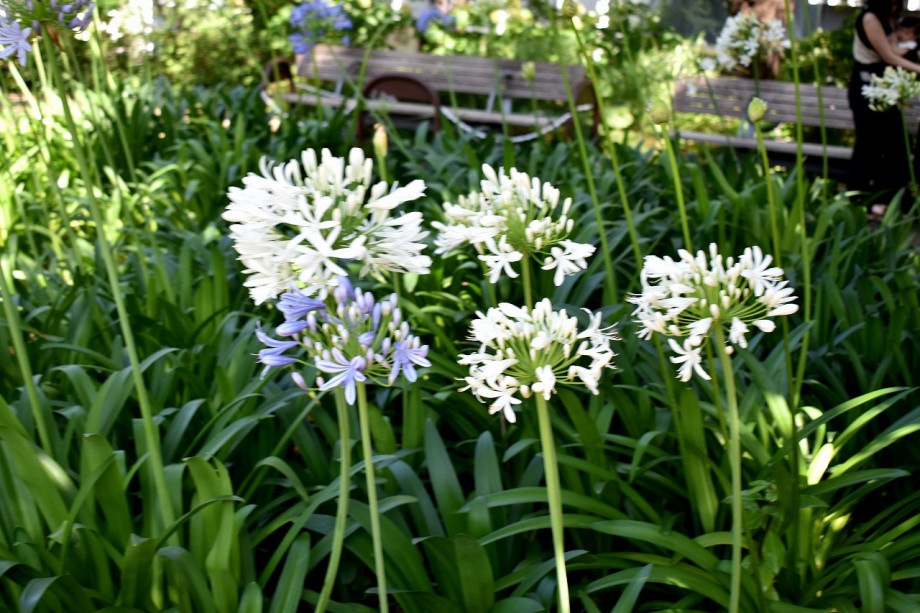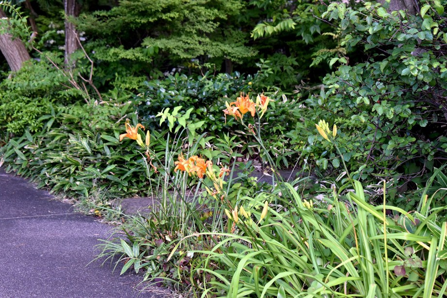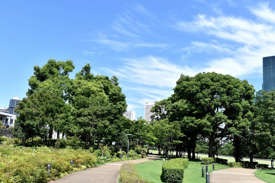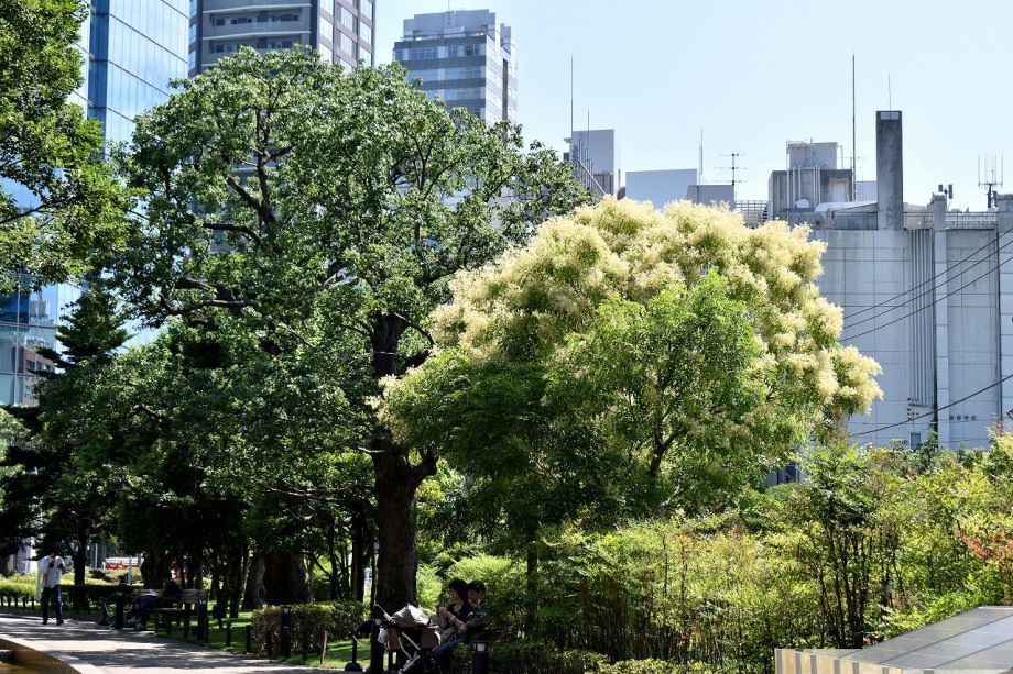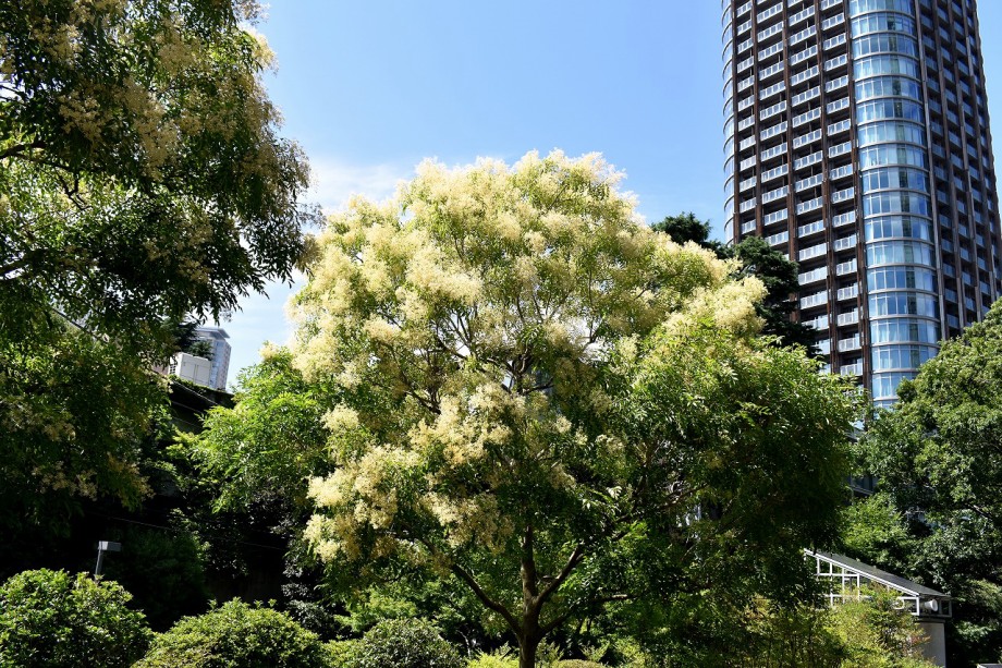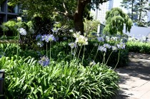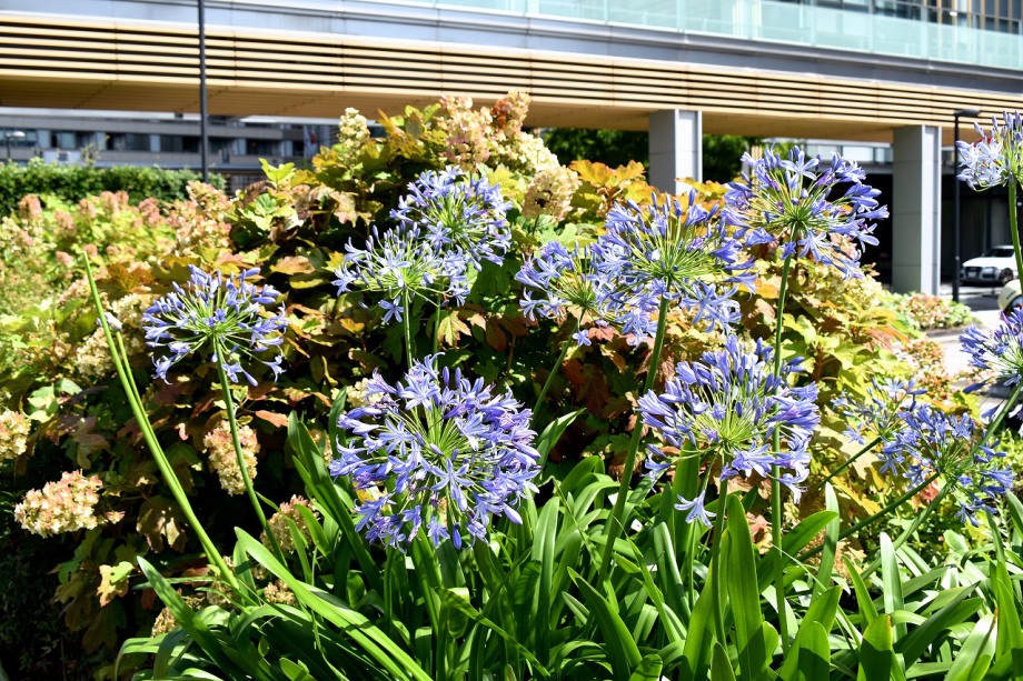 「一言」東京ミッドタウンのガーデンにアガパンパスが一斉に咲きました。青い色の花や白い花が密集して咲いているので賑やかです。 ガーデンの入り口には桔梗やギボウシが咲いています。桧町公園にはノカンゾウや可愛らしいシロシキブの花も咲いています。