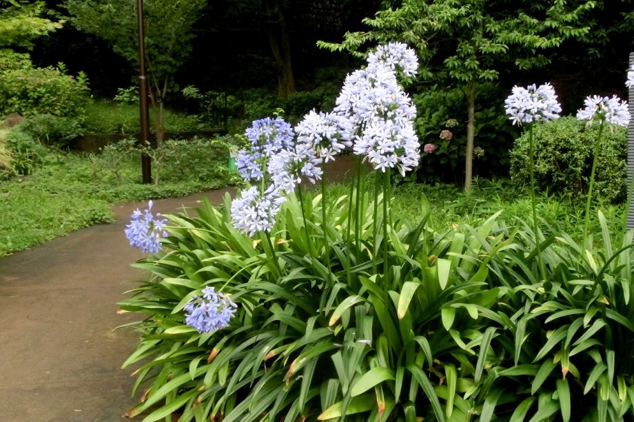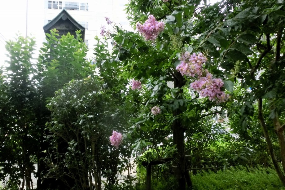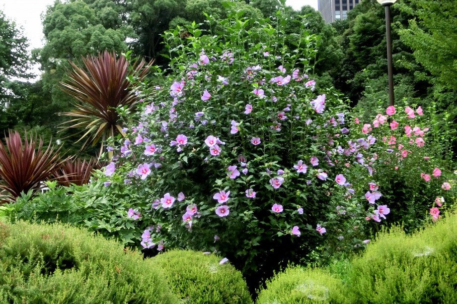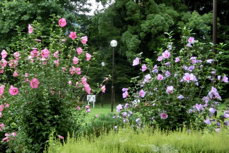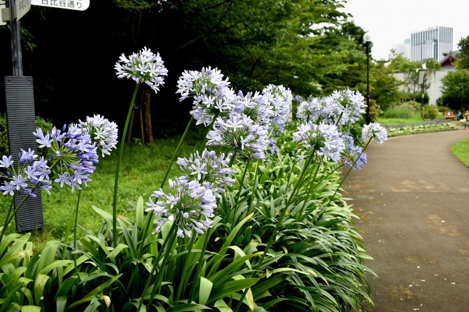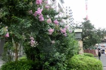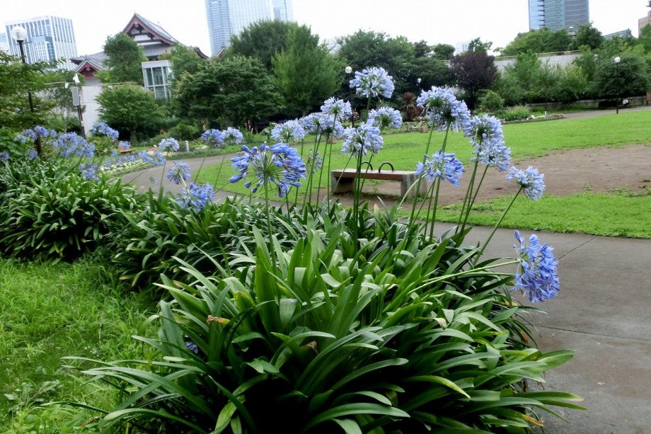 「一言」芝公園の広場にアガパンサスの花が一斉に咲きました。大きなムクゲの木にはたくさんの花が咲いています。 オニユリも咲いています。白やピンクの夾竹桃やヒマワリが咲き始めていました。ヒメリンゴも実っていました。 赤羽橋の近くには百日紅の花が咲いています。