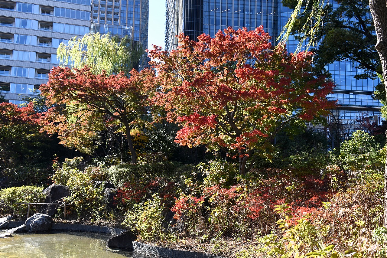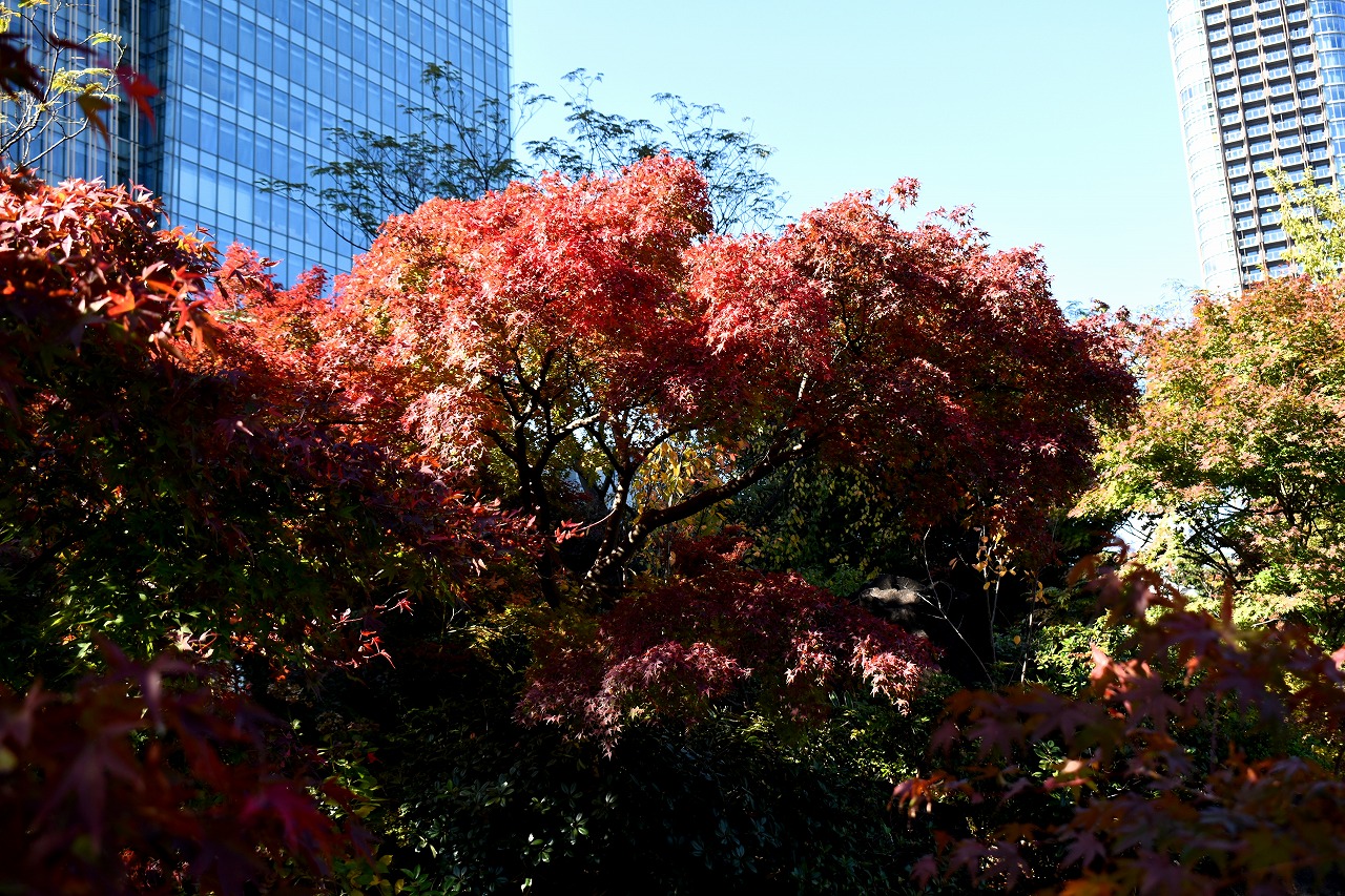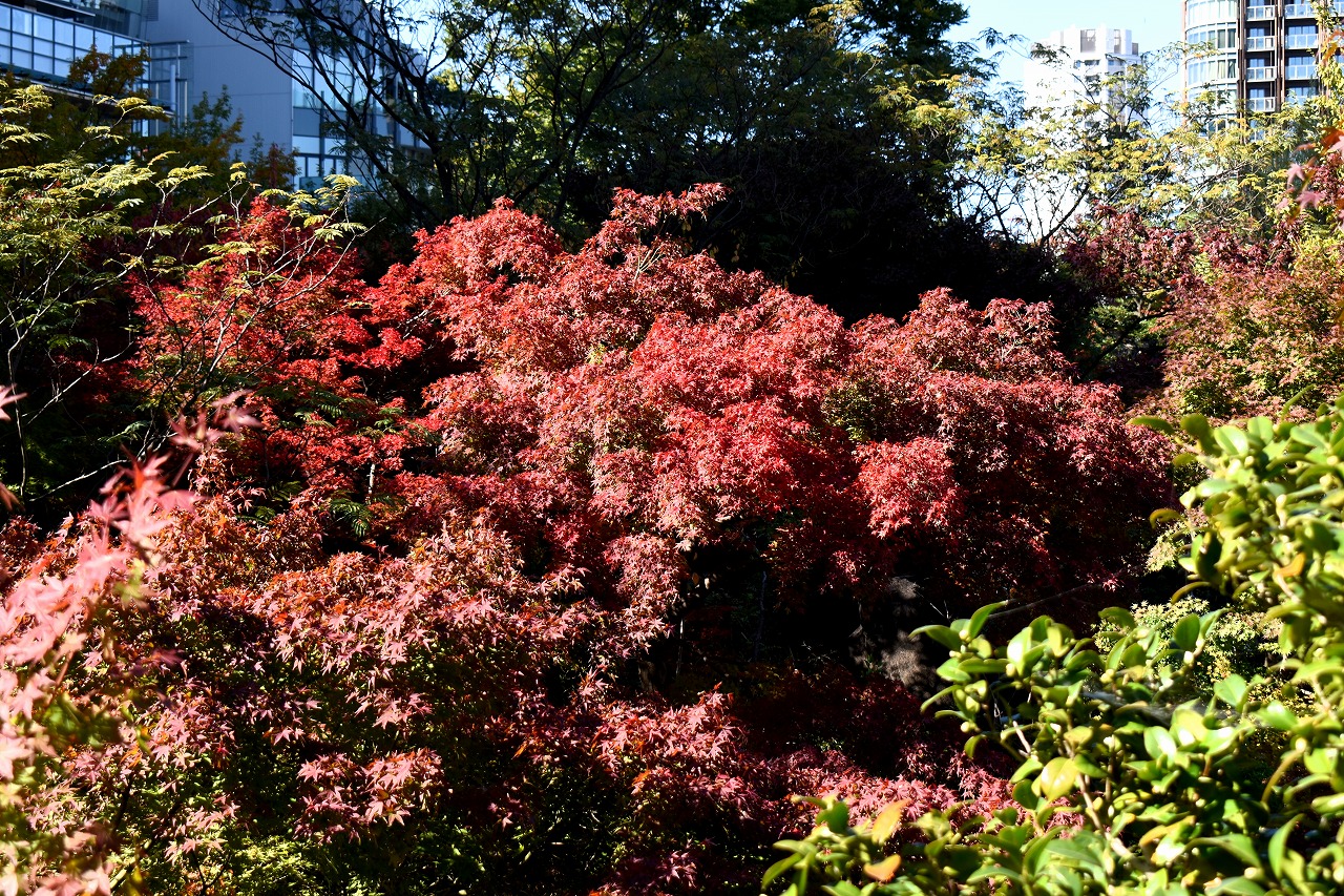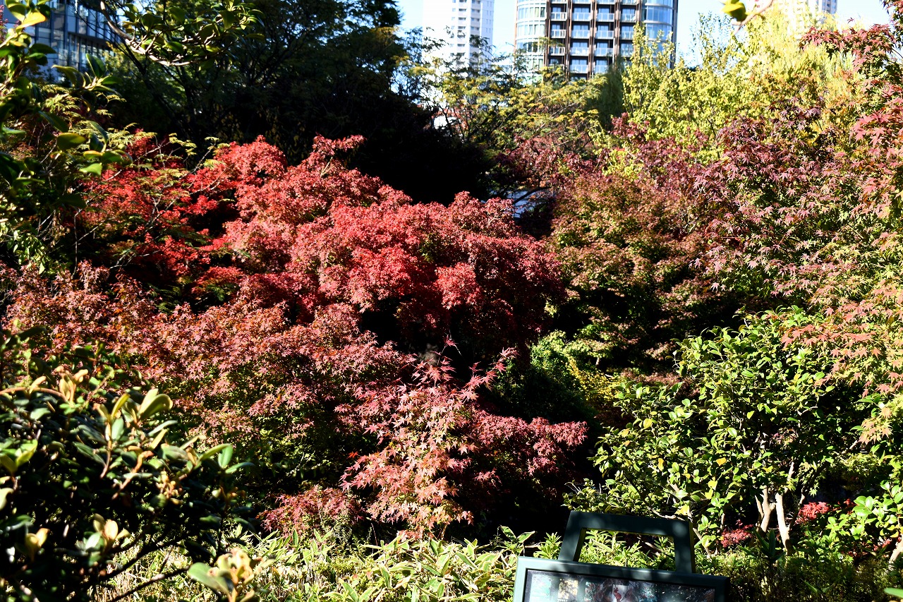 「一言」桧町公園の紅葉が始まりました。既に真っ赤になっている木もあります。池のまわりの紅葉の一部は東京ミッドタウンのビル の陰になって鮮やかな色が見えないところがありますので少し残念です。もう少しすると見頃になるとお思います。公園には キワブキやホトトギスの花がたくさん咲いています。毛利庭園のイチョウが見頃です。麻布十番では酉の市が行われていました。