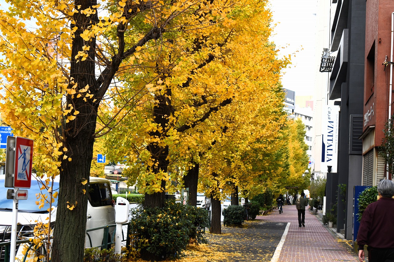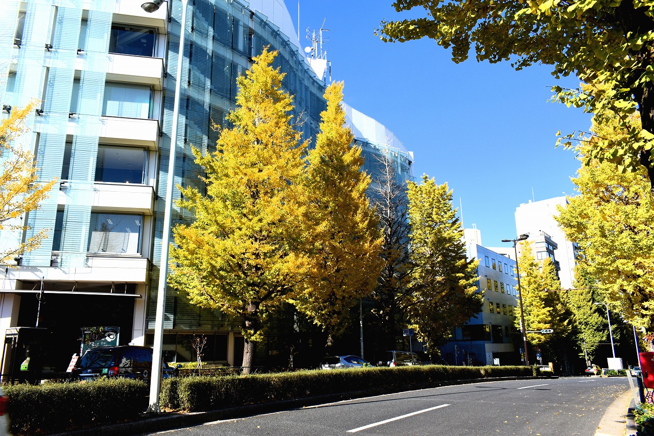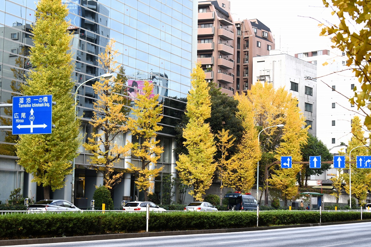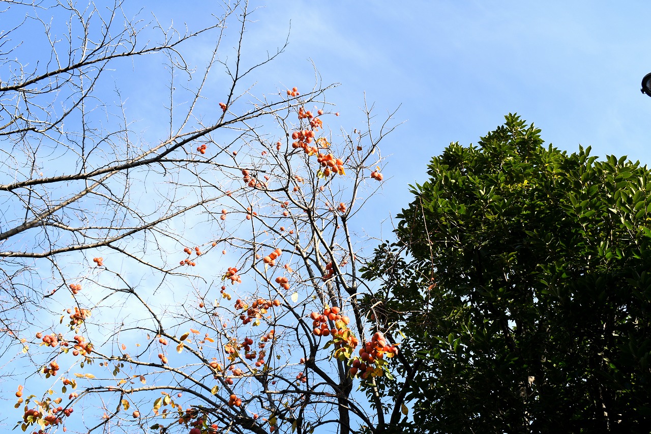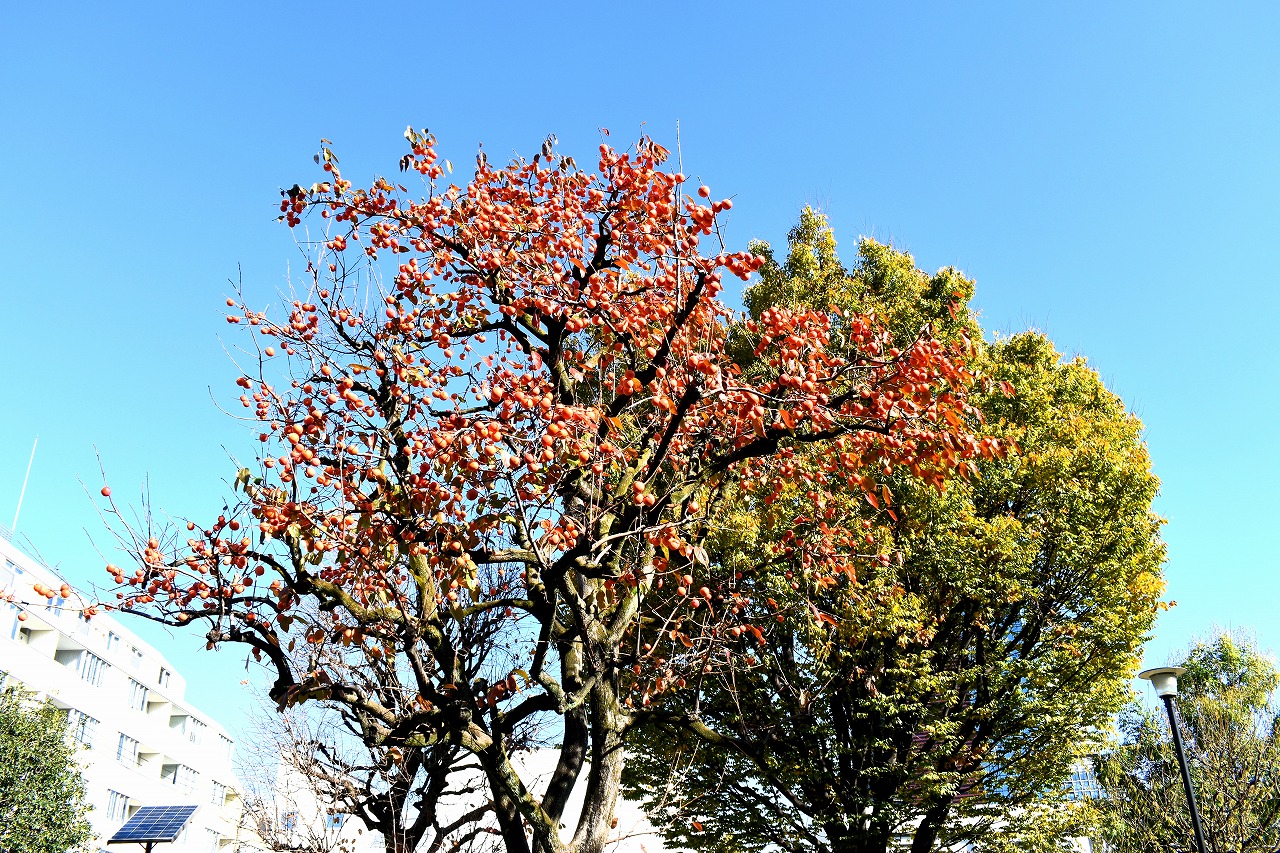 「一言」三田台児童遊園の柿の木にたくさんの柿が実っています。遠くから見ると柿の木が紅葉している感じがします。亀塚公園には夏みかん や柿の実がなっています。高輪公園の大きなイチョウの木が黄葉しました。品川バス停のイチョウは散り始め透きとおった黄色になって います。第一京浜沿いのイチョウも黄葉し始めました。プラチナ通りや麻布通りのイチョウも黄葉しています。