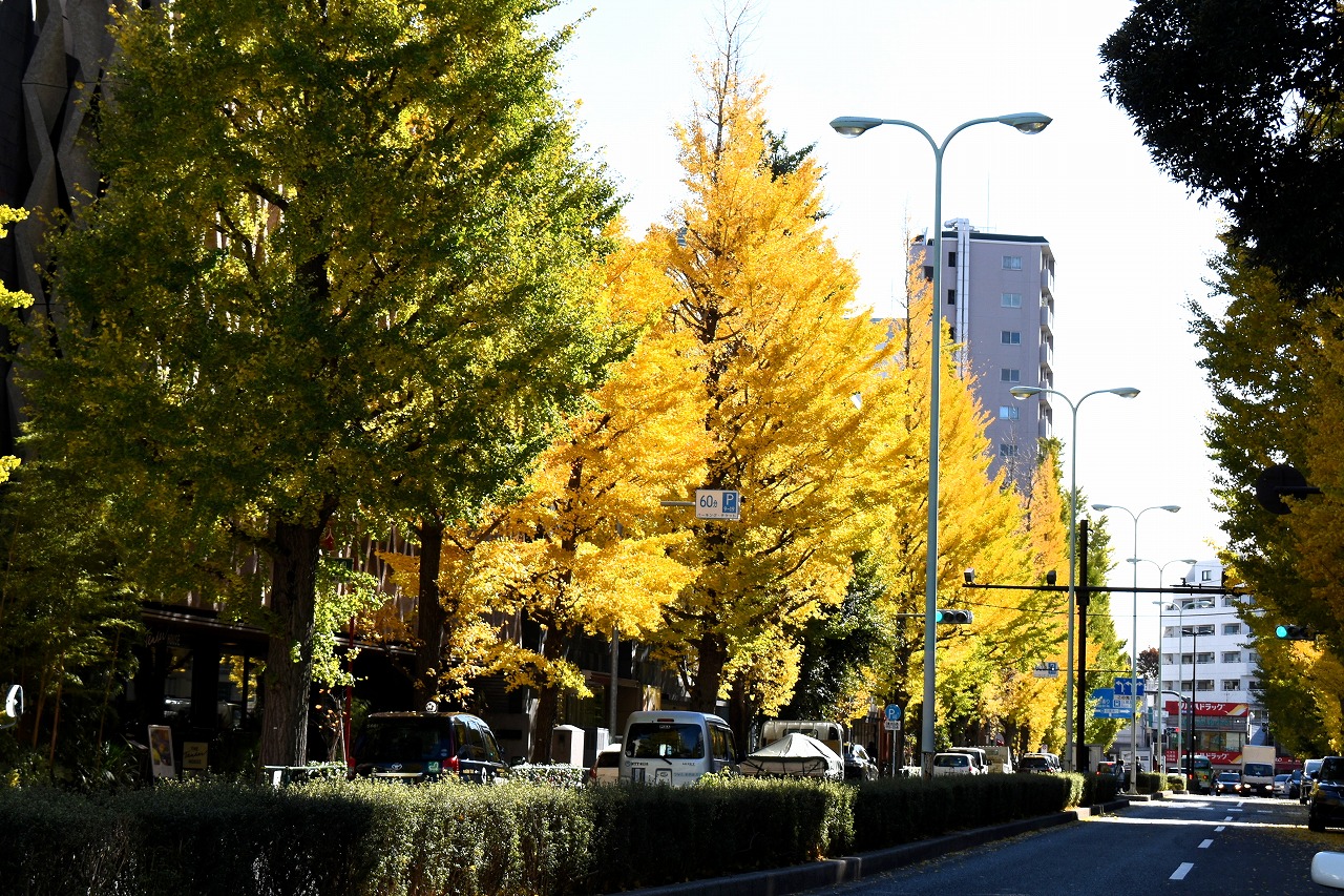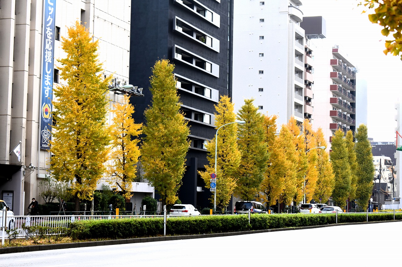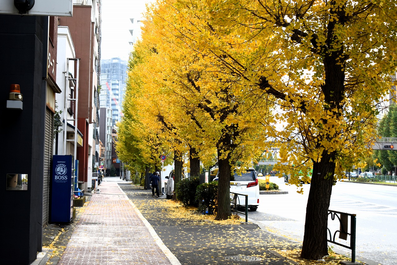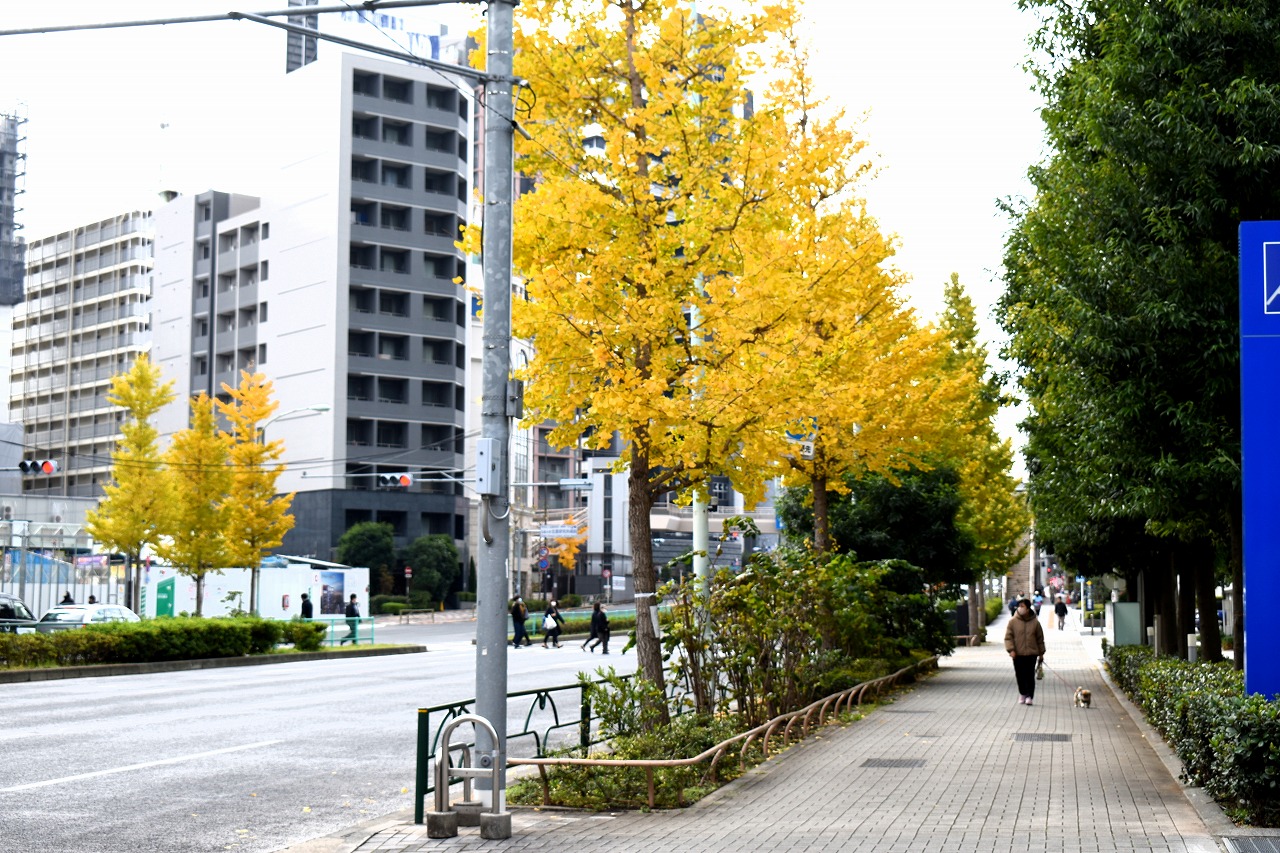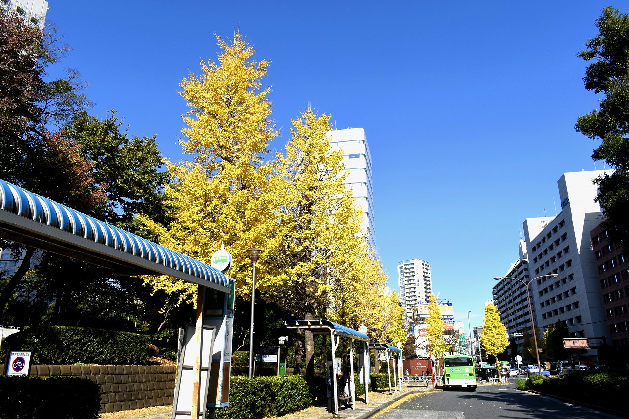 「一言」三田台児童遊園の柿の木にたくさんの柿が実っています。遠くから見ると柿の木が紅葉している感じがします。亀塚公園には夏みかん や柿の実がなっています。高輪公園の大きなイチョウの木が黄葉しました。品川バス停のイチョウは散り始め透きとおった黄色になって います。第一京浜沿いのイチョウも黄葉し始めました。プラチナ通りや麻布通りのイチョウも黄葉しています。
