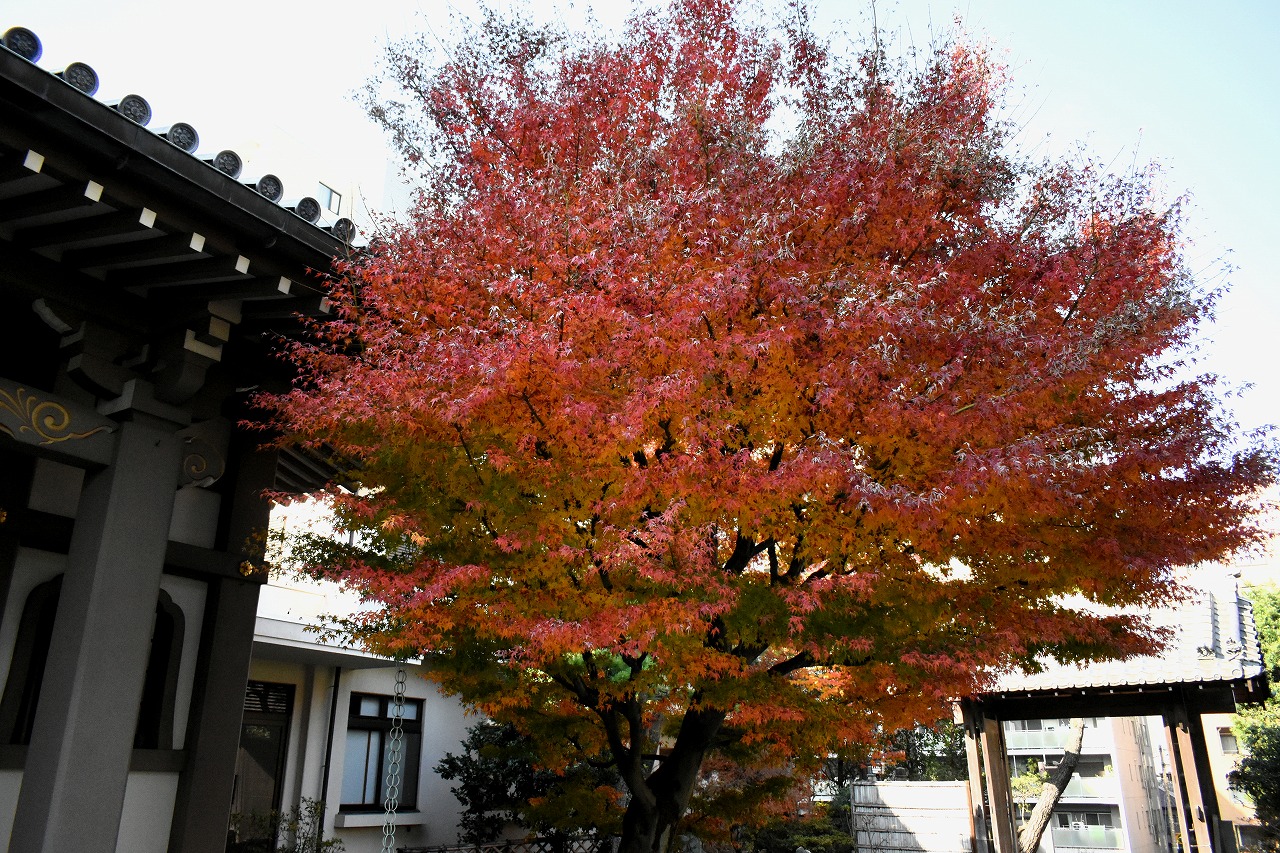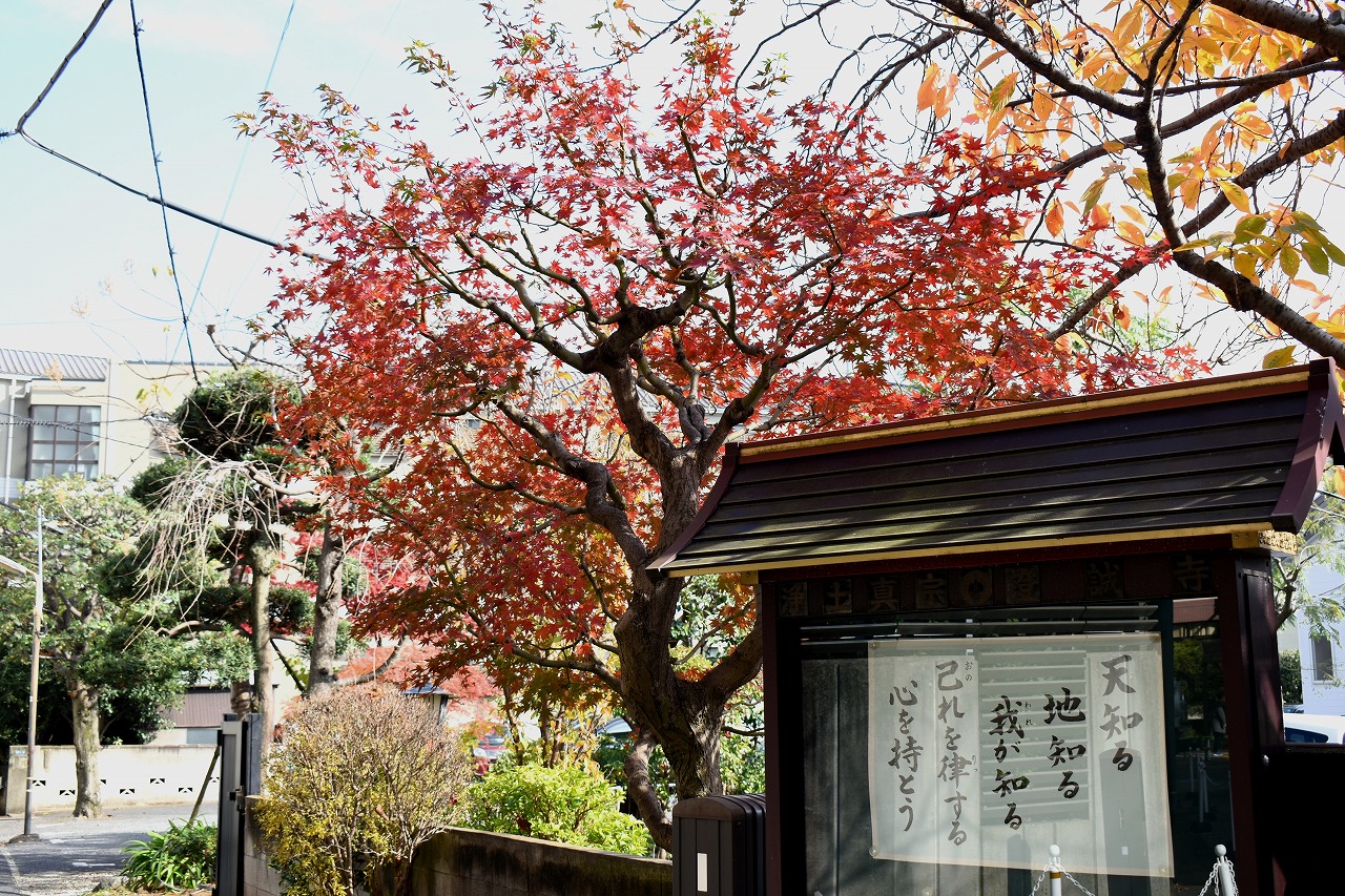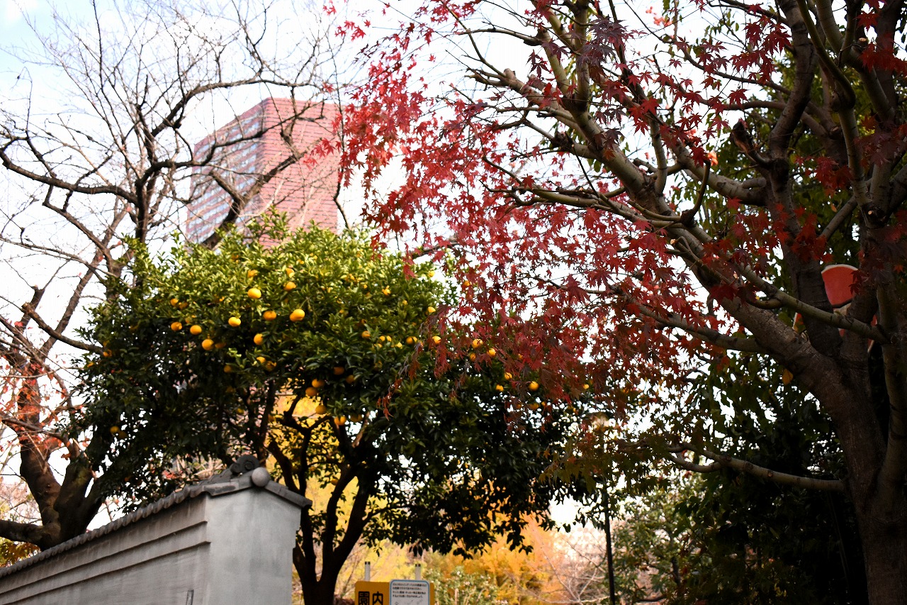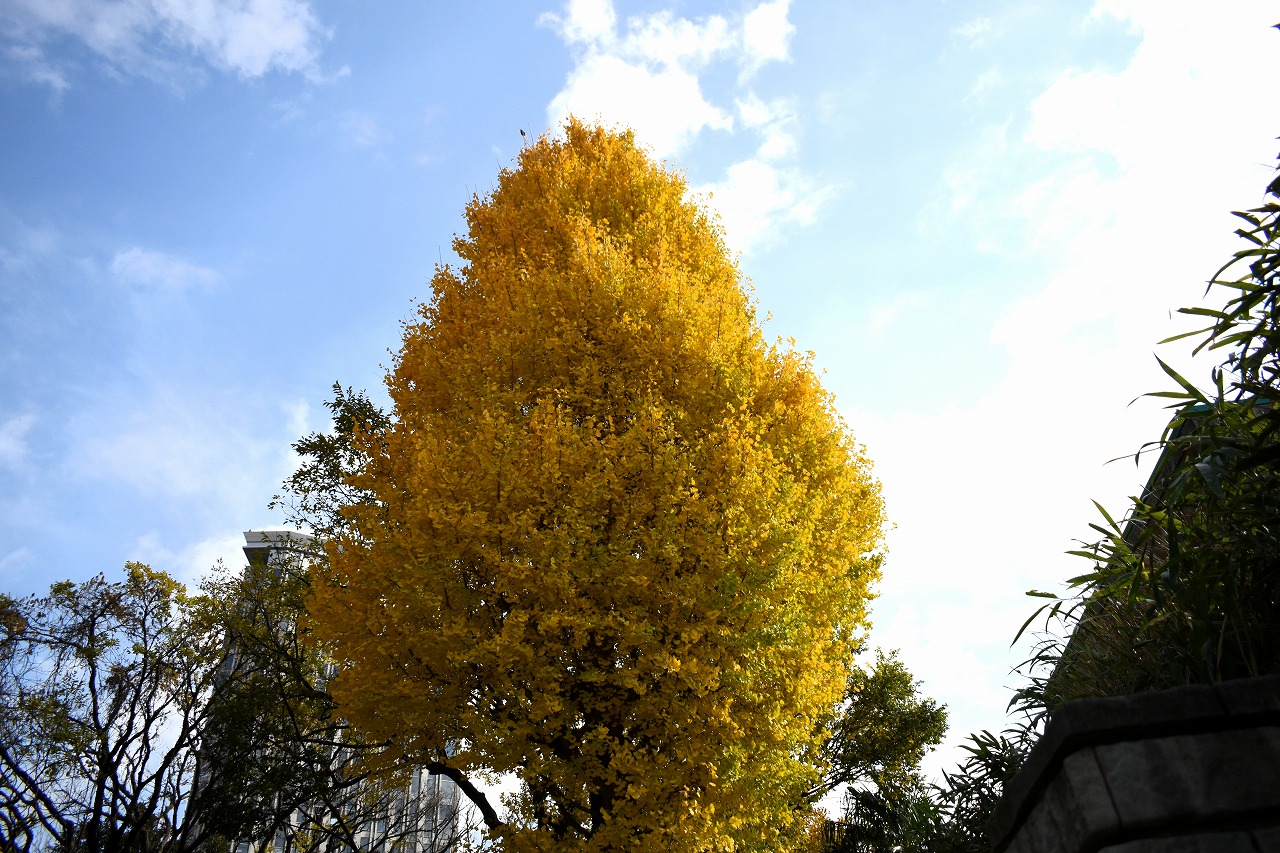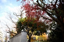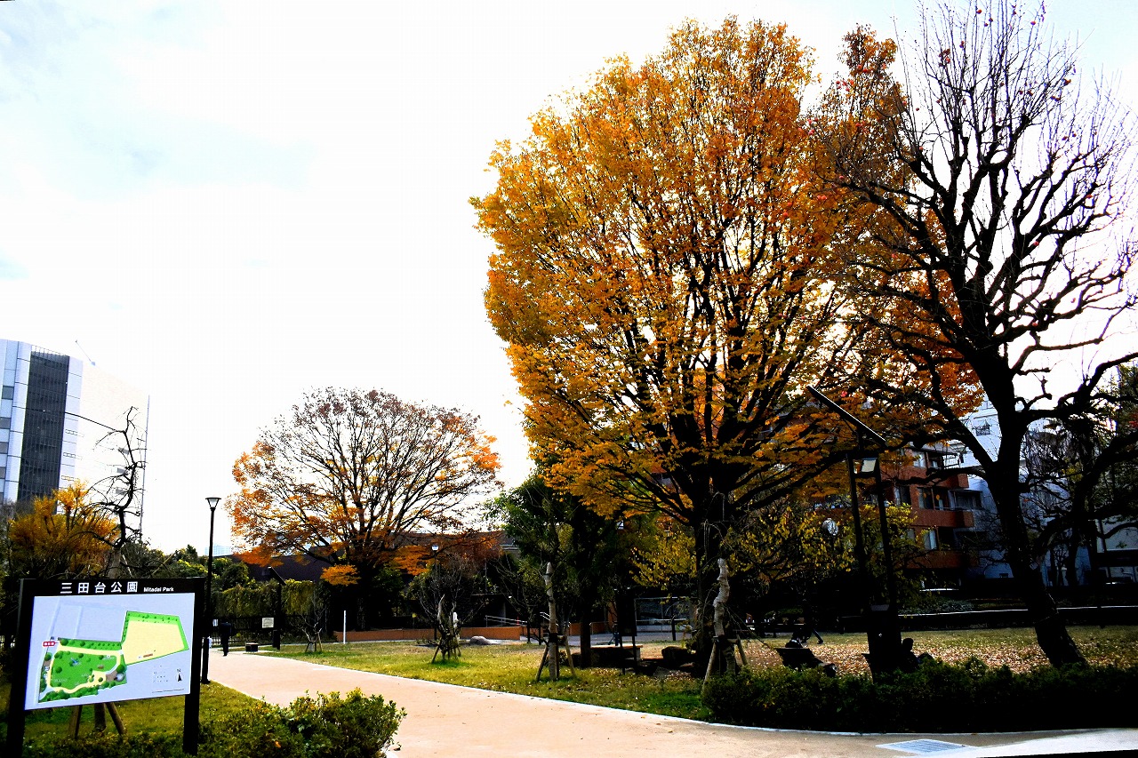 「一言」亀塚公園には大きな木がたくさんありますが、どれも黄葉して見事です。三田台児童遊園の大きな木も黄葉しています。今年は柿の実がたくさんなりました。 泉岳寺のもみじも紅葉して綺麗です。門を背景にしたもみじは風情があります。三田寺町にはあちらこちらのお寺に紅葉や黄葉が見られ風情があります。