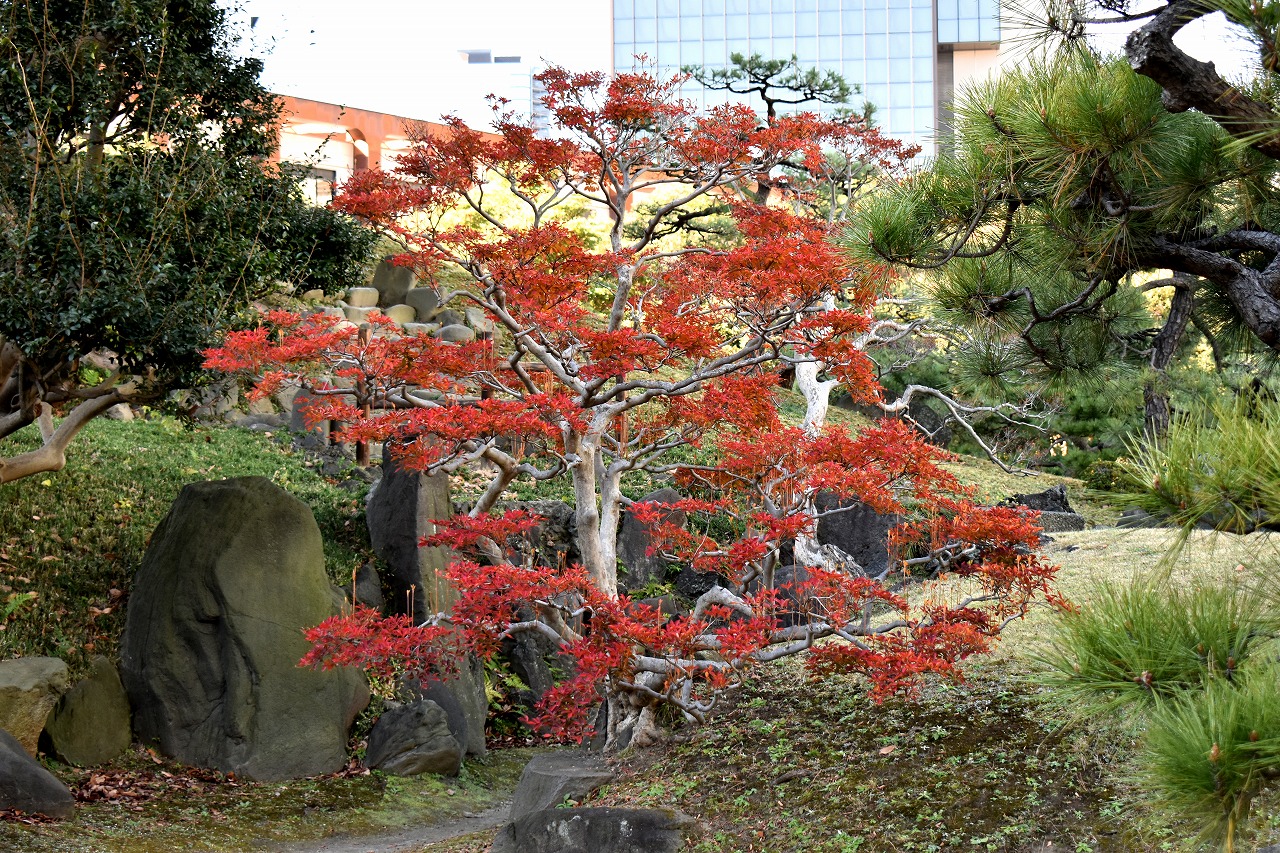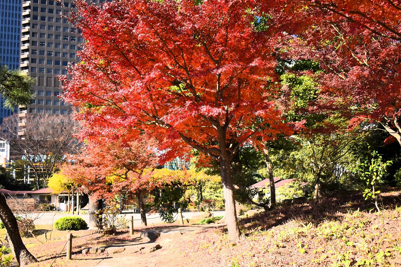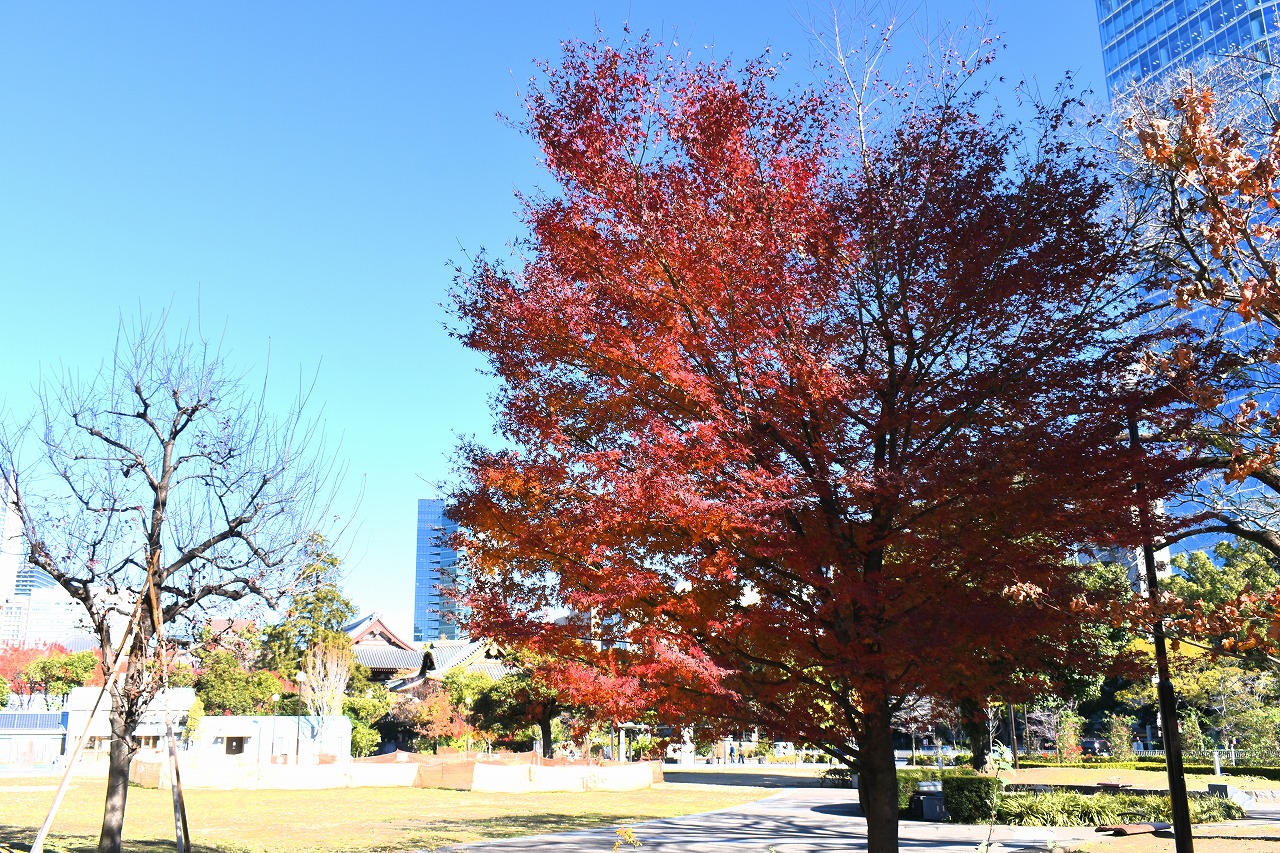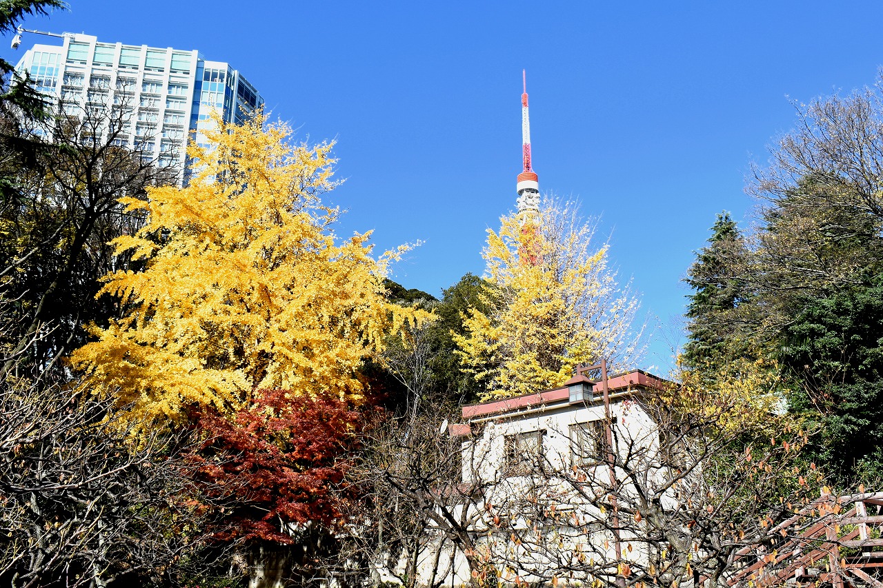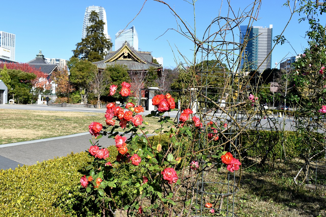 「一言」旧芝離宮の紅葉は峠を越えた感じですが、まだ綺麗です。南天や千両、万両が実をつけています。 芝公園にある宝珠院のまわりにももみじがあり紅葉して見頃になっています。芝公園の東照宮の大きなイチョウ の木も黄葉して迫力があります。梅林には木瓜の花が咲いています。広場にはバラの花が咲いています。 芝公園の前の日比谷通りや第一京浜の道路沿いのイチョウの並木も黄葉して綺麗です。