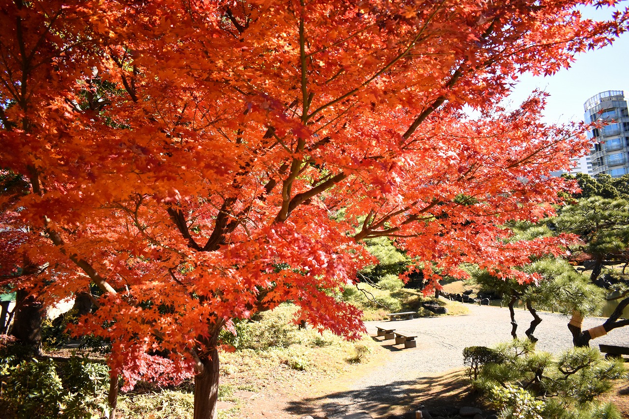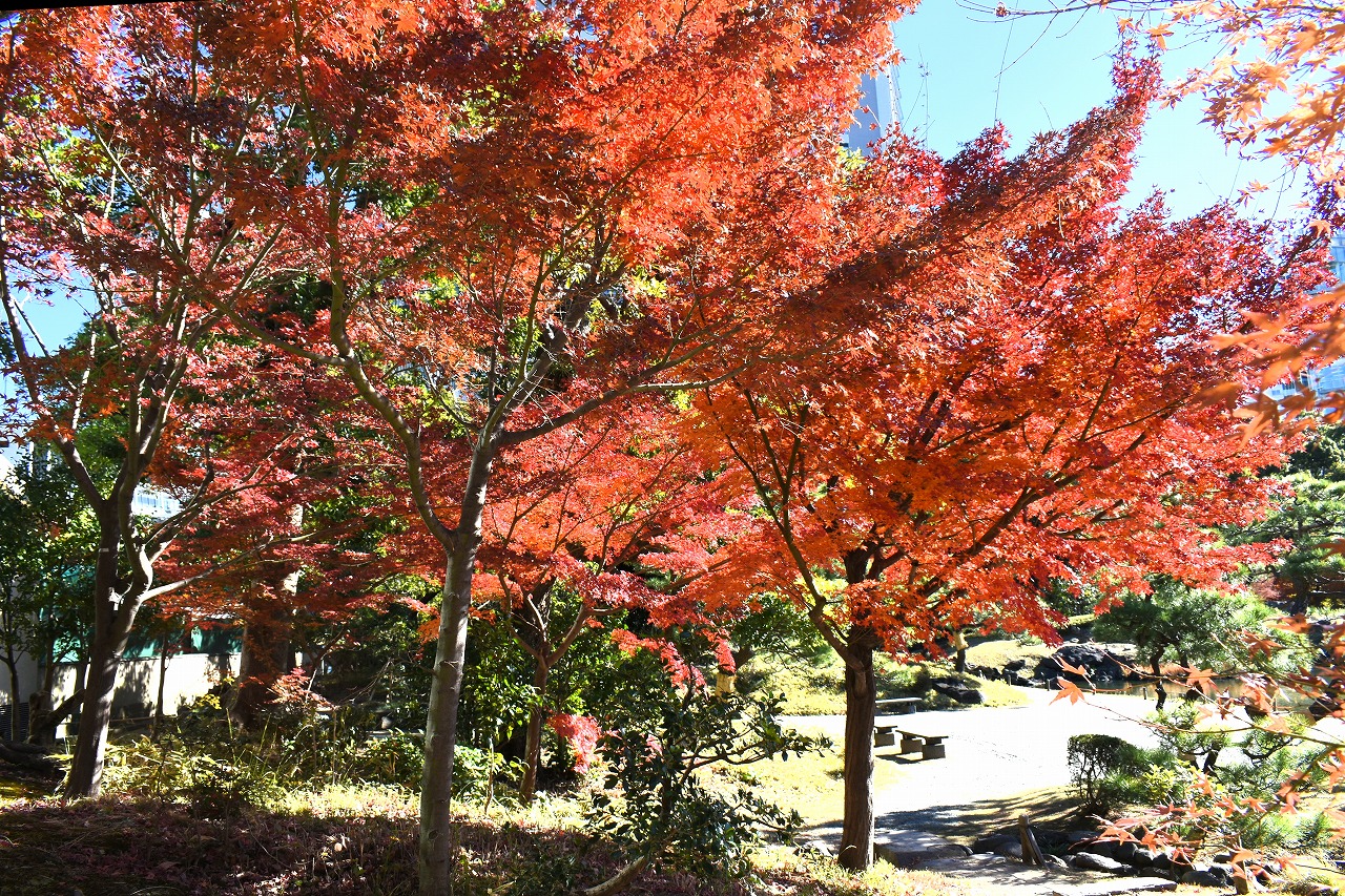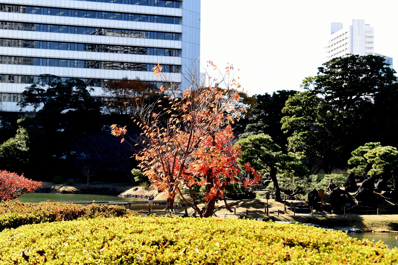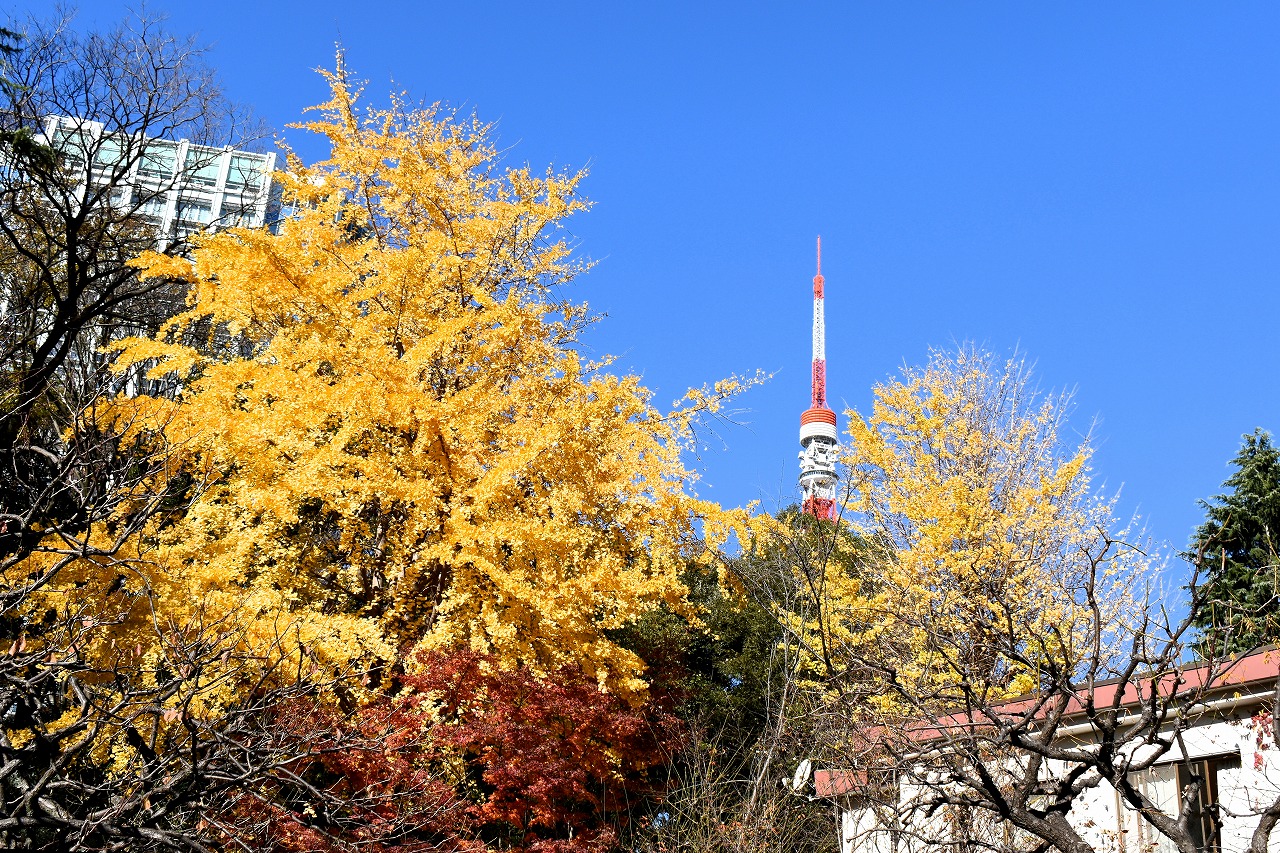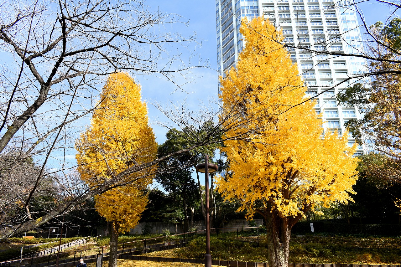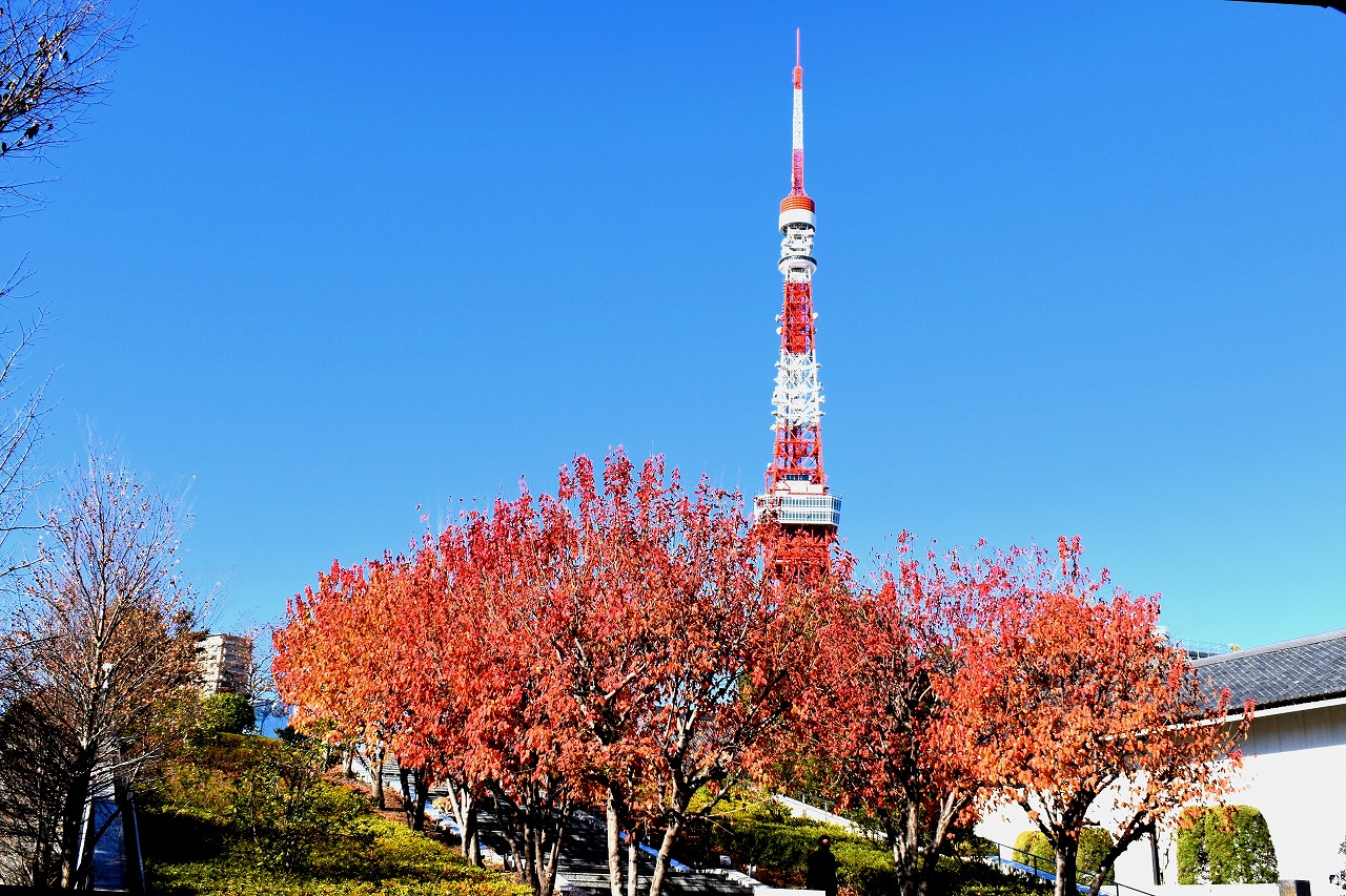 「一言」旧芝離宮の紅葉は峠を越えた感じですが、まだ綺麗です。南天や千両、万両が実をつけています。 芝公園にある宝珠院のまわりにももみじがあり紅葉して見頃になっています。芝公園の東照宮の大きなイチョウ の木も黄葉して迫力があります。梅林には木瓜の花が咲いています。広場にはバラの花が咲いています。 芝公園の前の日比谷通りや第一京浜の道路沿いのイチョウの並木も黄葉して綺麗です。