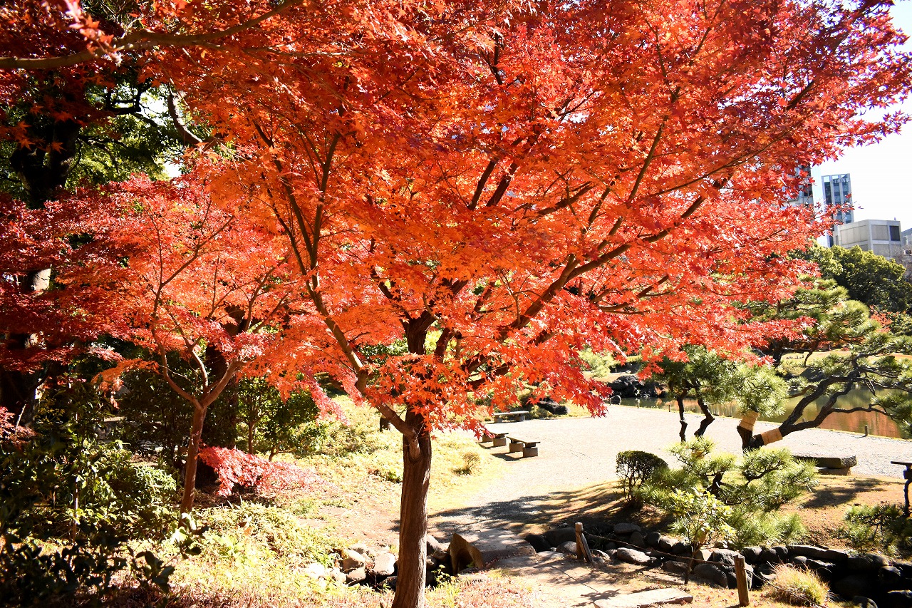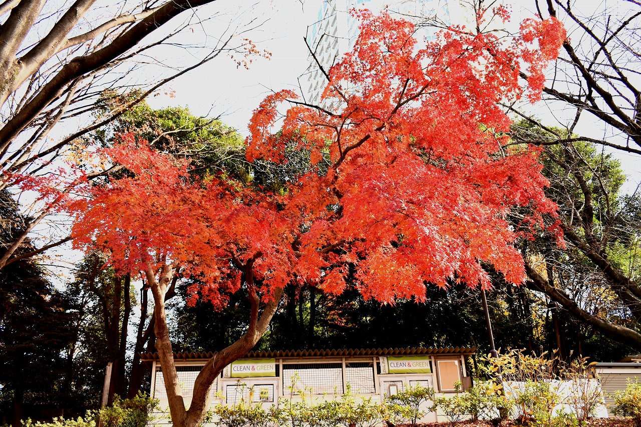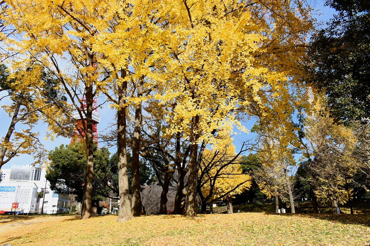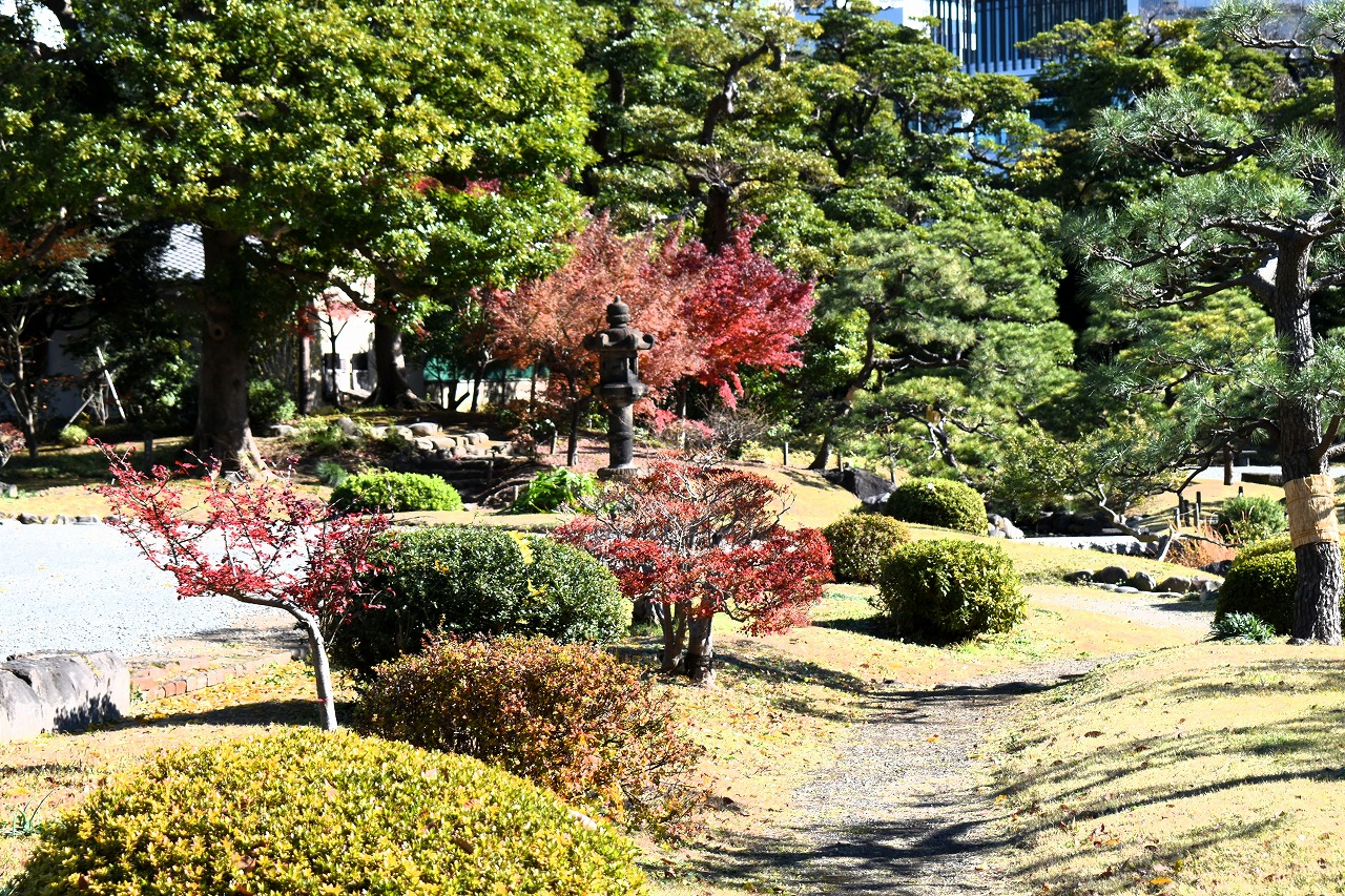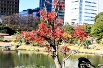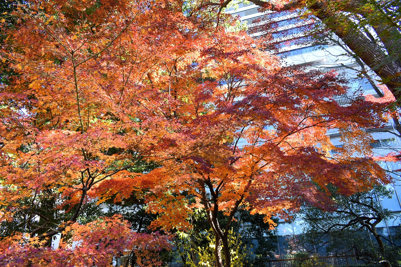 「一言」旧芝離宮の紅葉は峠を越えた感じですが、まだ綺麗です。南天や千両、万両が実をつけています。 芝公園にある宝珠院のまわりにももみじがあり紅葉して見頃になっています。芝公園の東照宮の大きなイチョウ の木も黄葉して迫力があります。梅林には木瓜の花が咲いています。広場にはバラの花が咲いています。 芝公園の前の日比谷通りや第一京浜の道路沿いのイチョウの並木も黄葉して綺麗です。