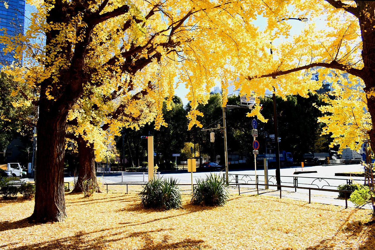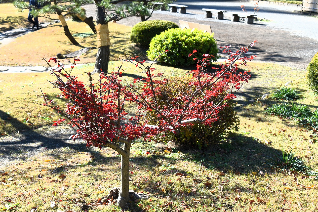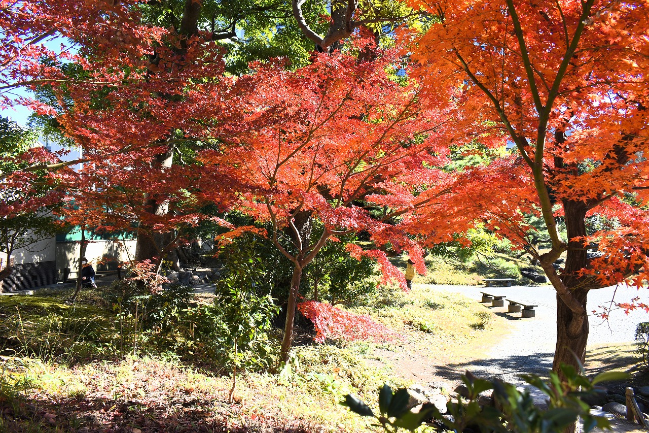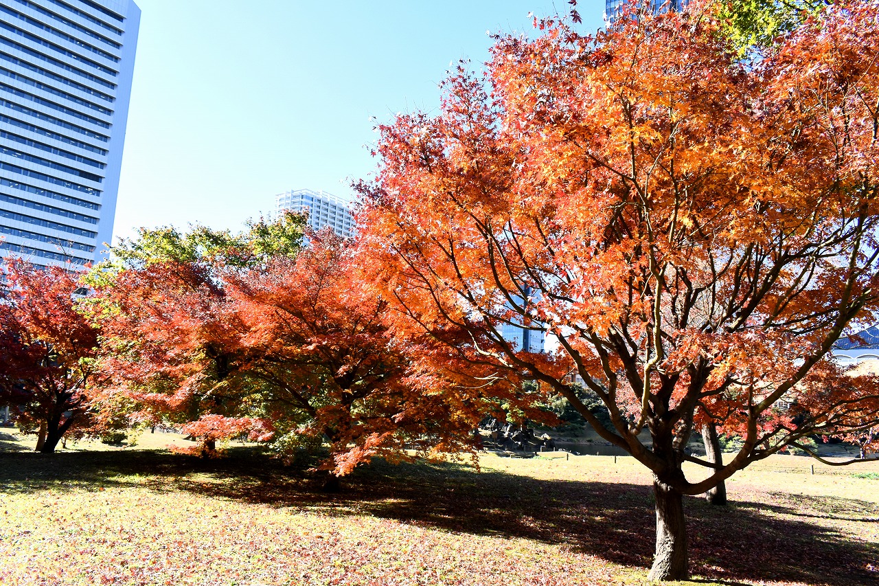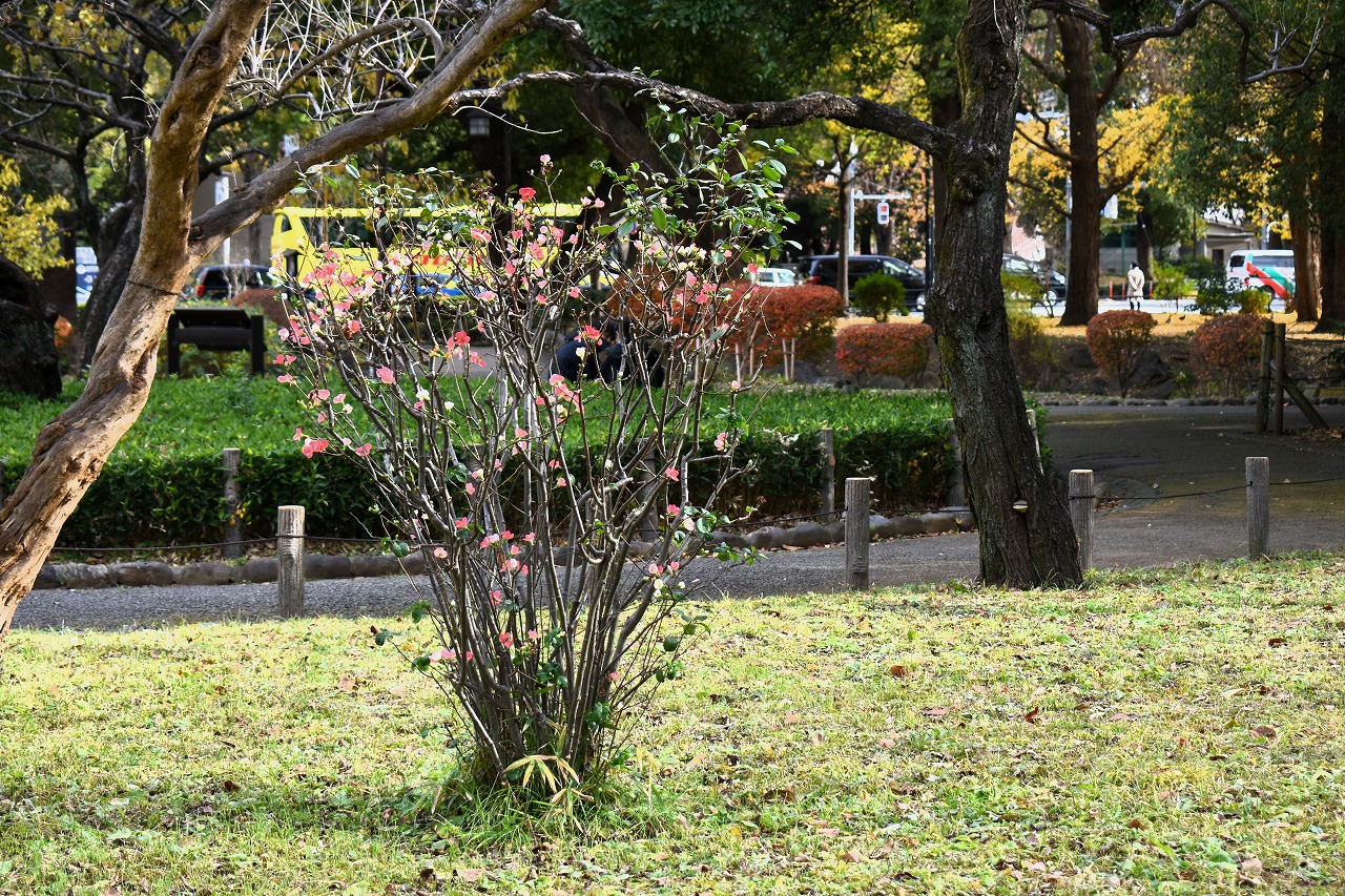 「一言」旧芝離宮の紅葉は峠を越えた感じですが、まだ綺麗です。南天や千両、万両が実をつけています。 芝公園にある宝珠院のまわりにももみじがあり紅葉して見頃になっています。芝公園の東照宮の大きなイチョウ の木も黄葉して迫力があります。梅林には木瓜の花が咲いています。広場にはバラの花が咲いています。 芝公園の前の日比谷通りや第一京浜の道路沿いのイチョウの並木も黄葉して綺麗です。