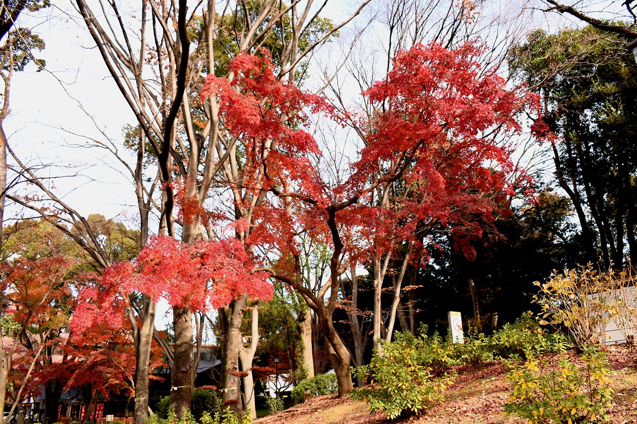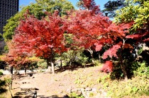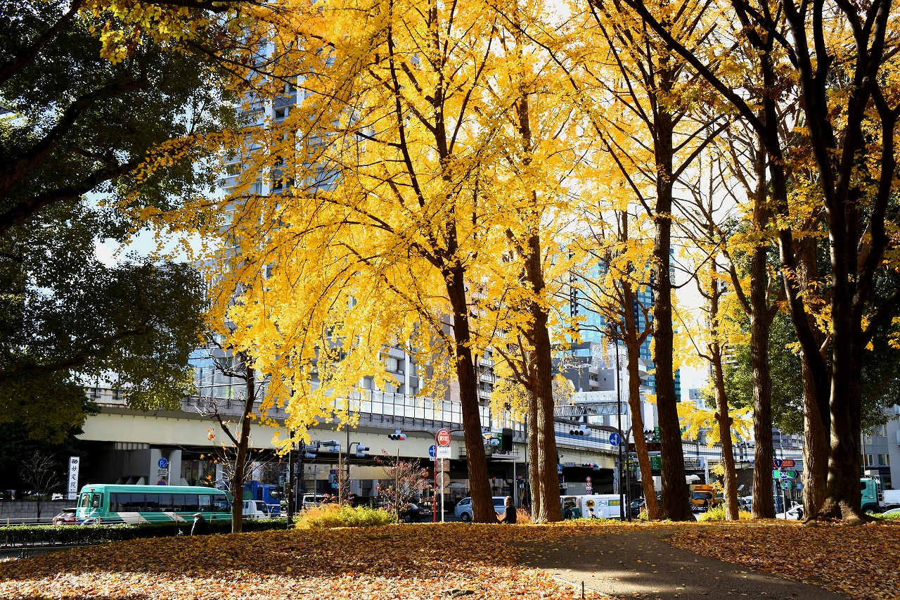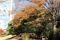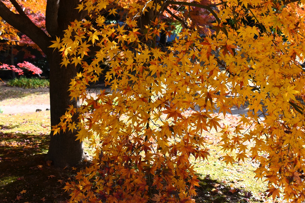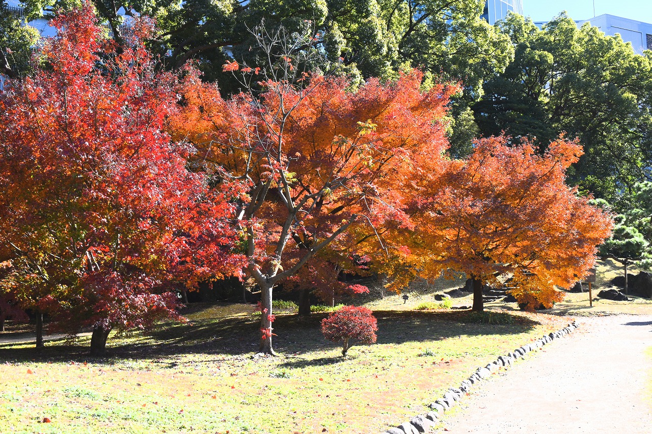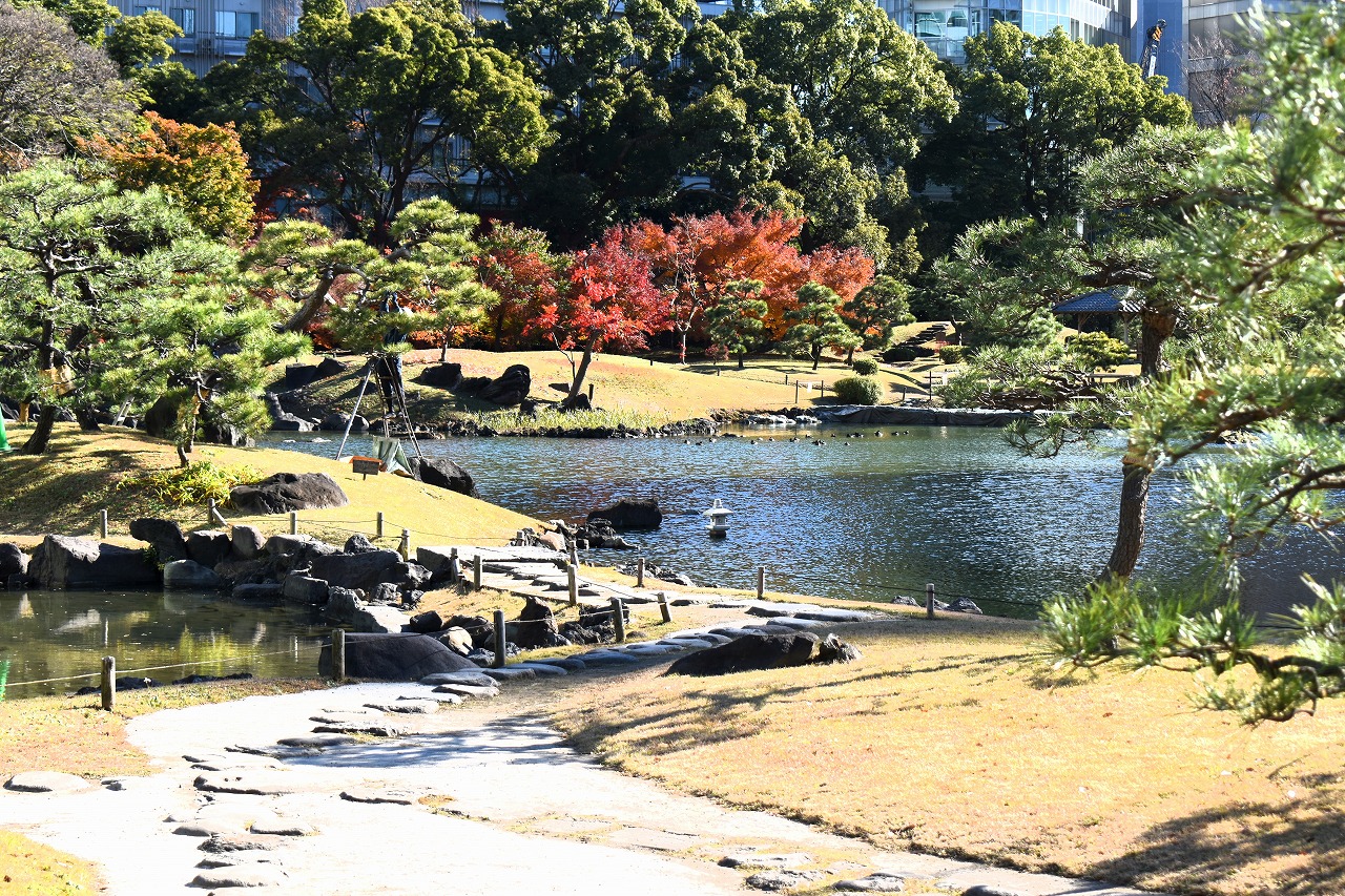 「一言」旧芝離宮の紅葉は峠を越えた感じですが、まだ綺麗です。南天や千両、万両が実をつけています。 芝公園にある宝珠院のまわりにももみじがあり紅葉して見頃になっています。芝公園の東照宮の大きなイチョウ の木も黄葉して迫力があります。梅林には木瓜の花が咲いています。広場にはバラの花が咲いています。 芝公園の前の日比谷通りや第一京浜の道路沿いのイチョウの並木も黄葉して綺麗です。