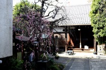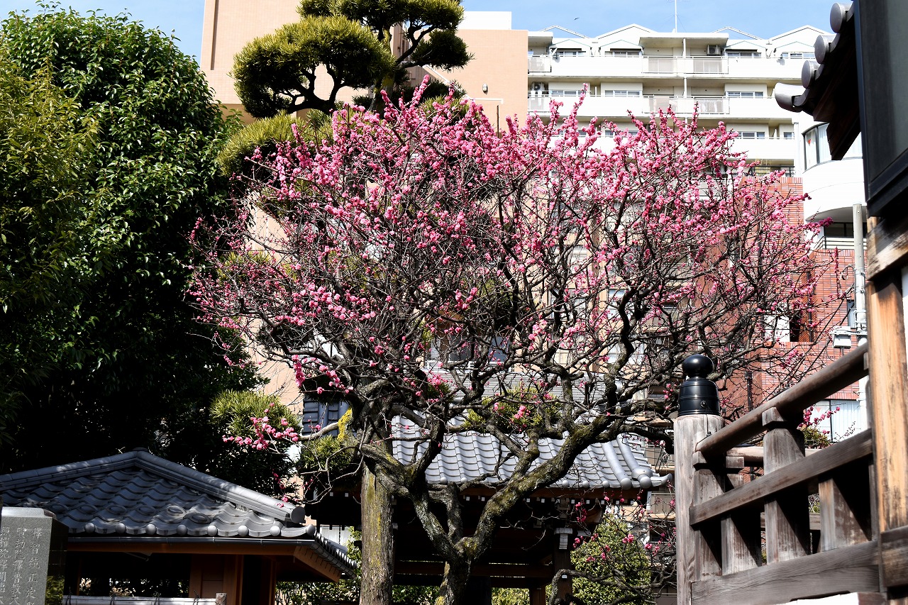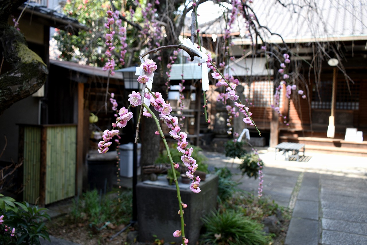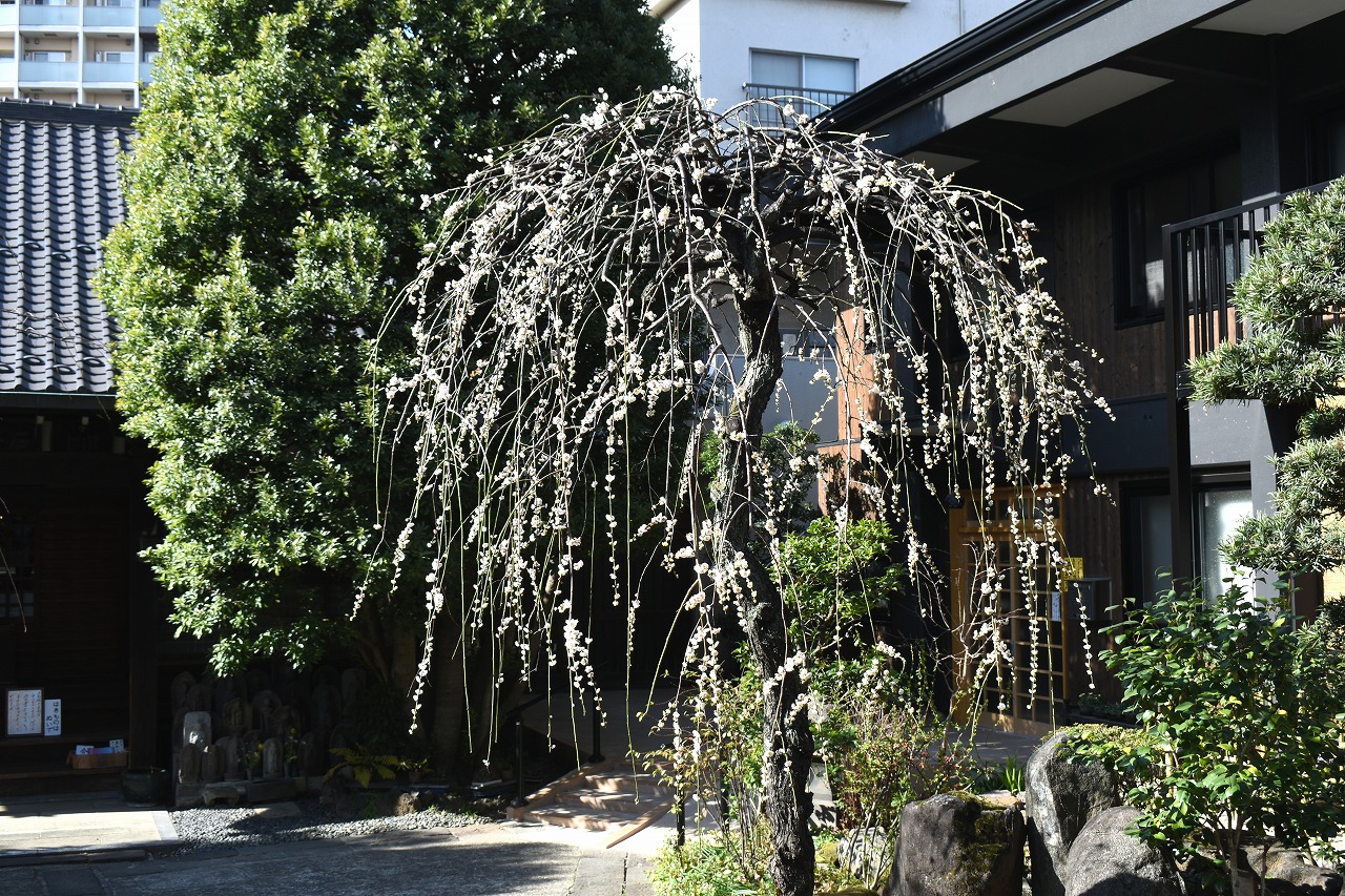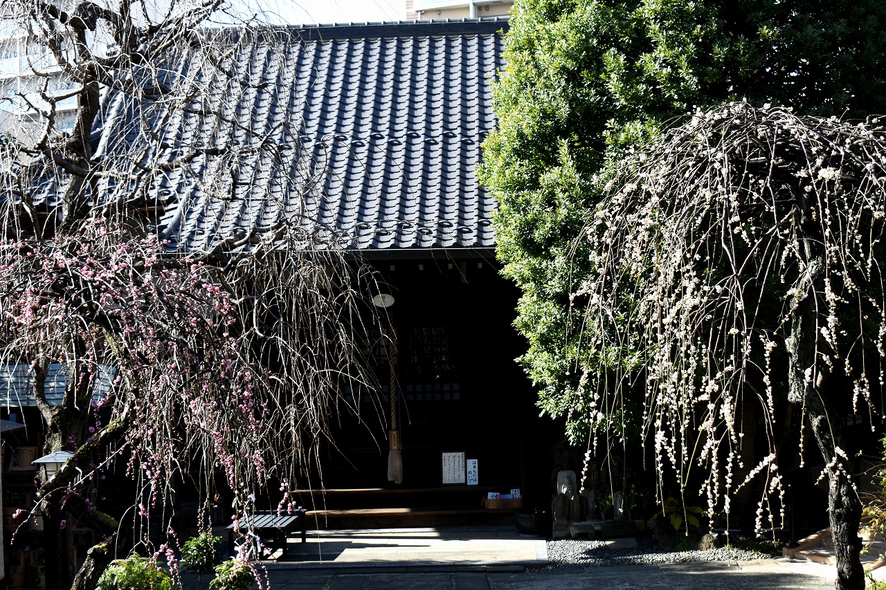 明王院のしだれの梅は白梅から紅梅になっています。二本榎通りにはユキヤナギが咲いていました。證誠寺には本堂の横の紅梅が見頃です。