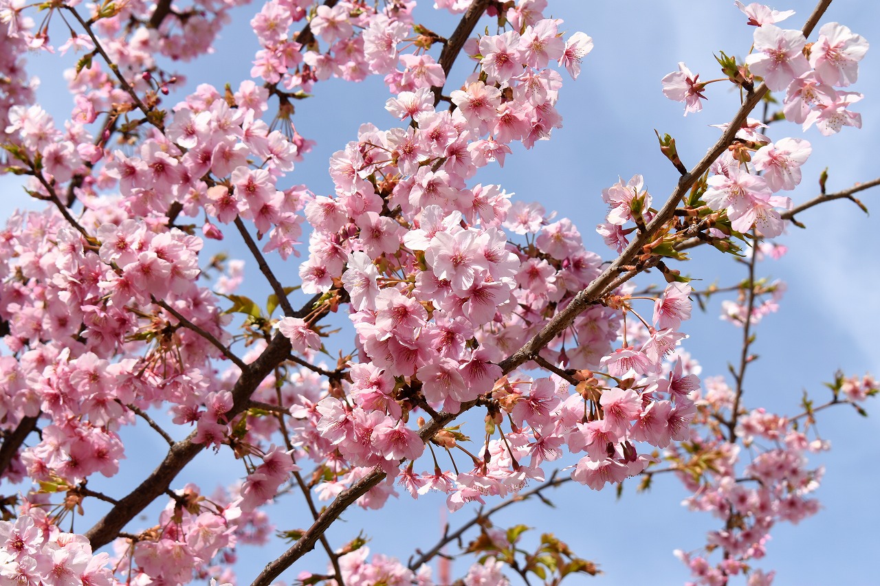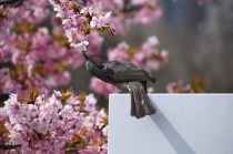 「一言」プリンス芝公園の河津桜は葉が出だしていますが満開で大きな鳥が飛んできています。調べてみるとヒヨドリではないかと思います。
