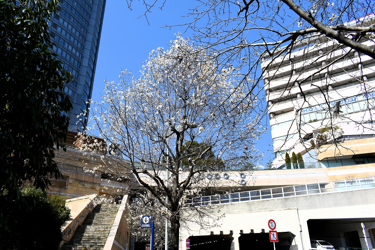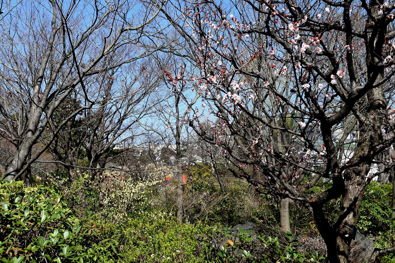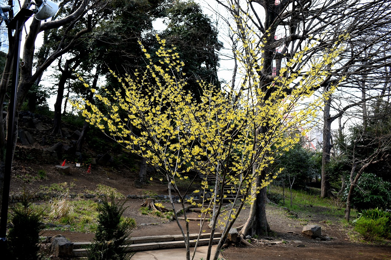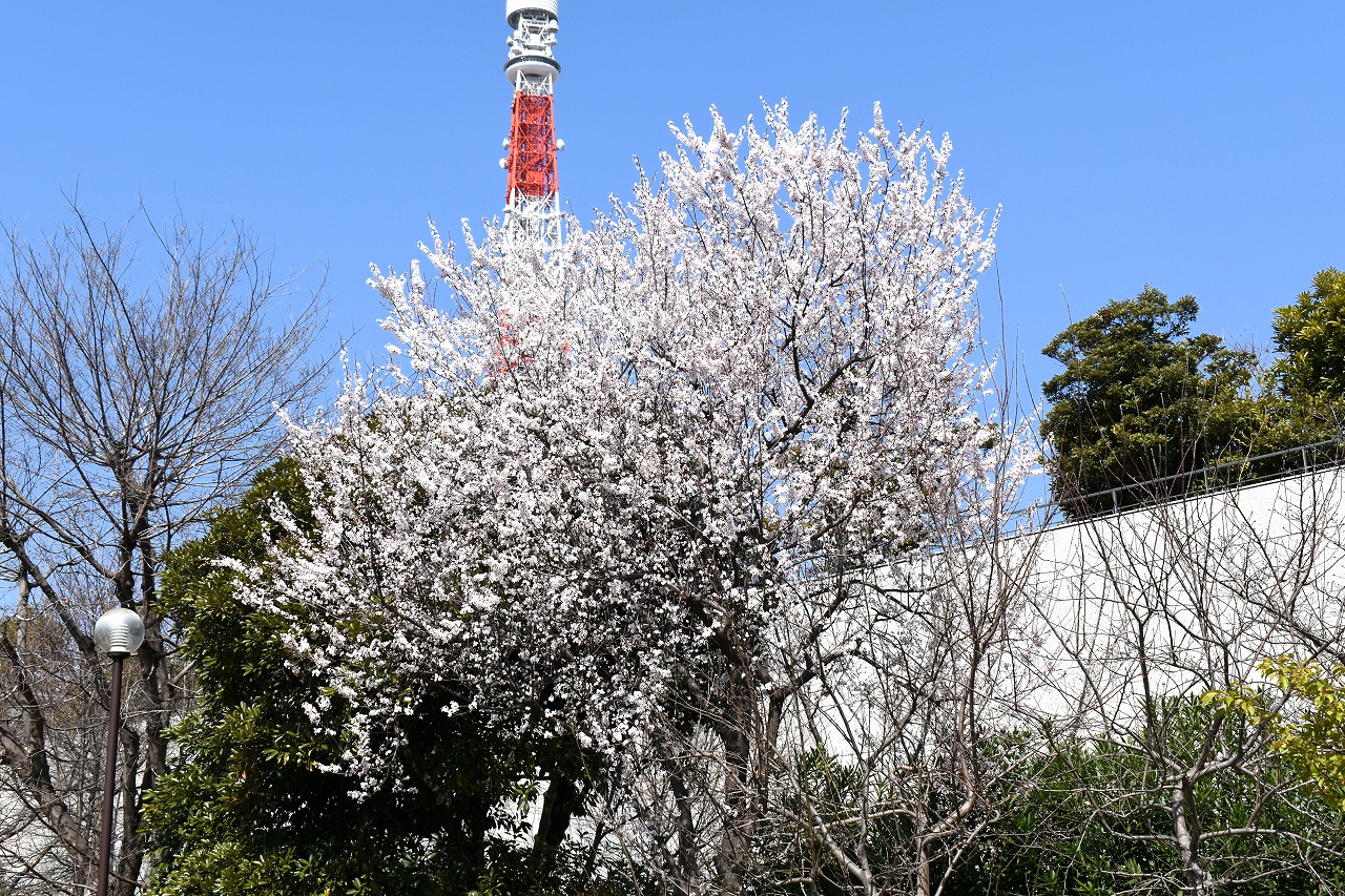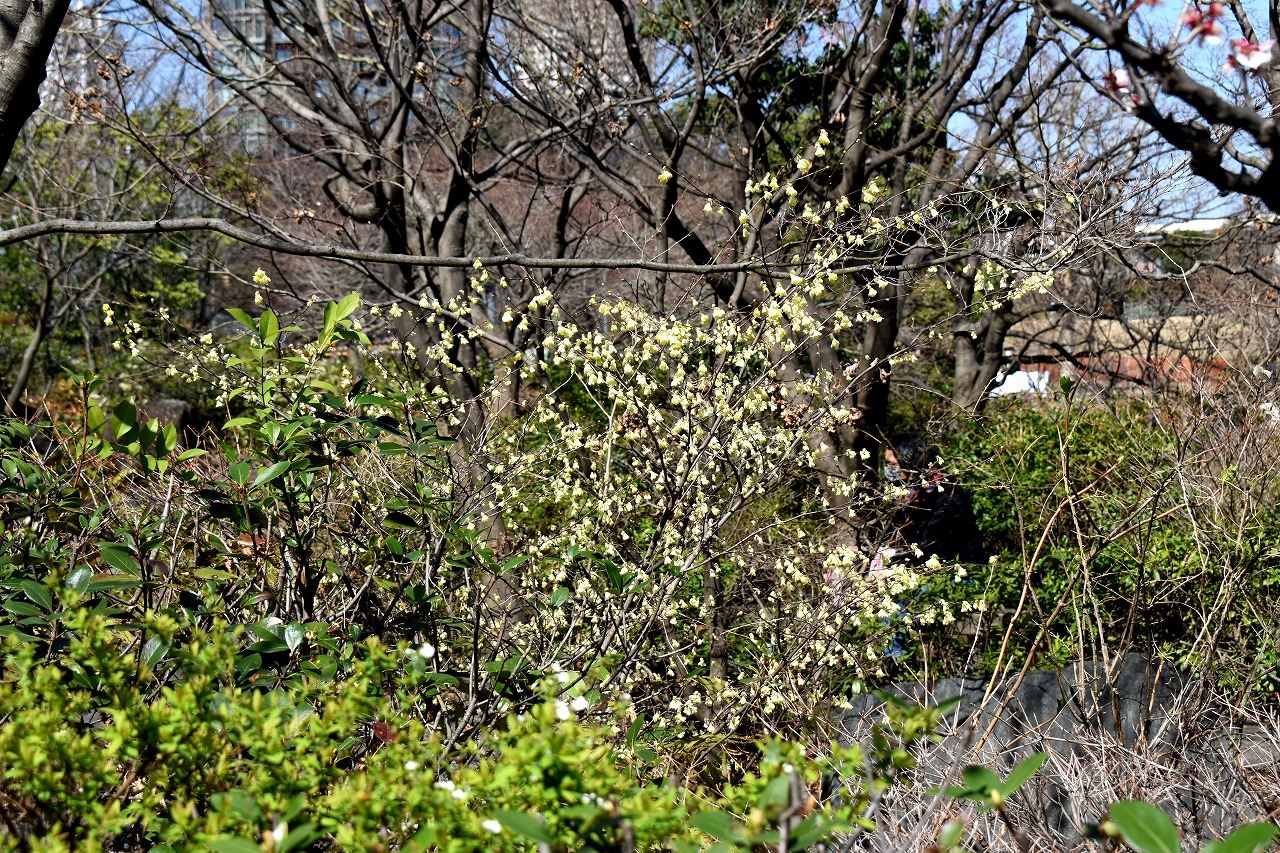 2種類のスモモの木に白い花が満開です。マンサクやサンシュユの黄色い花も見頃です。東京プリンスホテルにはエドヒガンサクラ