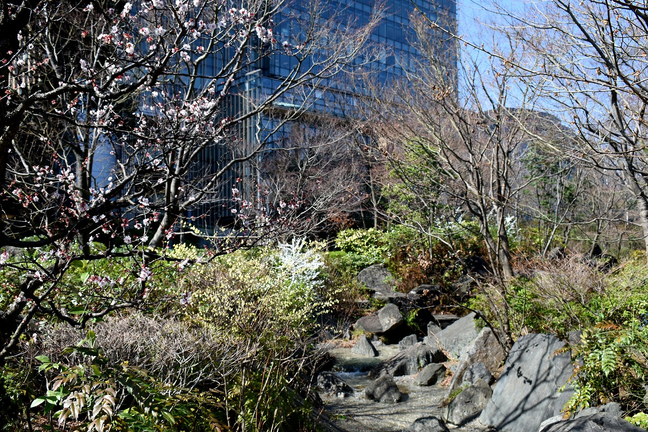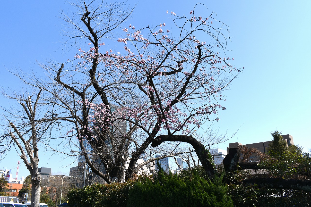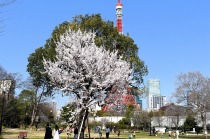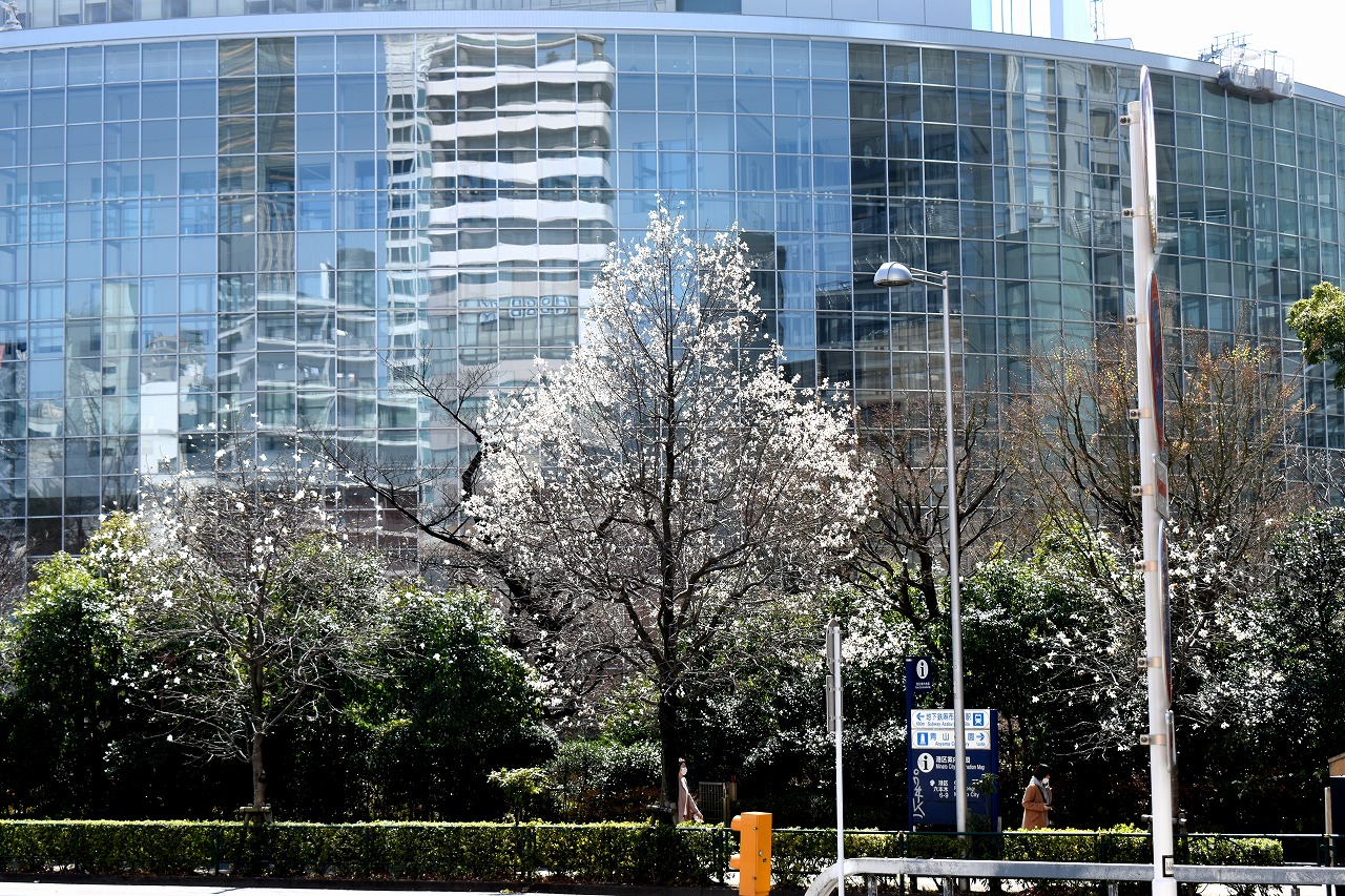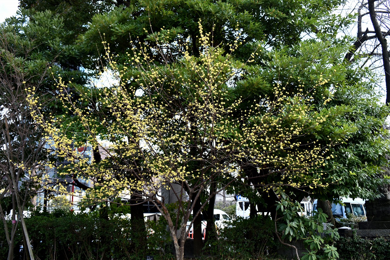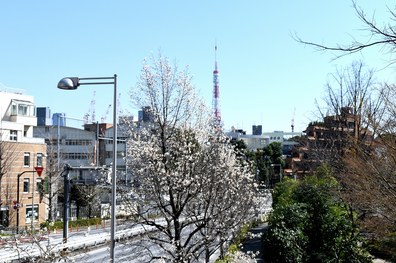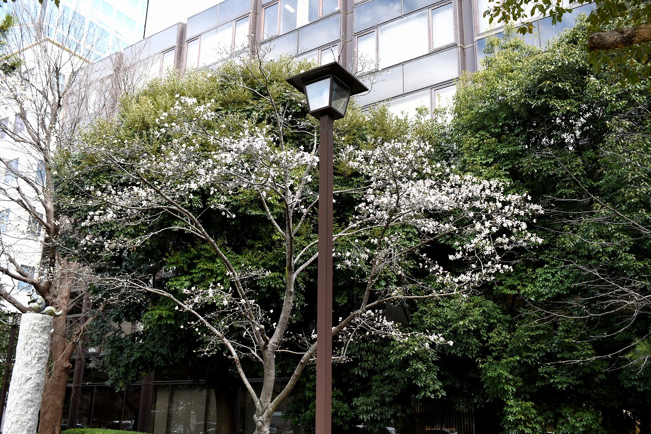 2種類のスモモの木に白い花が満開です。マンサクやサンシュユの黄色い花も見頃です。東京プリンスホテルにはエドヒガンサクラ