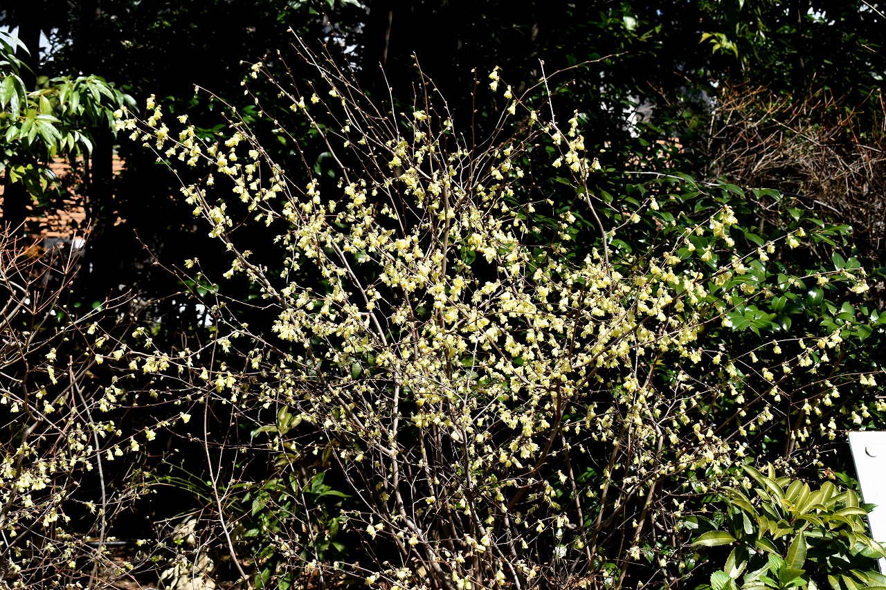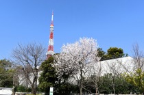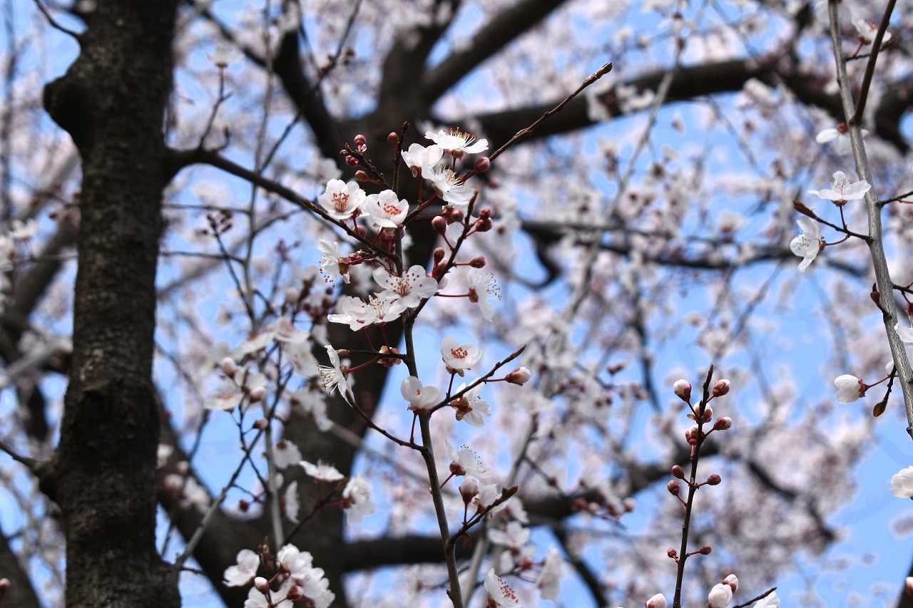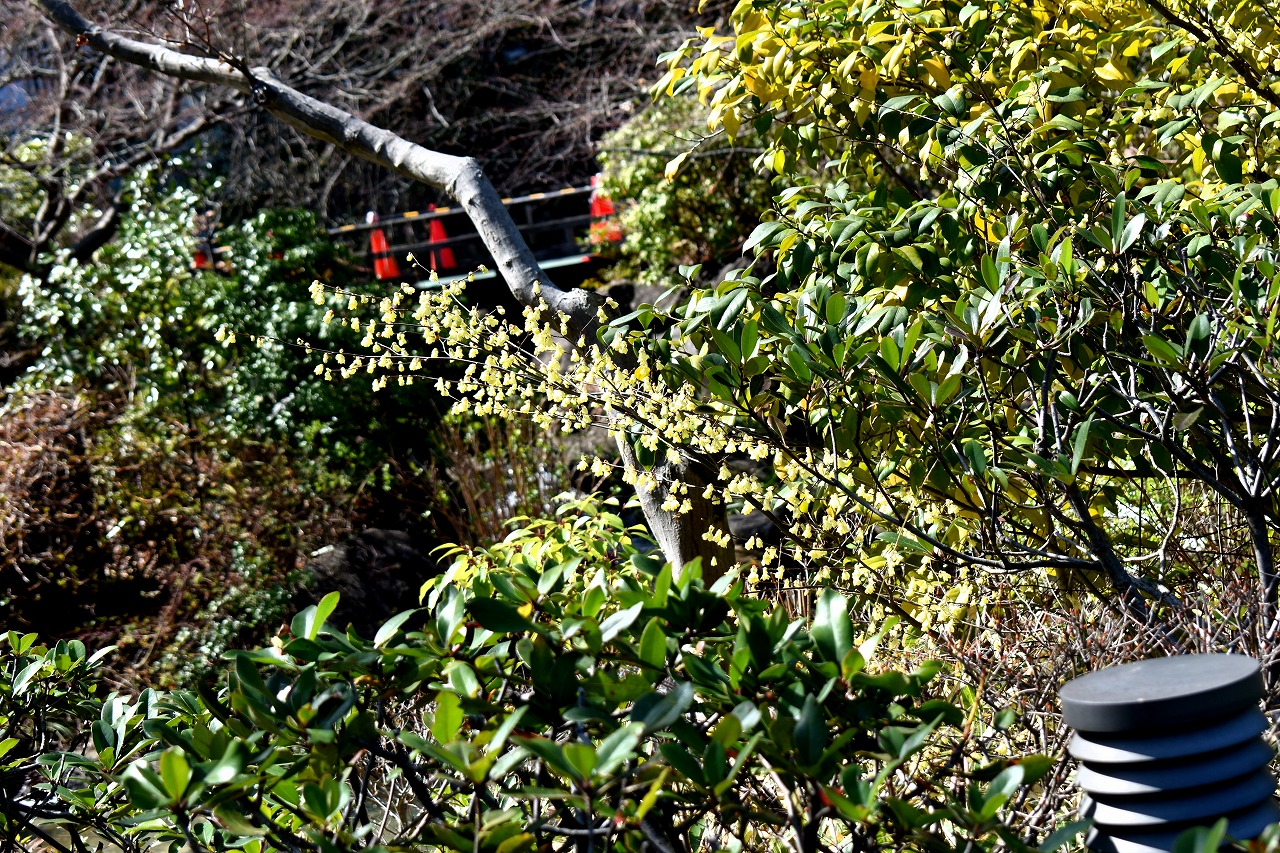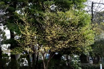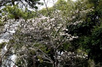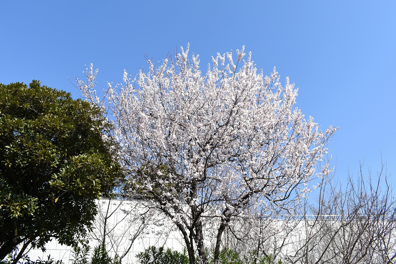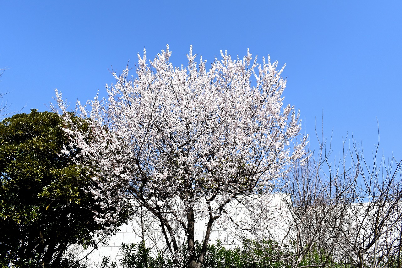 2種類のスモモの木に白い花が満開です。マンサクやサンシュユの黄色い花も見頃です。東京プリンスホテルにはエドヒガンサクラ