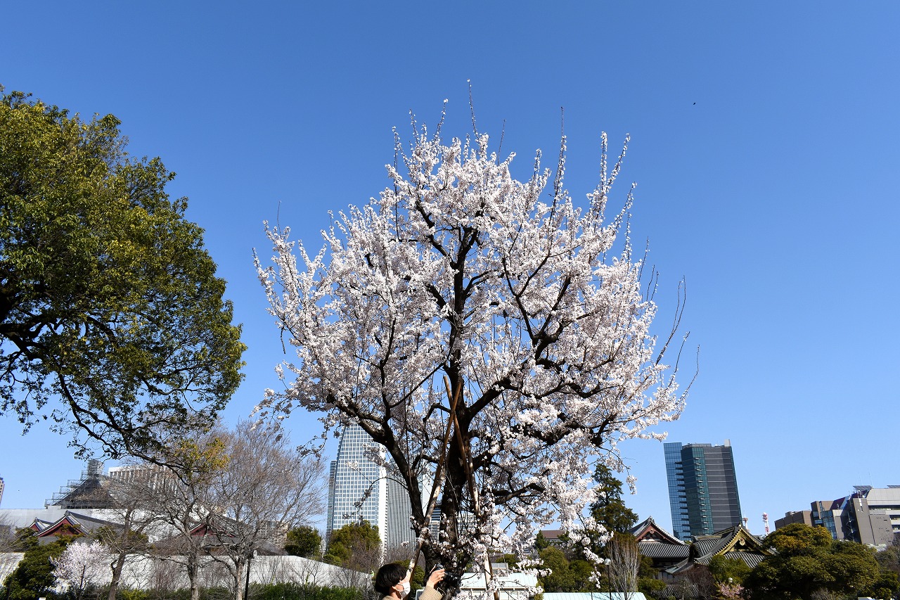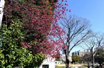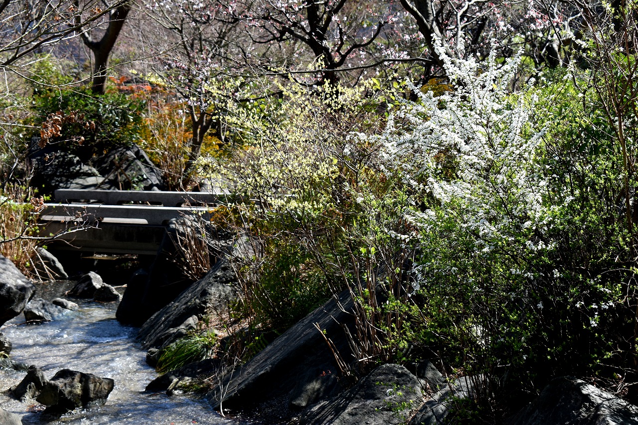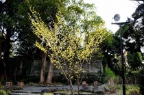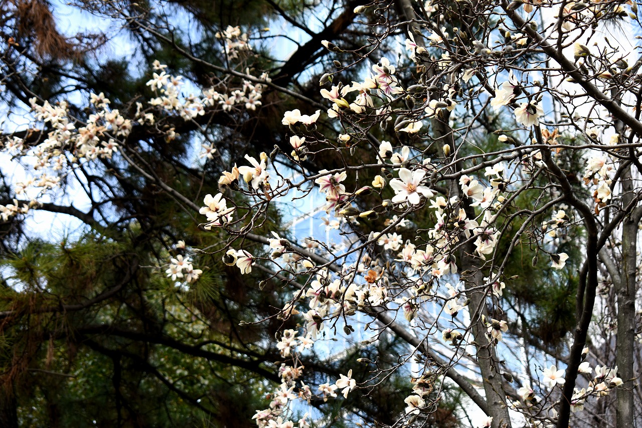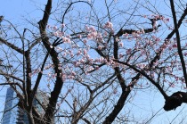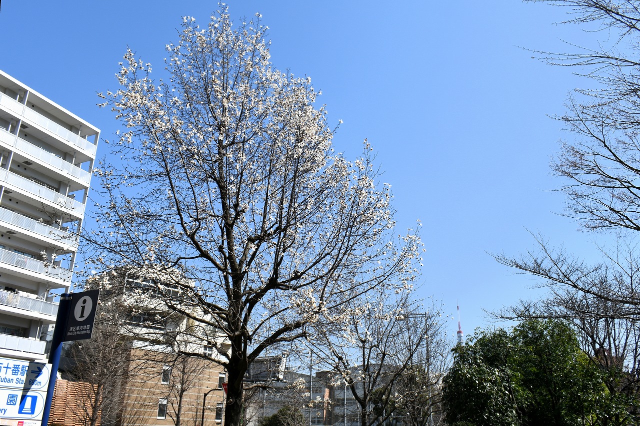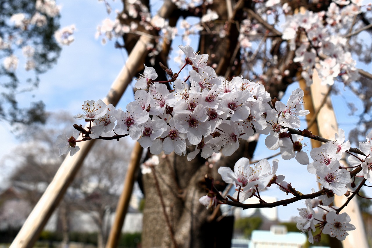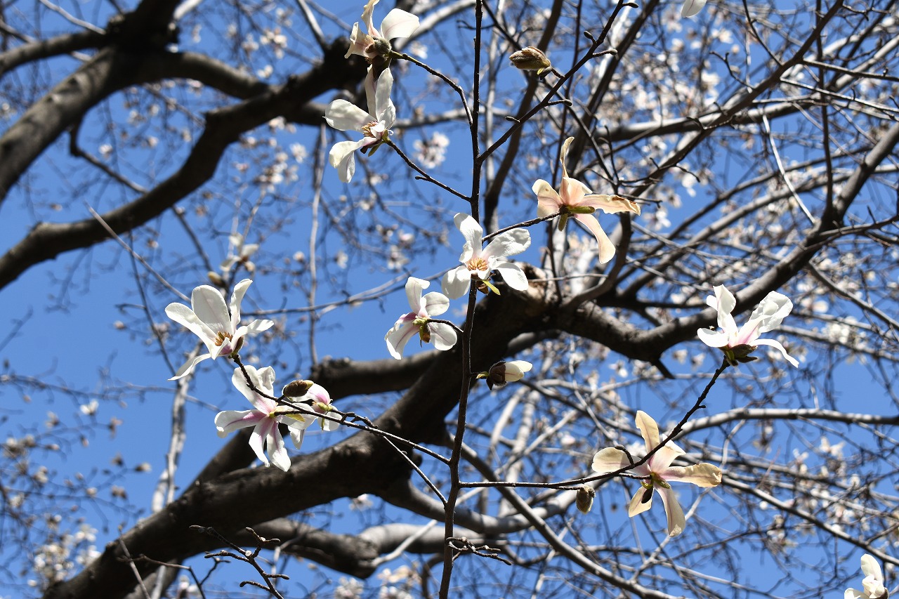 2種類のスモモの木に白い花が満開です。マンサクやサンシュユの黄色い花も見頃です。東京プリンスホテルにはエドヒガンサクラ