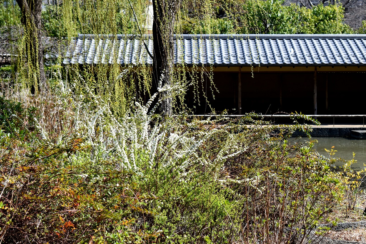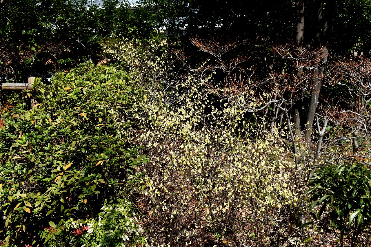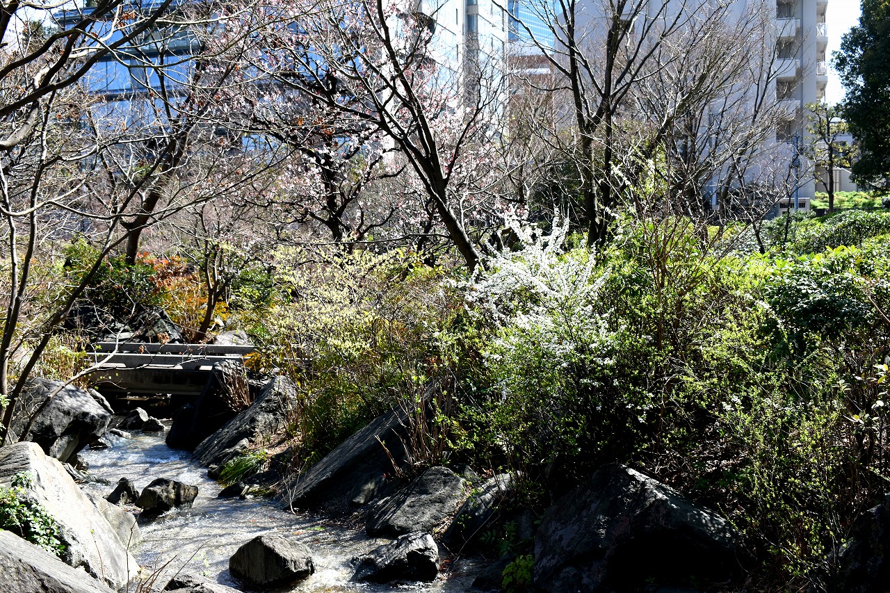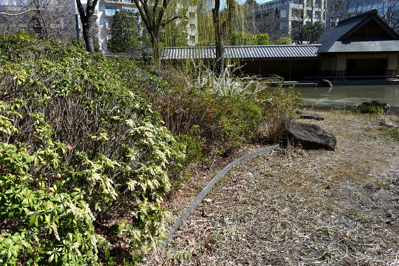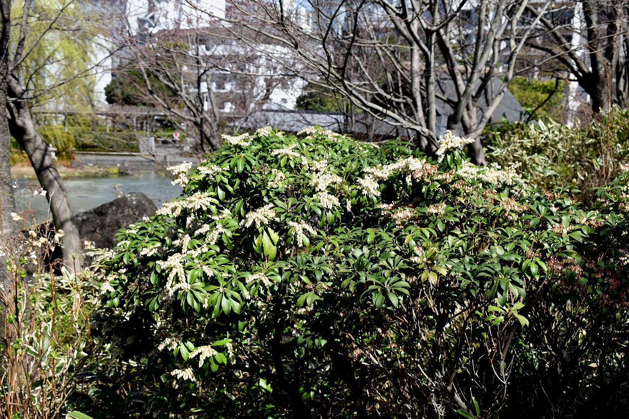 に新芽が出て綺麗な緑色です。毛利庭園の横の道にはコブシが咲き綺麗です。アセビやヒュウガミズキも咲いています。