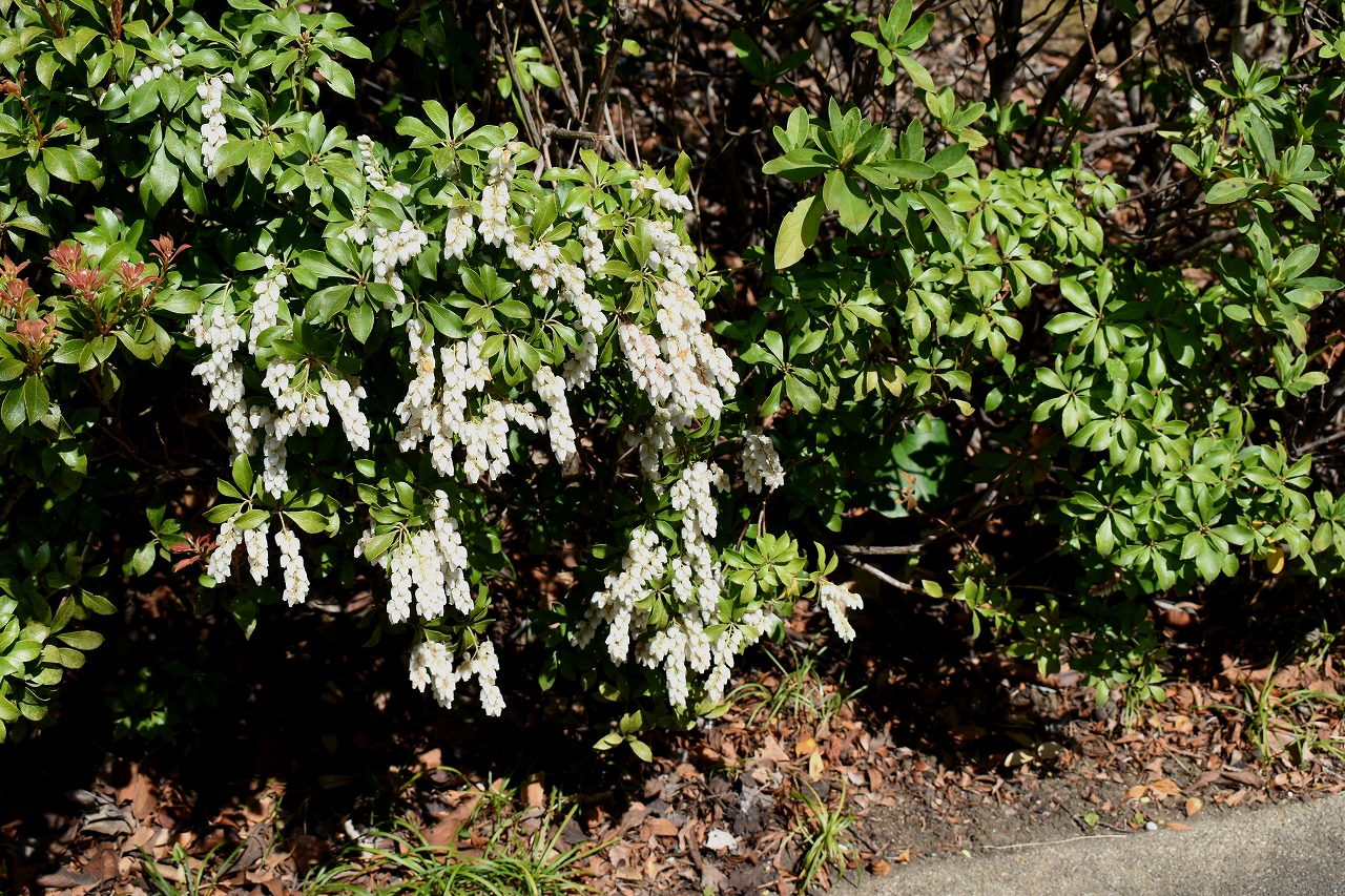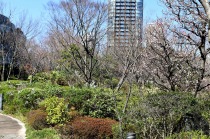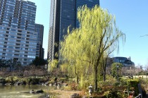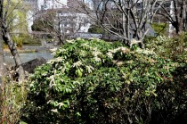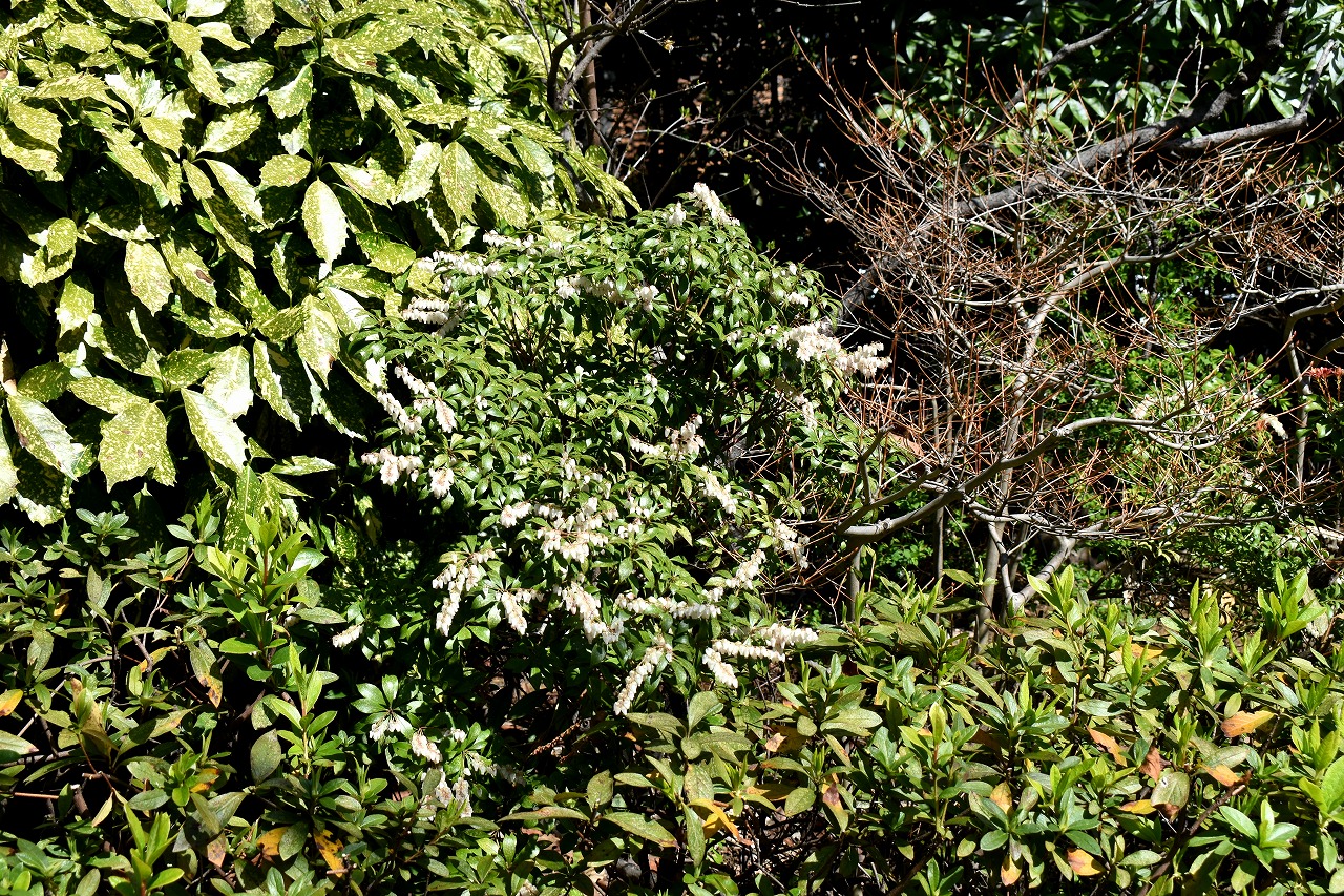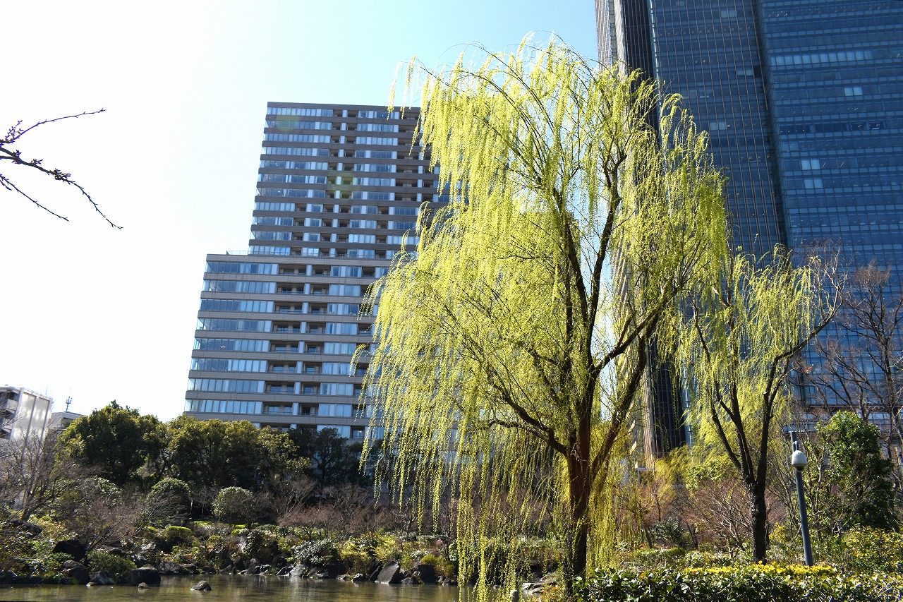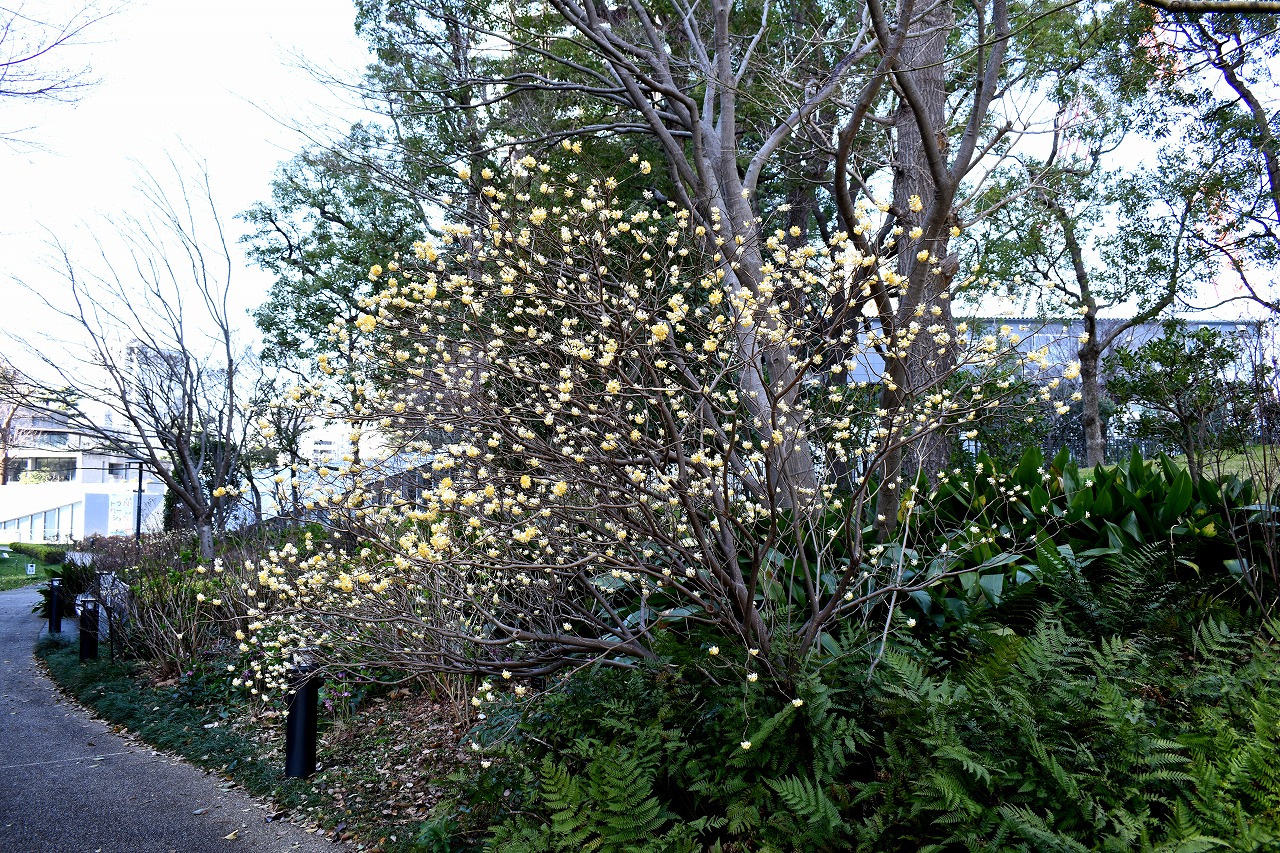 に新芽が出て綺麗な緑色です。毛利庭園の横の道にはコブシが咲き綺麗です。アセビやヒュウガミズキも咲いています。