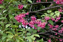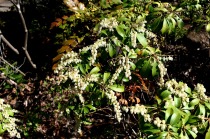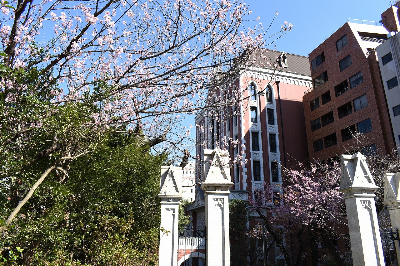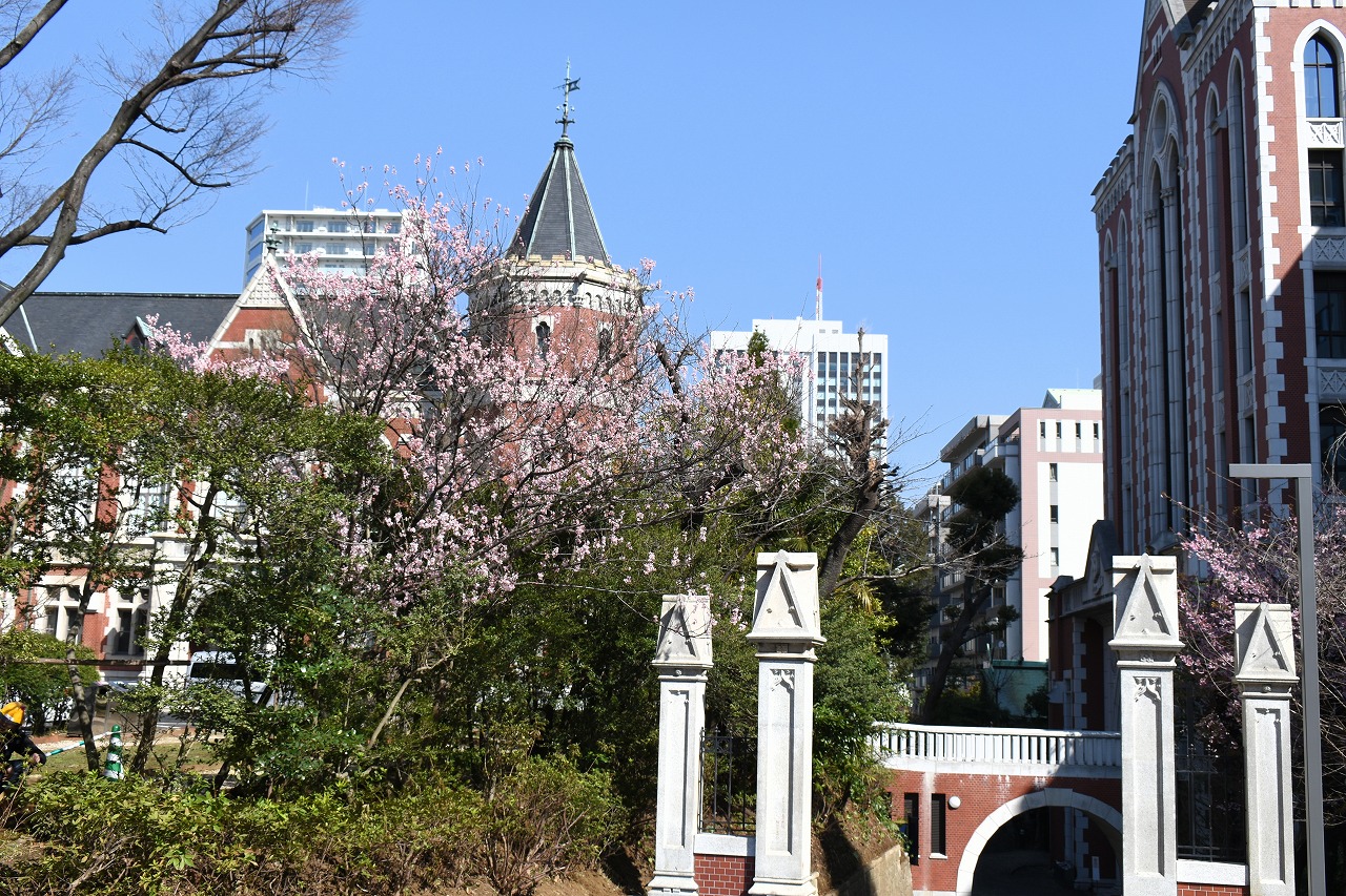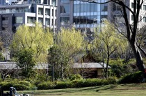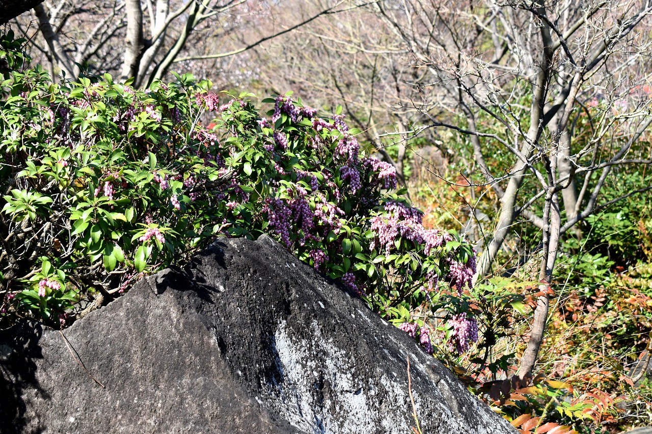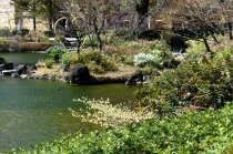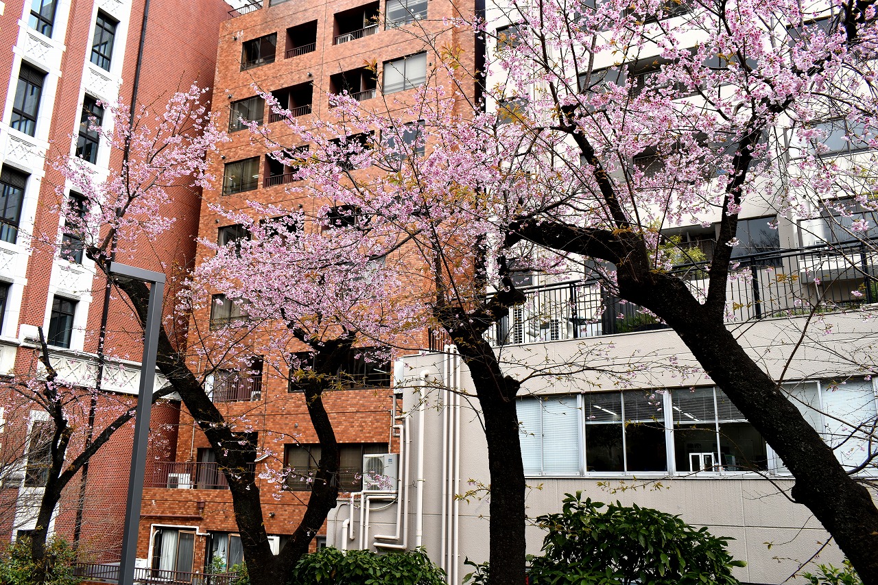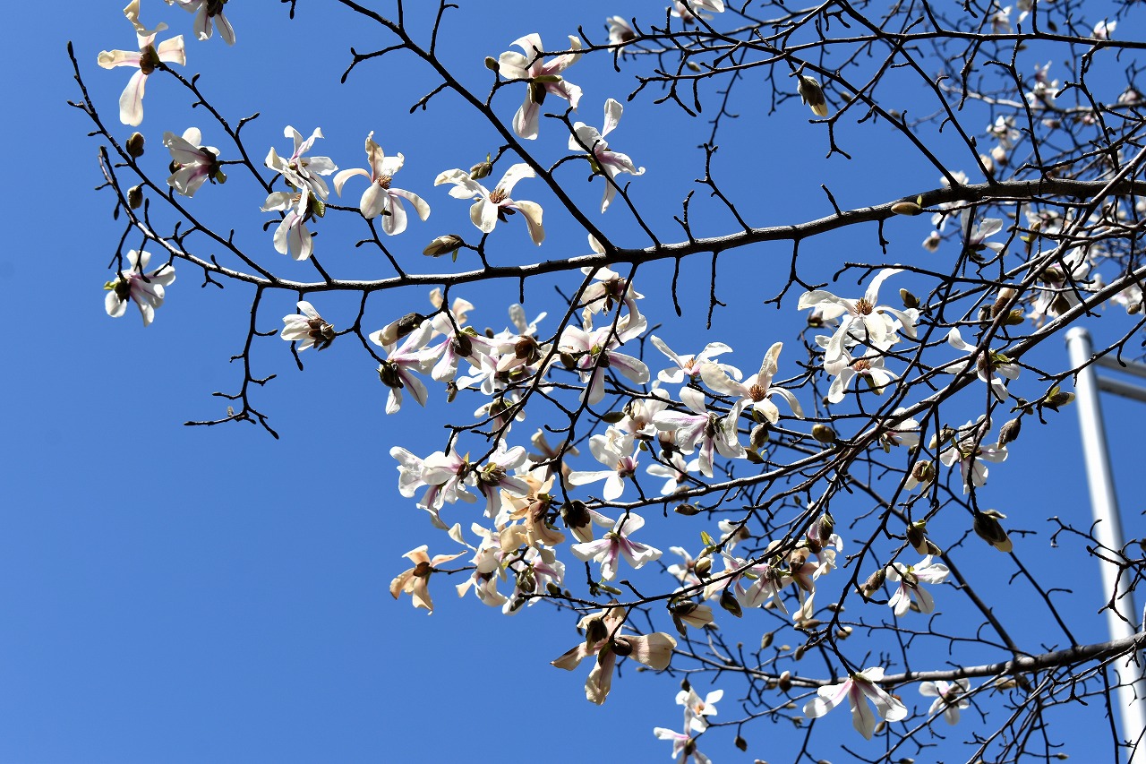 に新芽が出て綺麗な緑色です。毛利庭園の横の道にはコブシが咲き綺麗です。アセビやヒュウガミズキも咲いています。