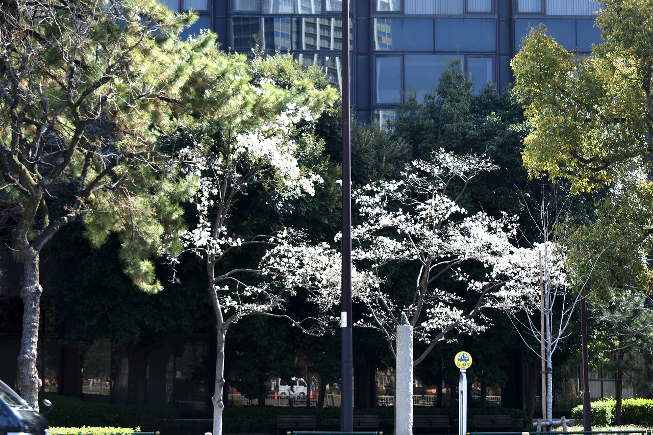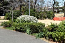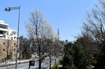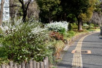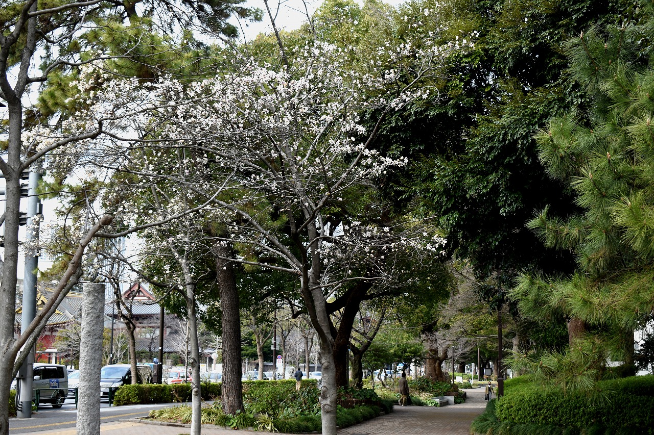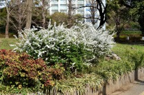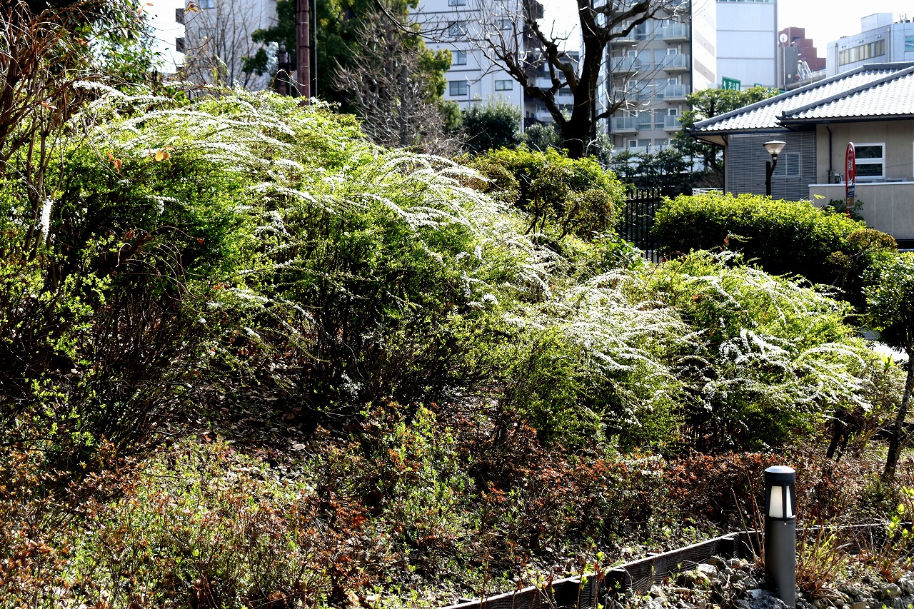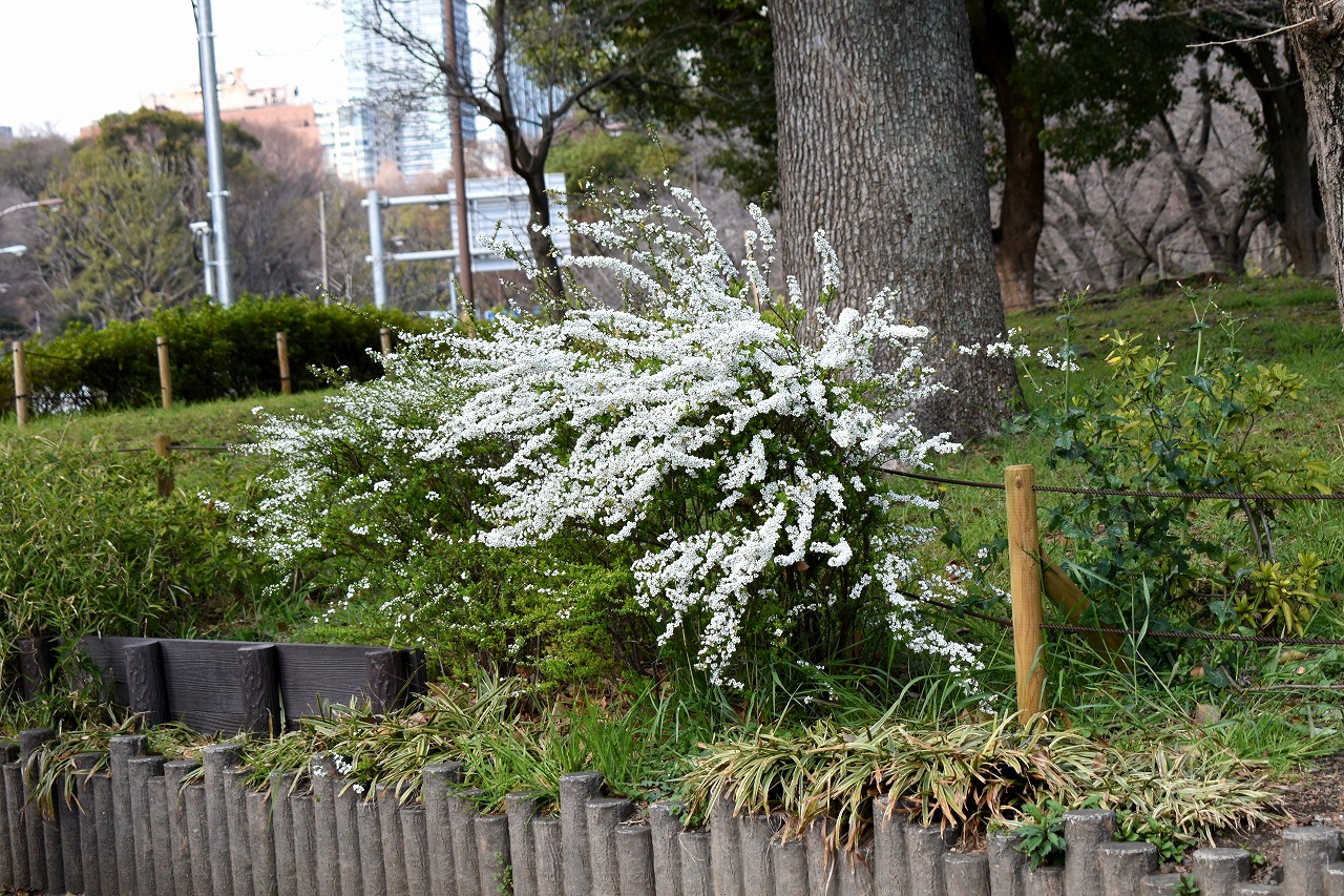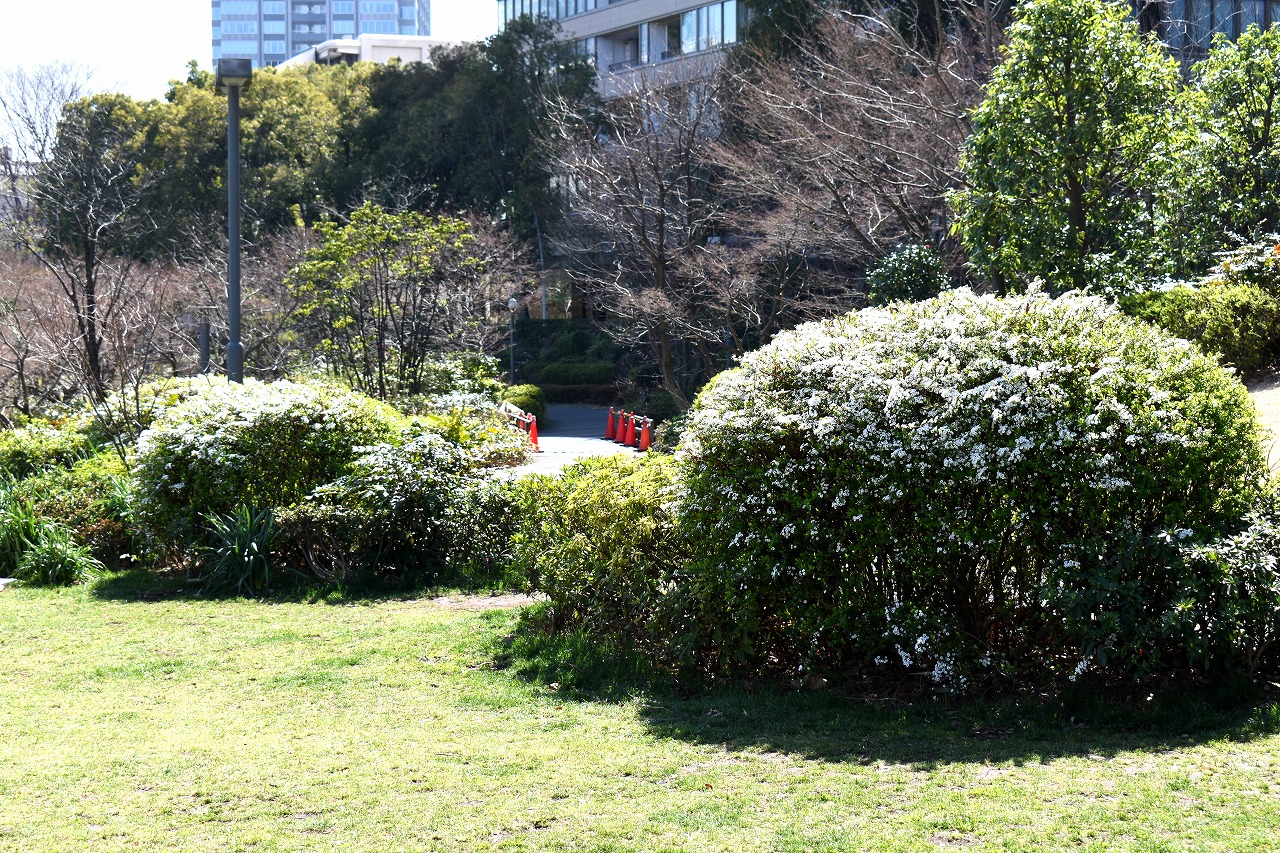 「一言」芝公園の前の通りにはコブシの大きな木に白い花がいっぱい咲いています。芝公園にはあちこちにユキヤナギが咲いています。