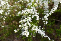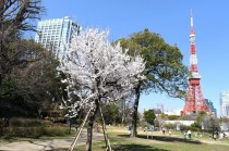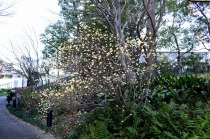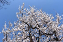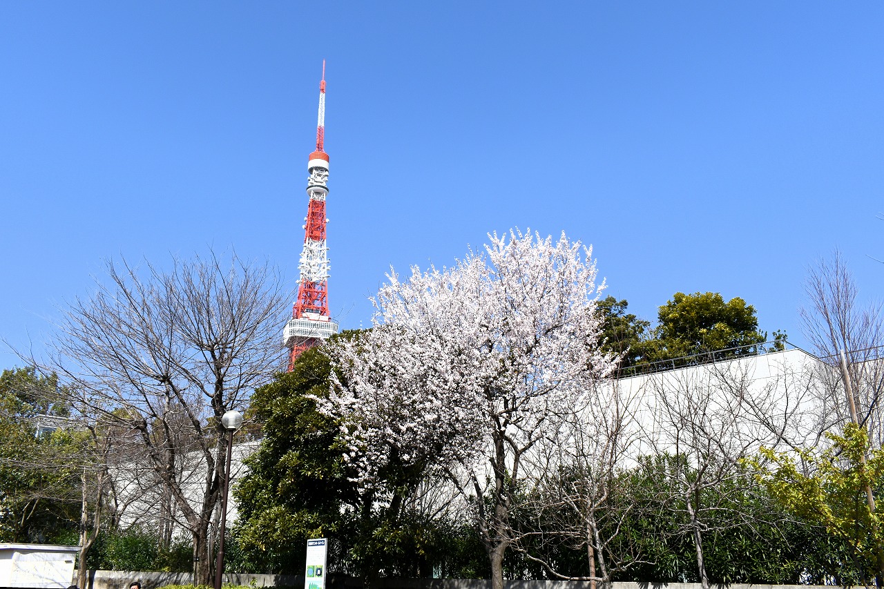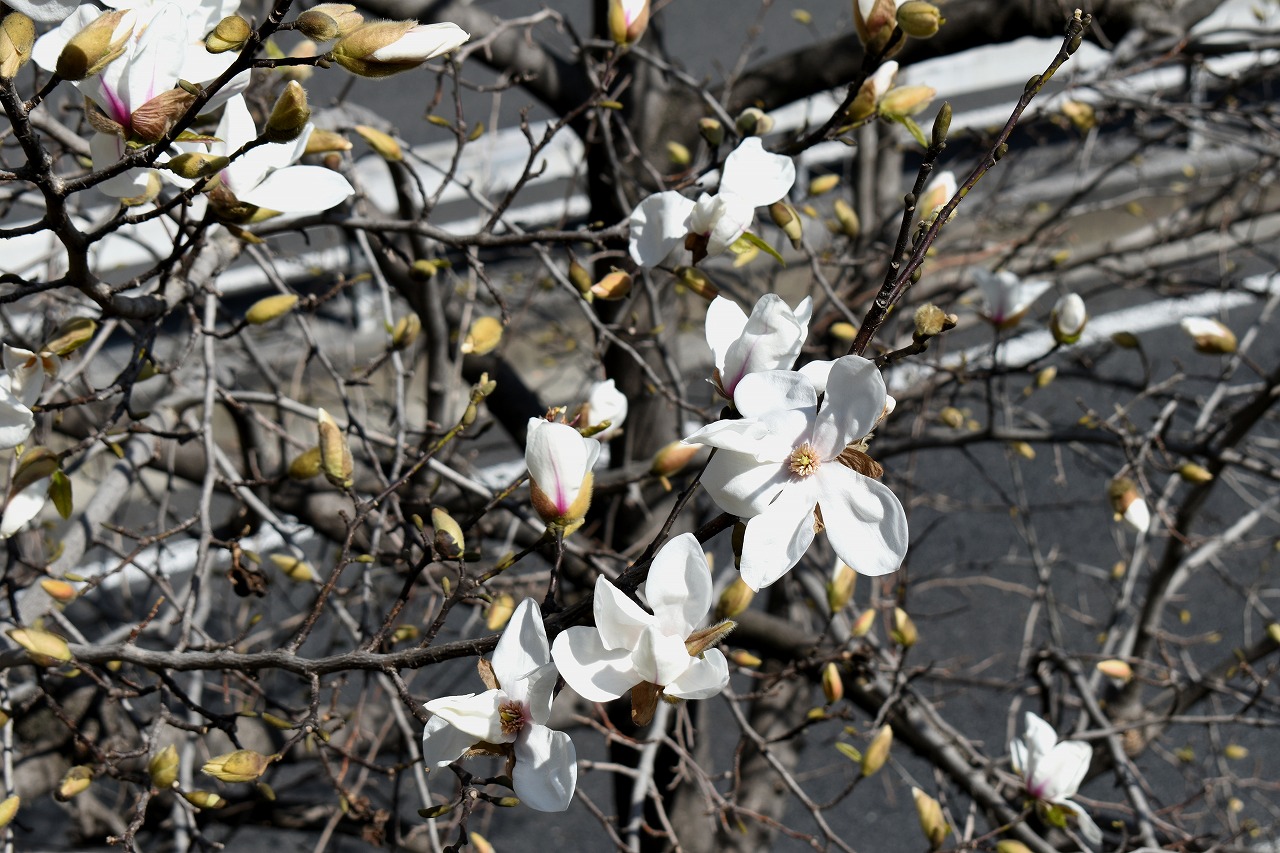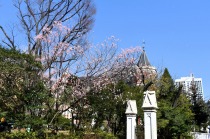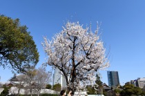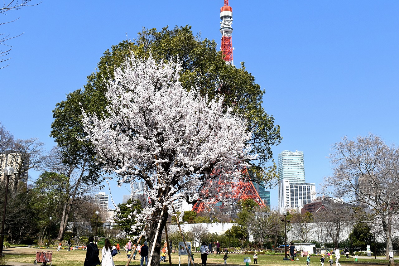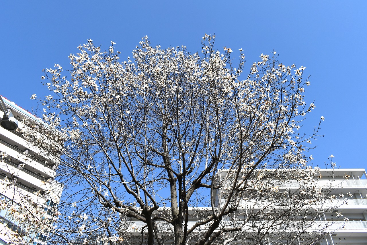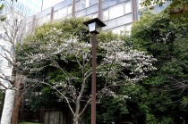 「一言」芝公園の前の通りにはコブシの大きな木に白い花がいっぱい咲いています。芝公園にはあちこちにユキヤナギが咲いています。