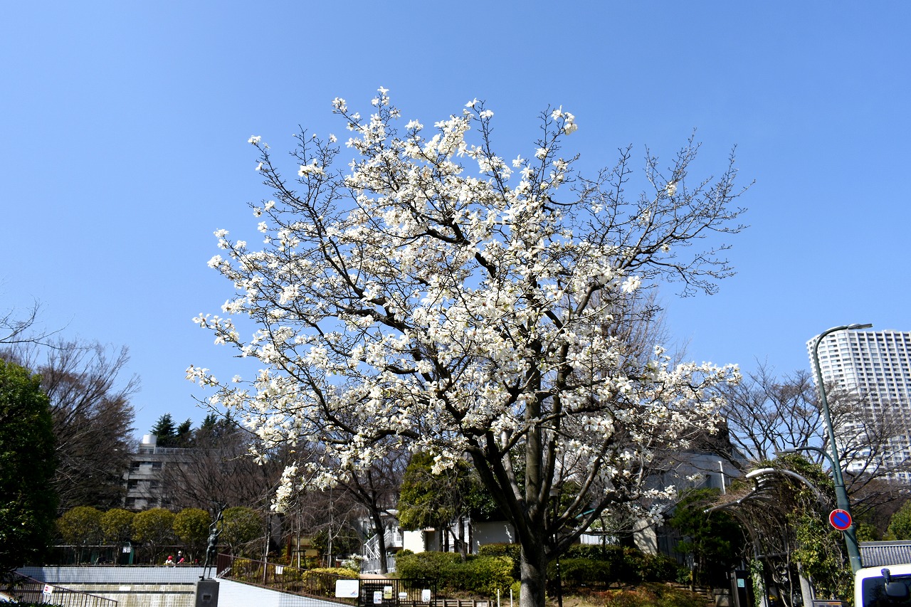 「一言」高輪公園のコブシが満開になりました。高輪プリンスホテルには彼岸桜が満開です。ハナモモも真っ赤な花を咲かせています。 どんぐり児童遊園のしだれ桜が咲き出して見頃になってきました。ユキヤナギも大きくなり迫力があります。東京都庭園美術館や 北里病院のコブシもさくぃています。
