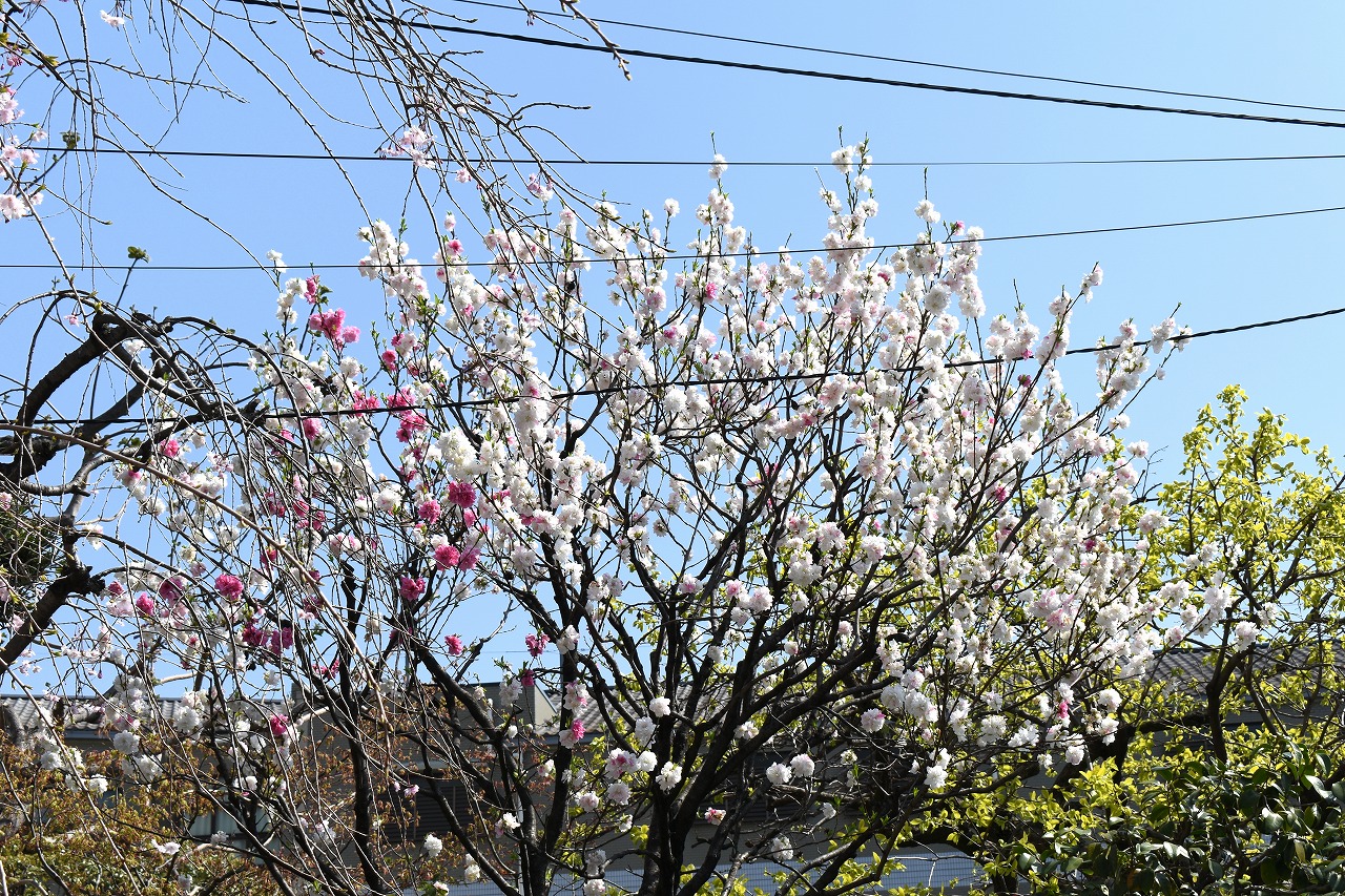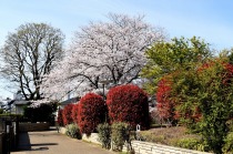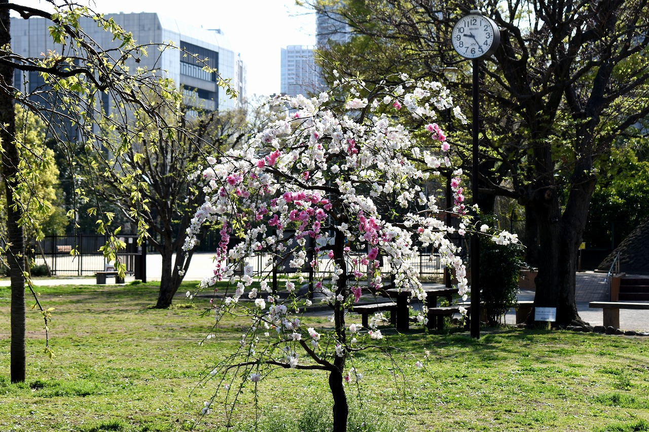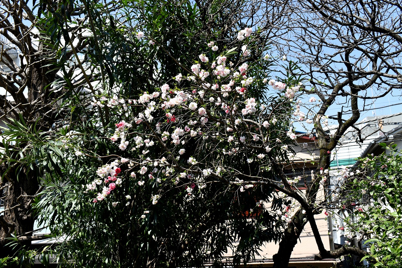 三田台児童遊園には色々なハナモモが咲いています。チャンチンの大きな木の葉も赤く色づいています。泉岳寺の桜の木々も見頃です。