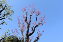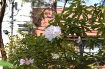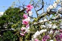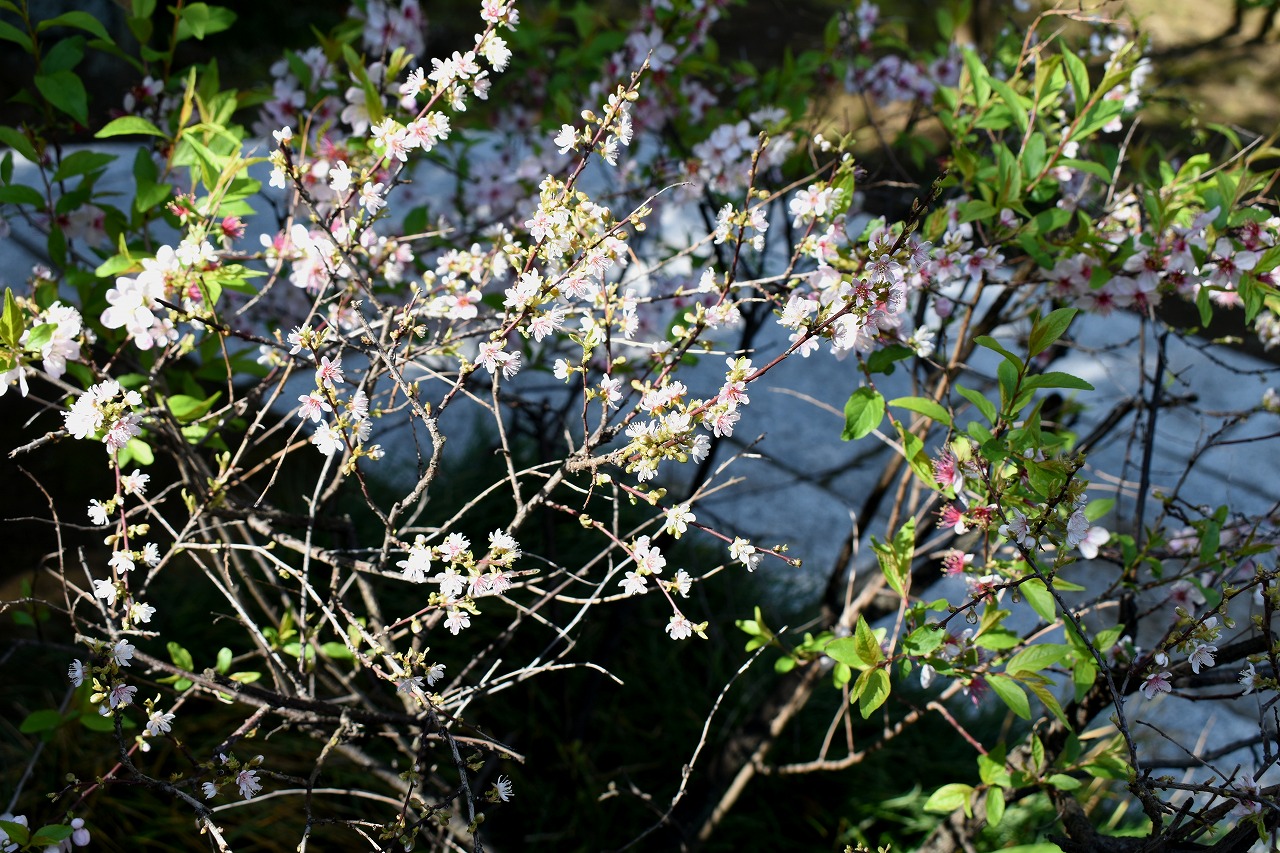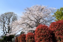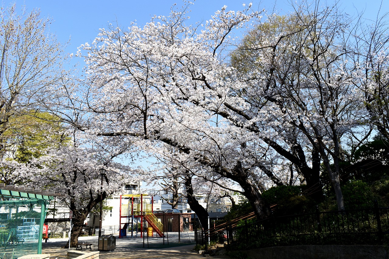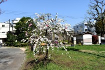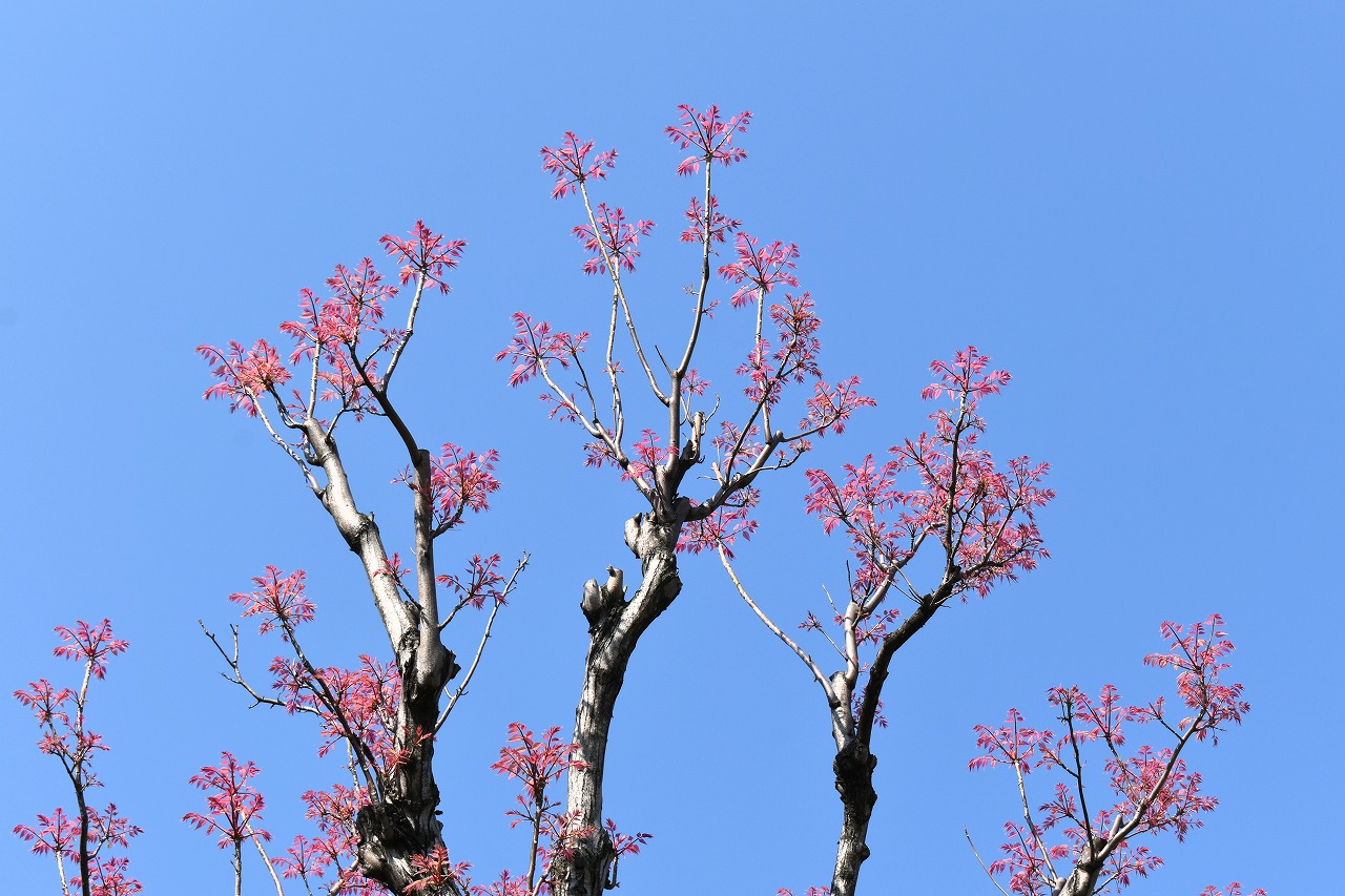 三田台児童遊園には色々なハナモモが咲いています。チャンチンの大きな木の葉も赤く色づいています。泉岳寺の桜の木々も見頃です。