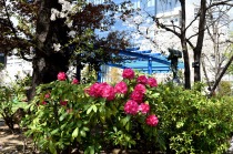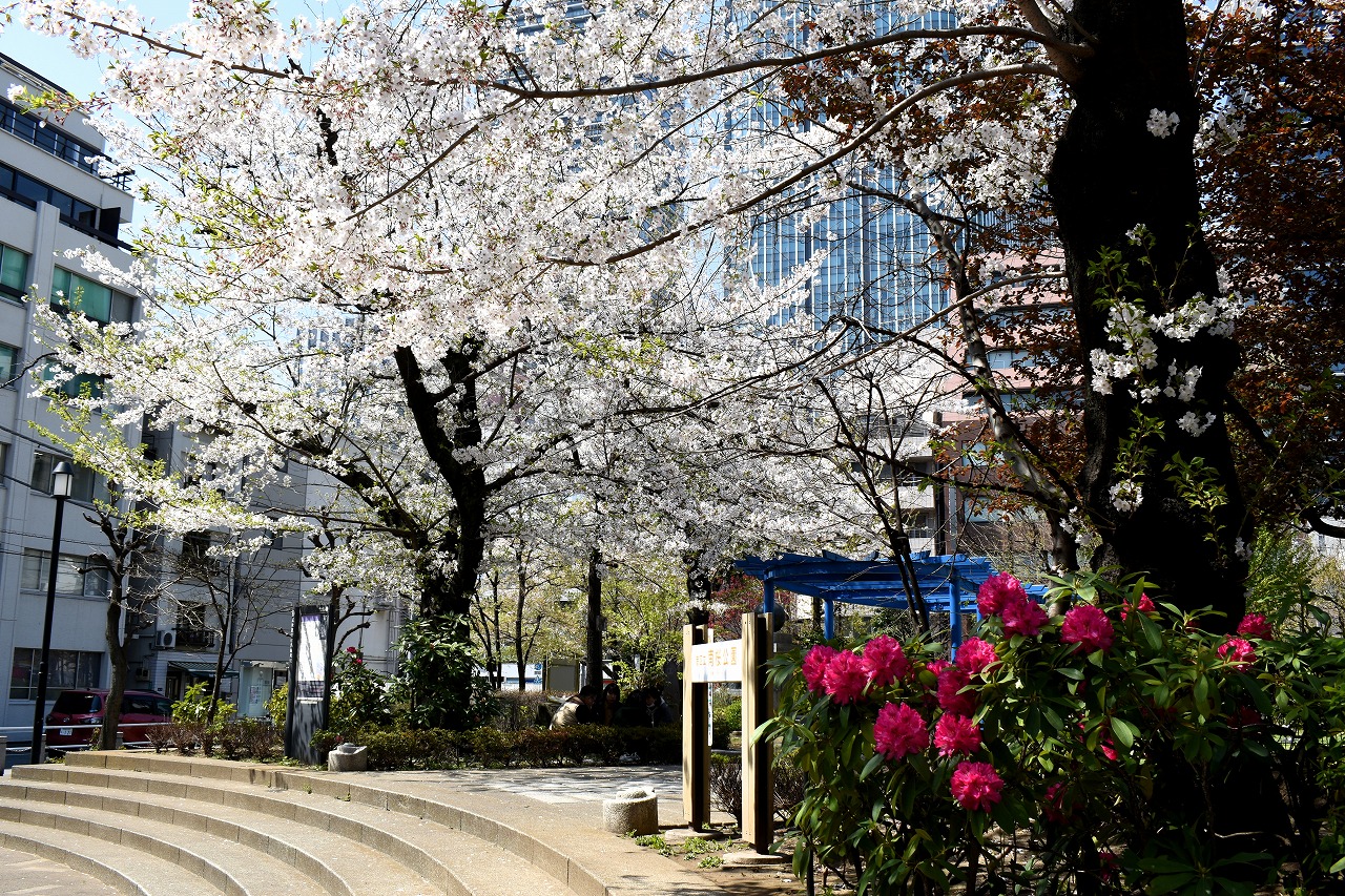 桜の花のトンネルに下を多くの人が歩いています。南桜公園にも桜が咲き、シャクナゲが咲いています。有栖川公園には