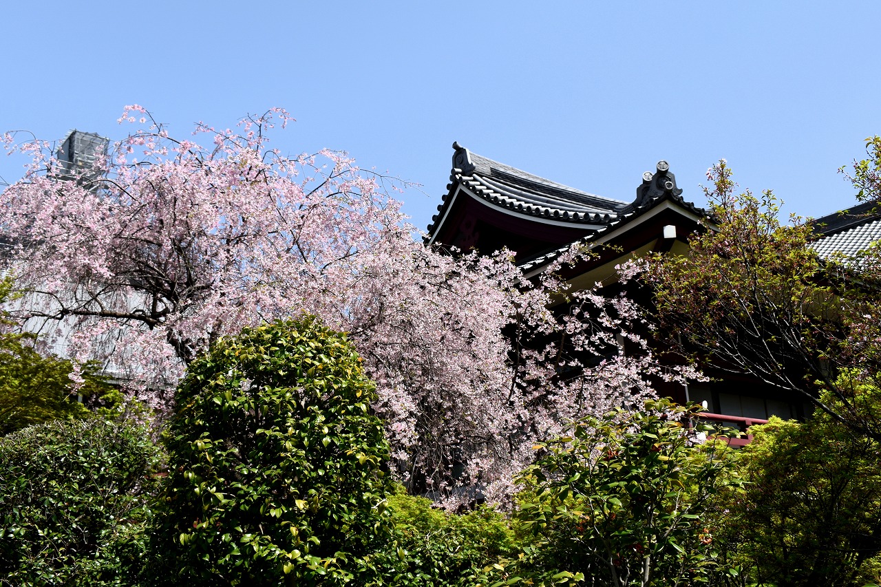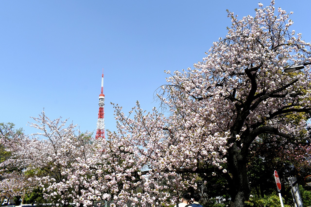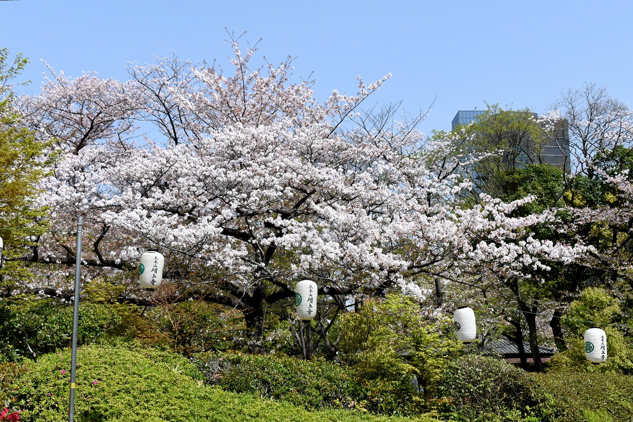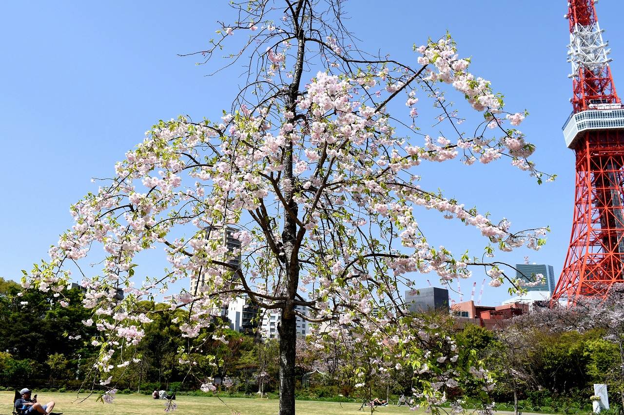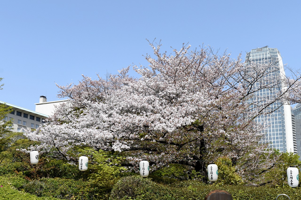 増上寺にも大きな桜の木が満開です。本堂裏のしだれ桜も見頃になっており風情があります。芝公園にはシャクナゲやアイリス、