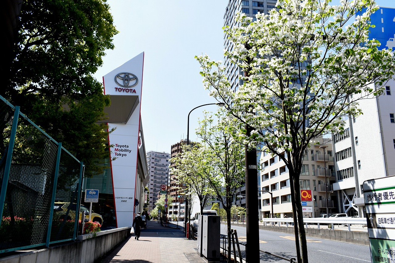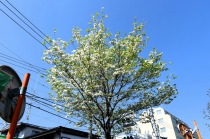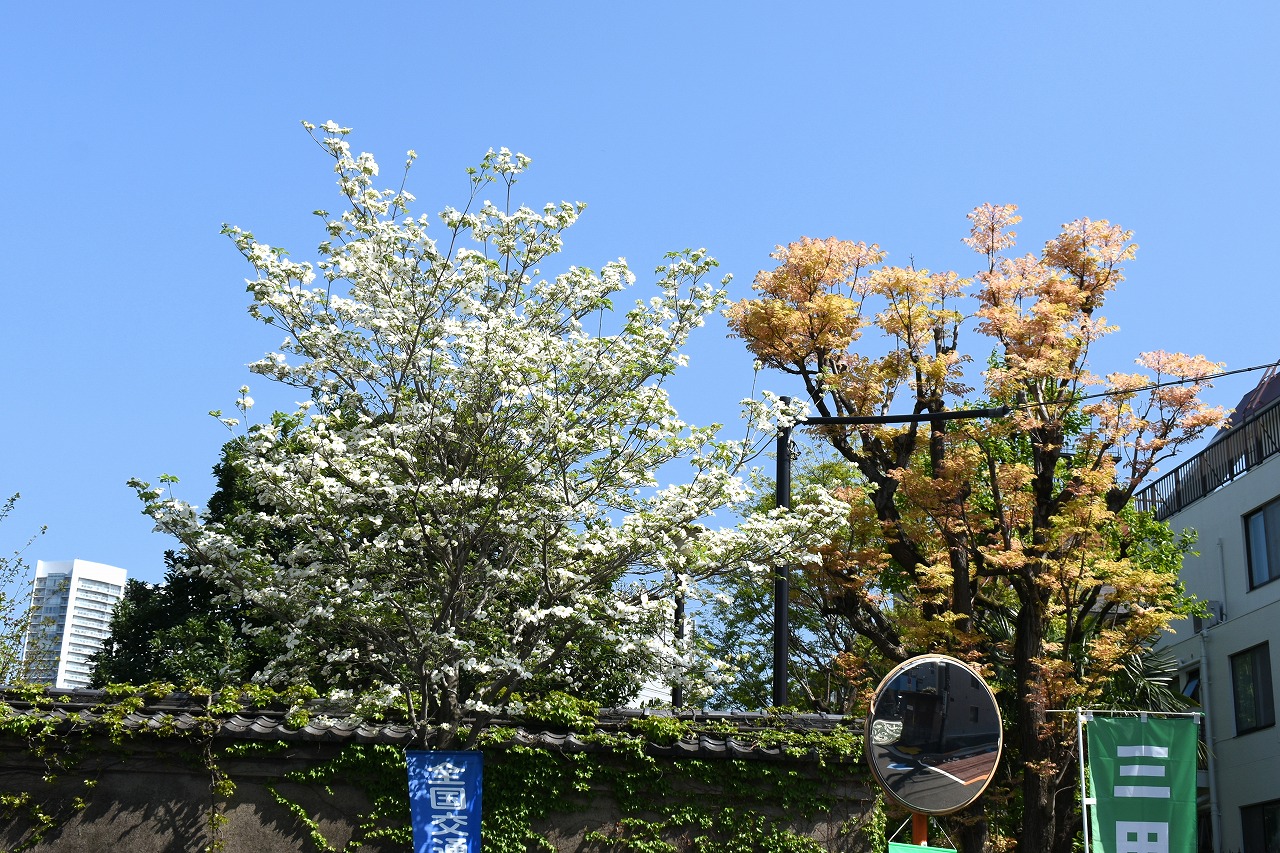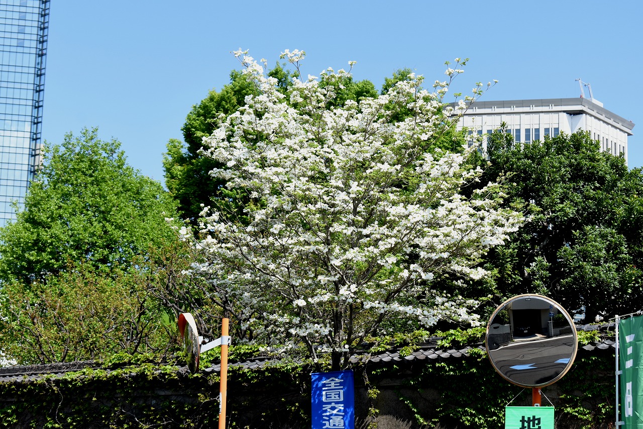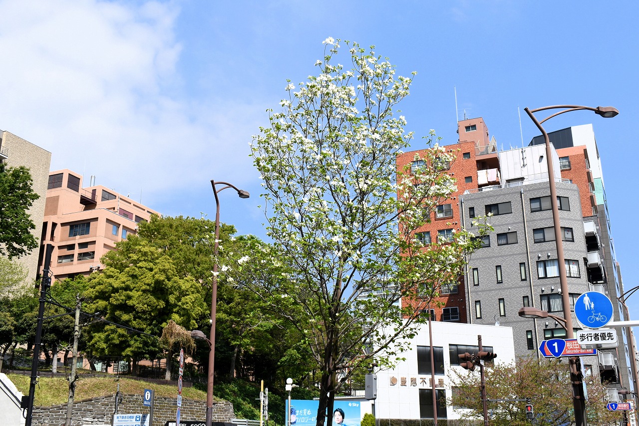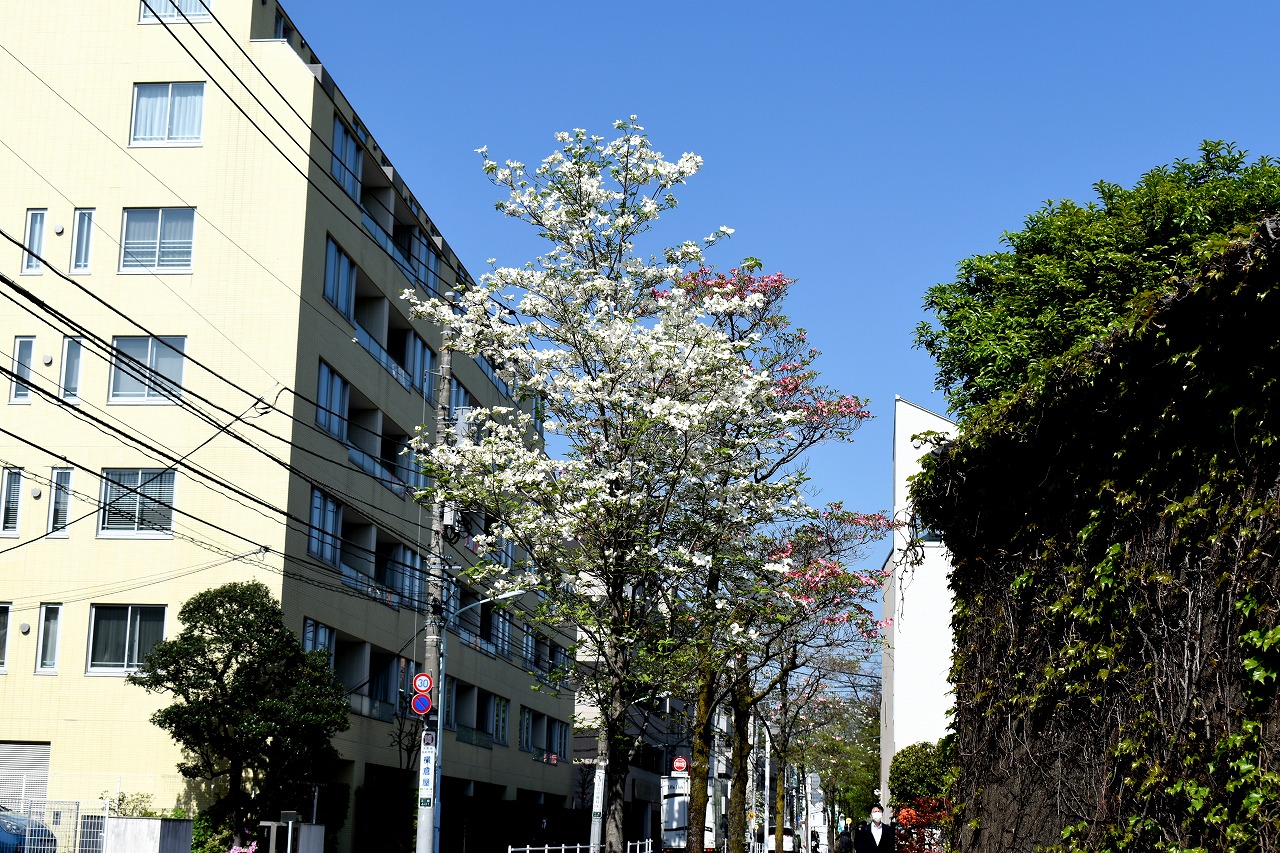 「一言」日吉坂からどんぐり児童遊園にかけての目黒通りのハナミズキに白い花が咲き出して綺麗です。医科研やプラチナ通リの