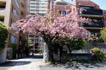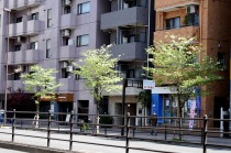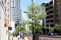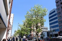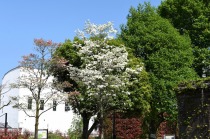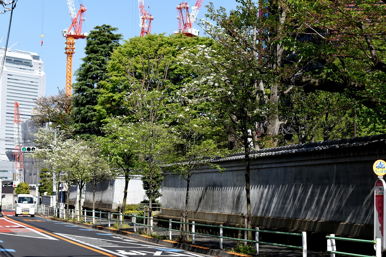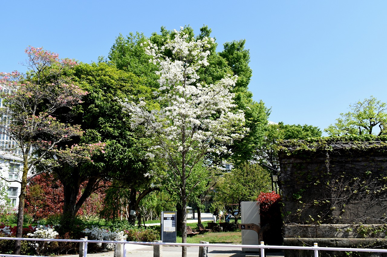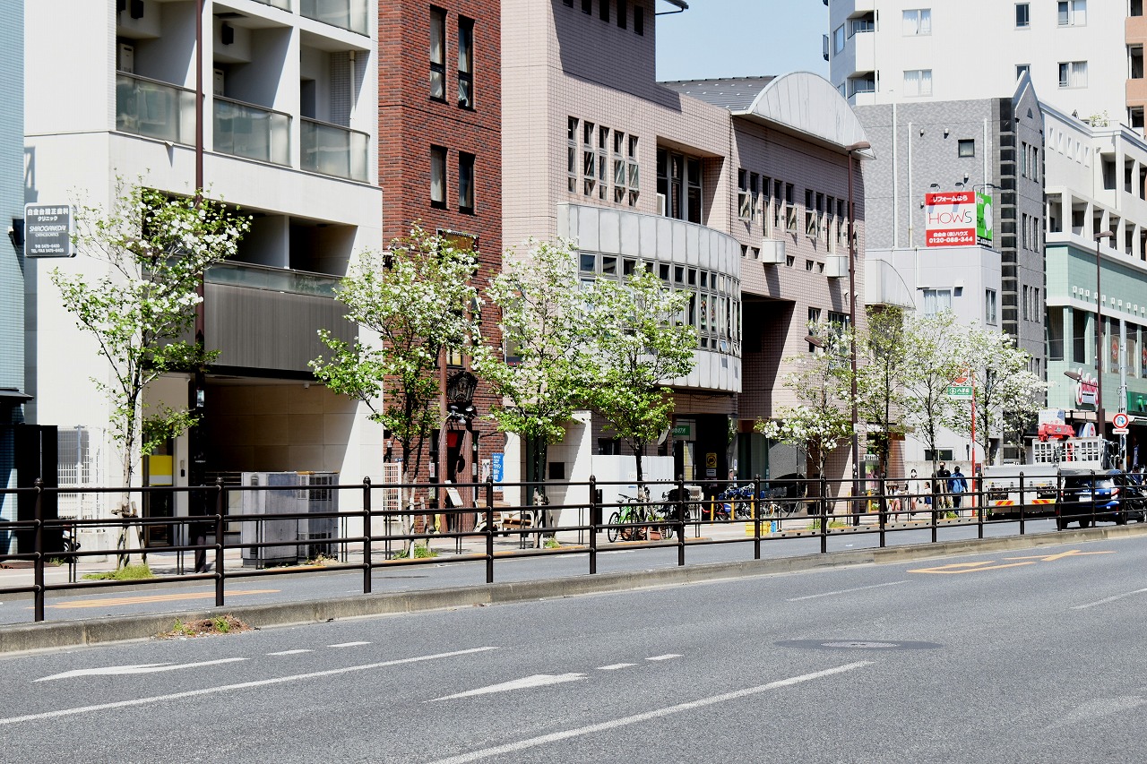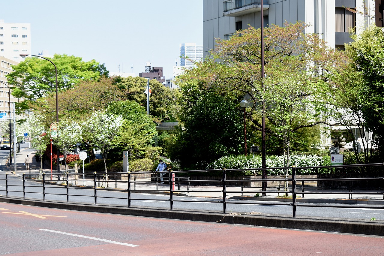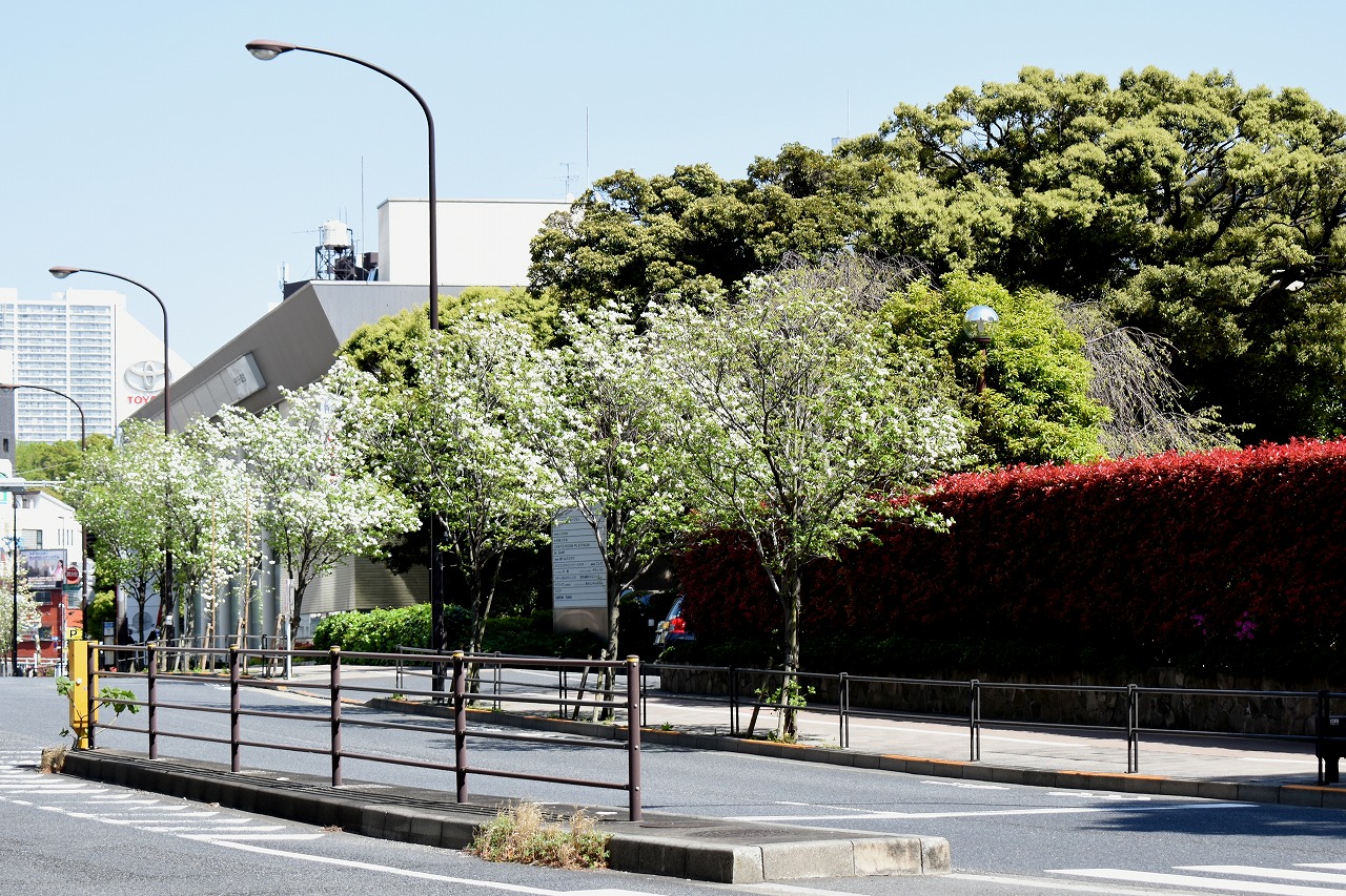 「一言」日吉坂からどんぐり児童遊園にかけての目黒通りのハナミズキに白い花が咲き出して綺麗です。医科研やプラチナ通リの