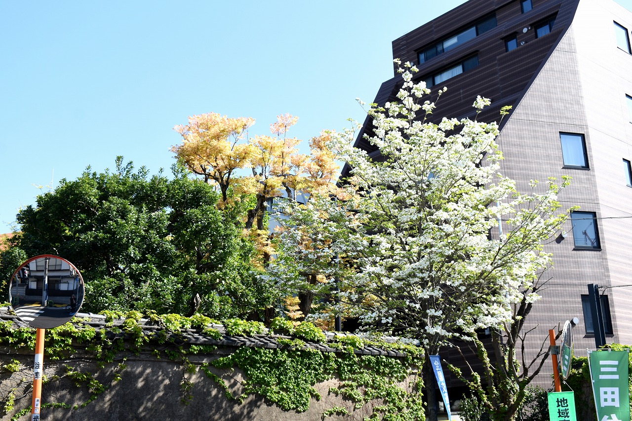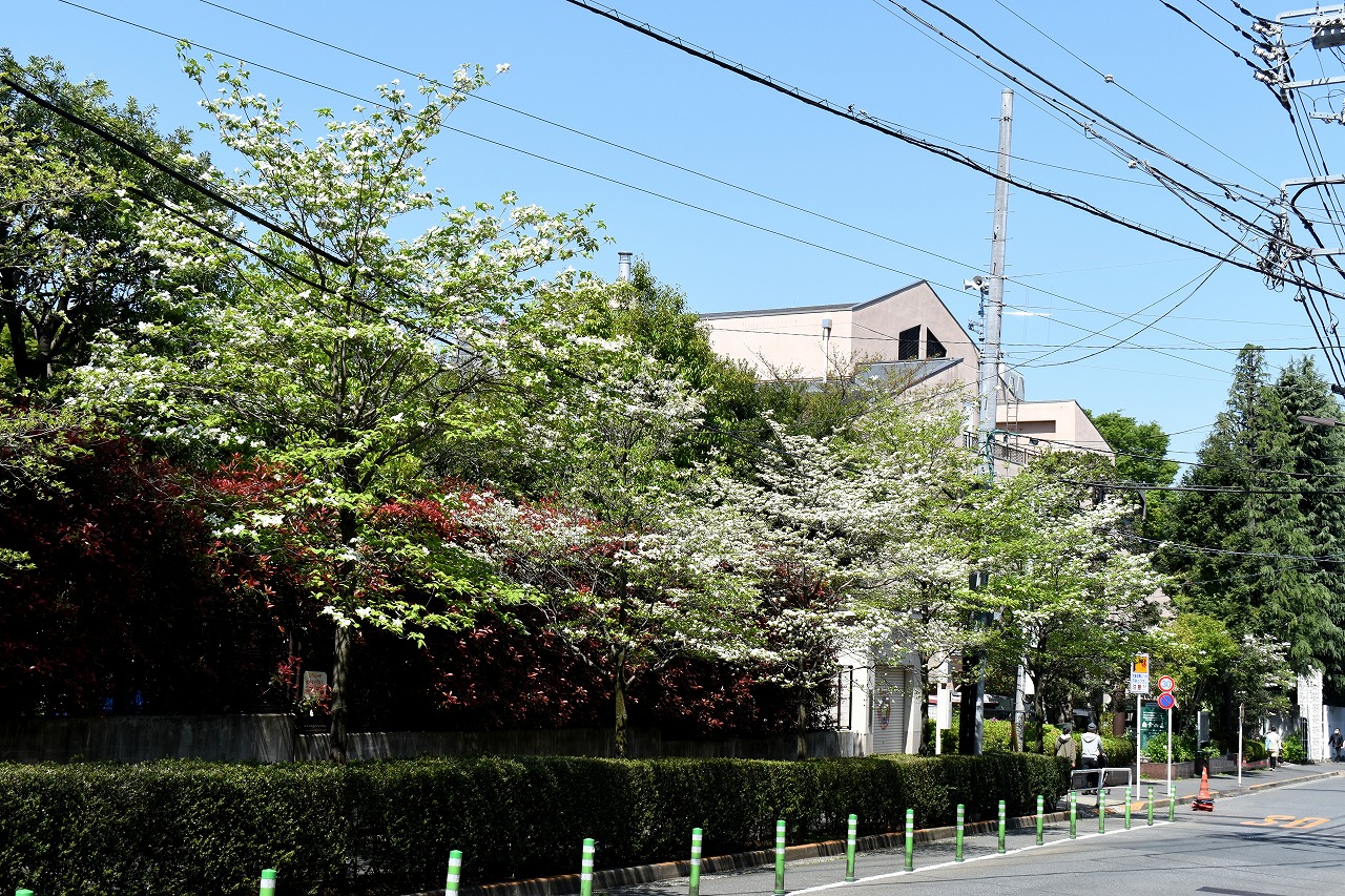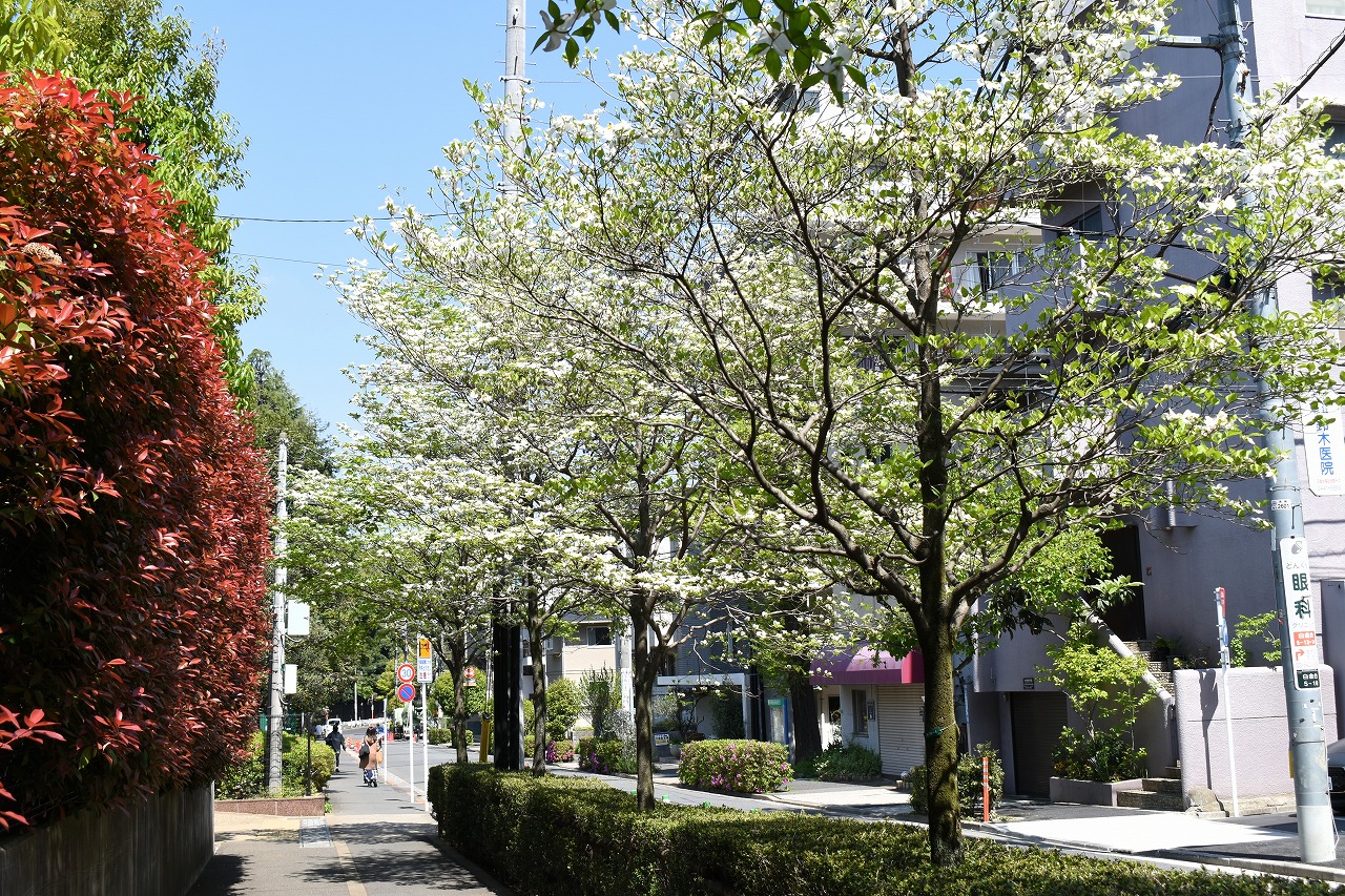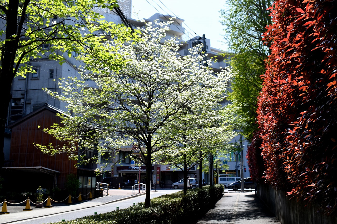 「一言」日吉坂から目黒通リにかけてのハナミズキの並木に花が咲き綺麗です。東大医科研大のイチョウも新緑が綺麗です。 どんぐり児童遊園には八重桜が咲き、藤の花が咲いています。花の房も大きくなってきました。魚籃坂下の交差点の 芝桜が見頃になっています。札ノ辻の近くの芝桜も咲き出しています。玉鳳寺や證誠寺の八重桜も満開になっています。 正山寺にはモッコウバラやジャーマンアリスが咲いています。桜田通りの宝生院のjハナミズキは満開です。