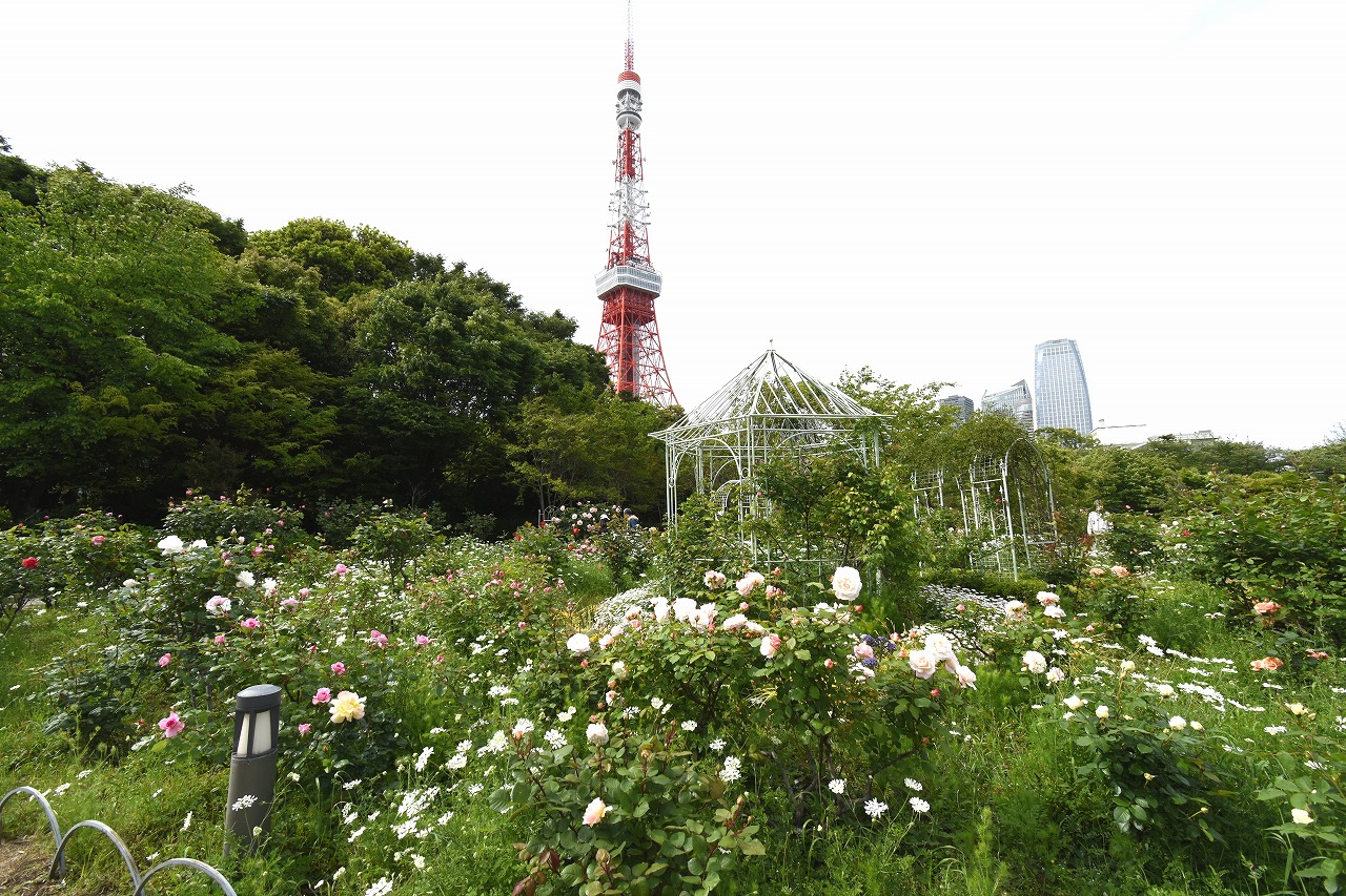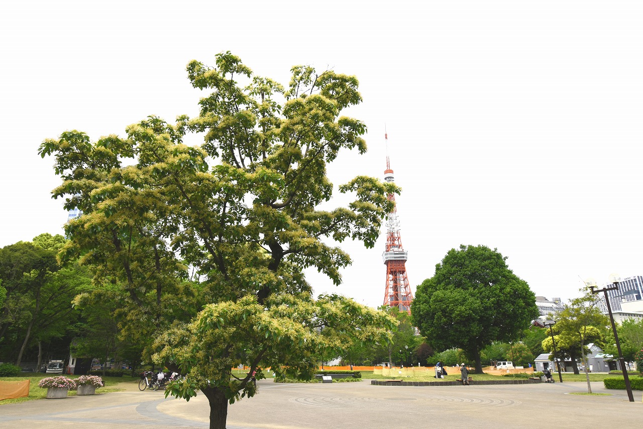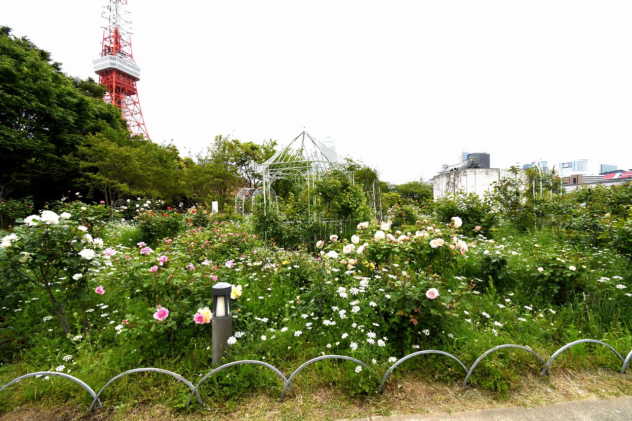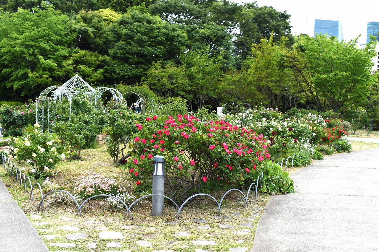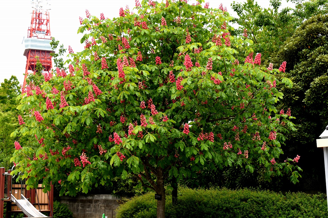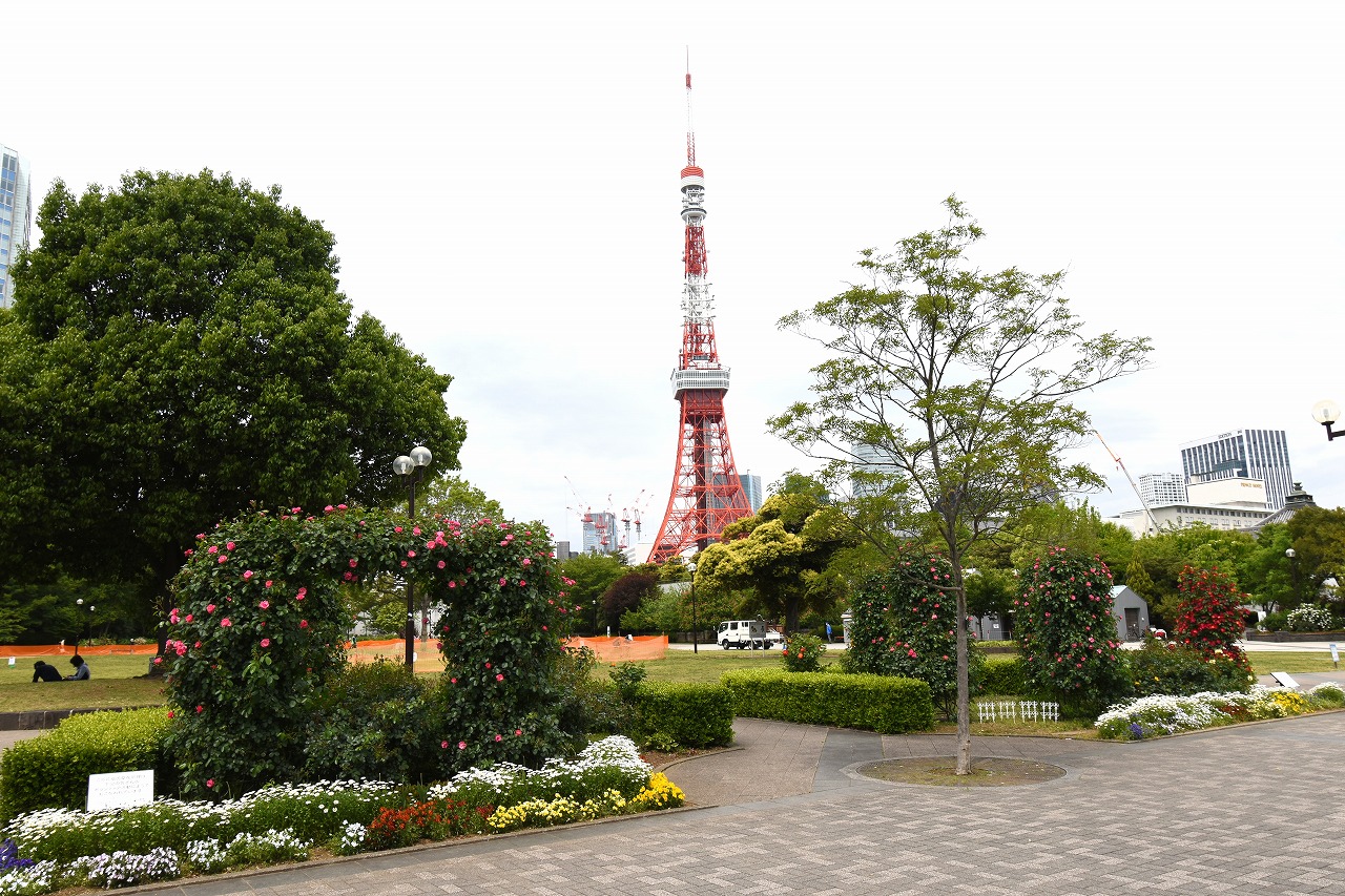 芝公園は新緑が綺麗です。広場にバラの門が出来ました。ベニバナトチノキに花が咲きました。花壇には色々な花が咲いています。