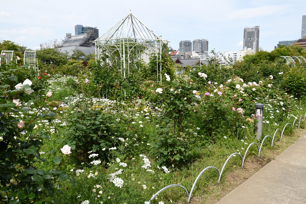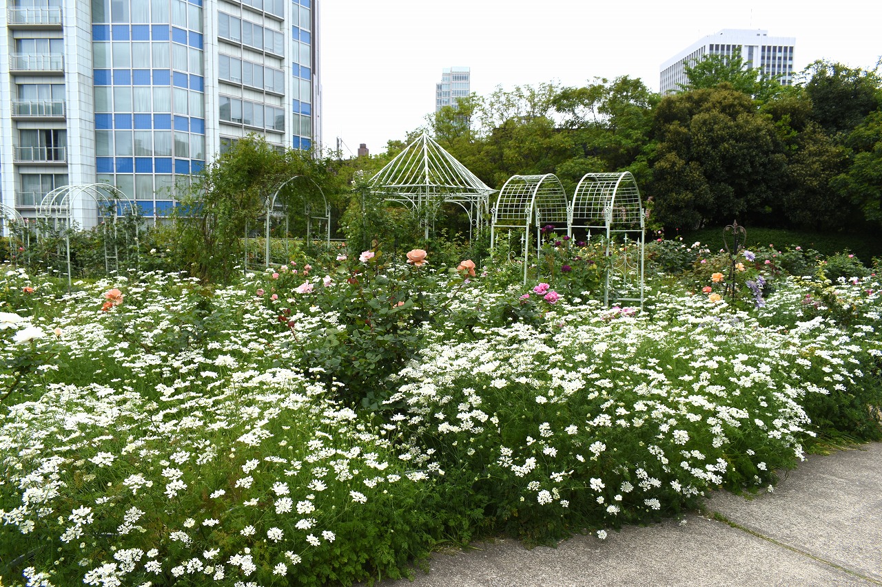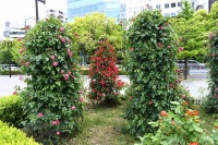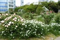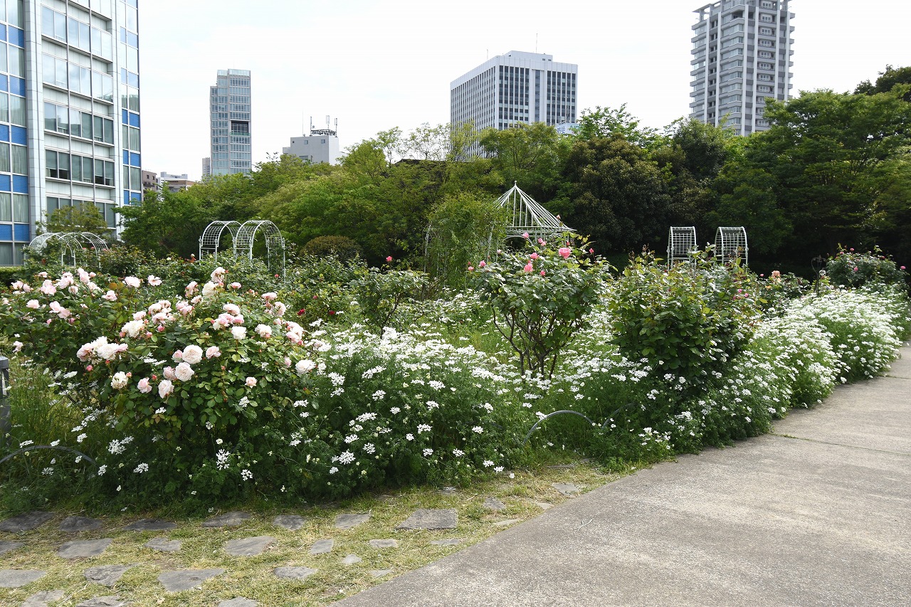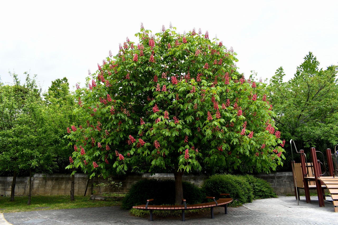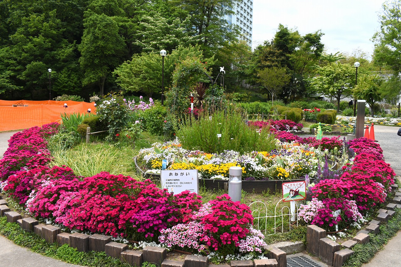 芝公園は新緑が綺麗です。広場にバラの門が出来ました。ベニバナトチノキに花が咲きました。花壇には色々な花が咲いています。