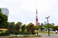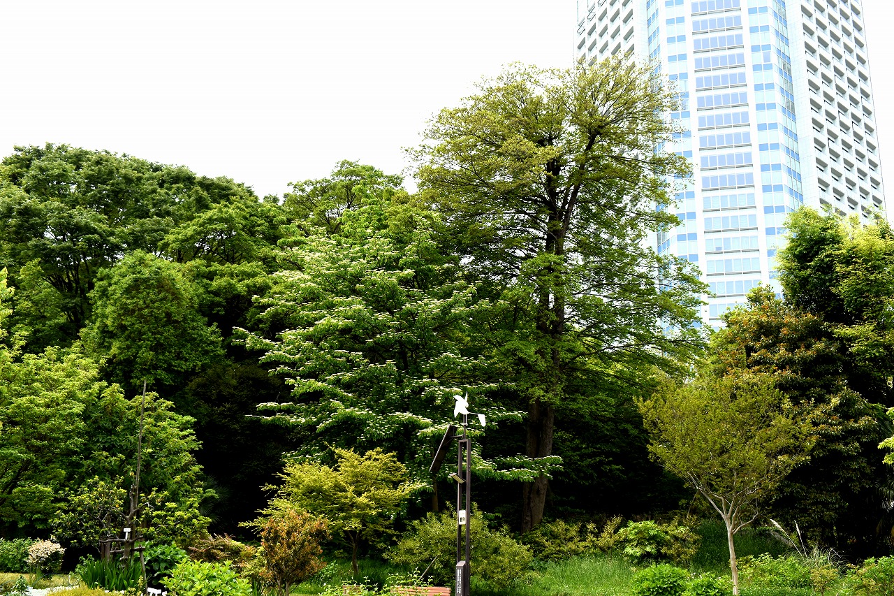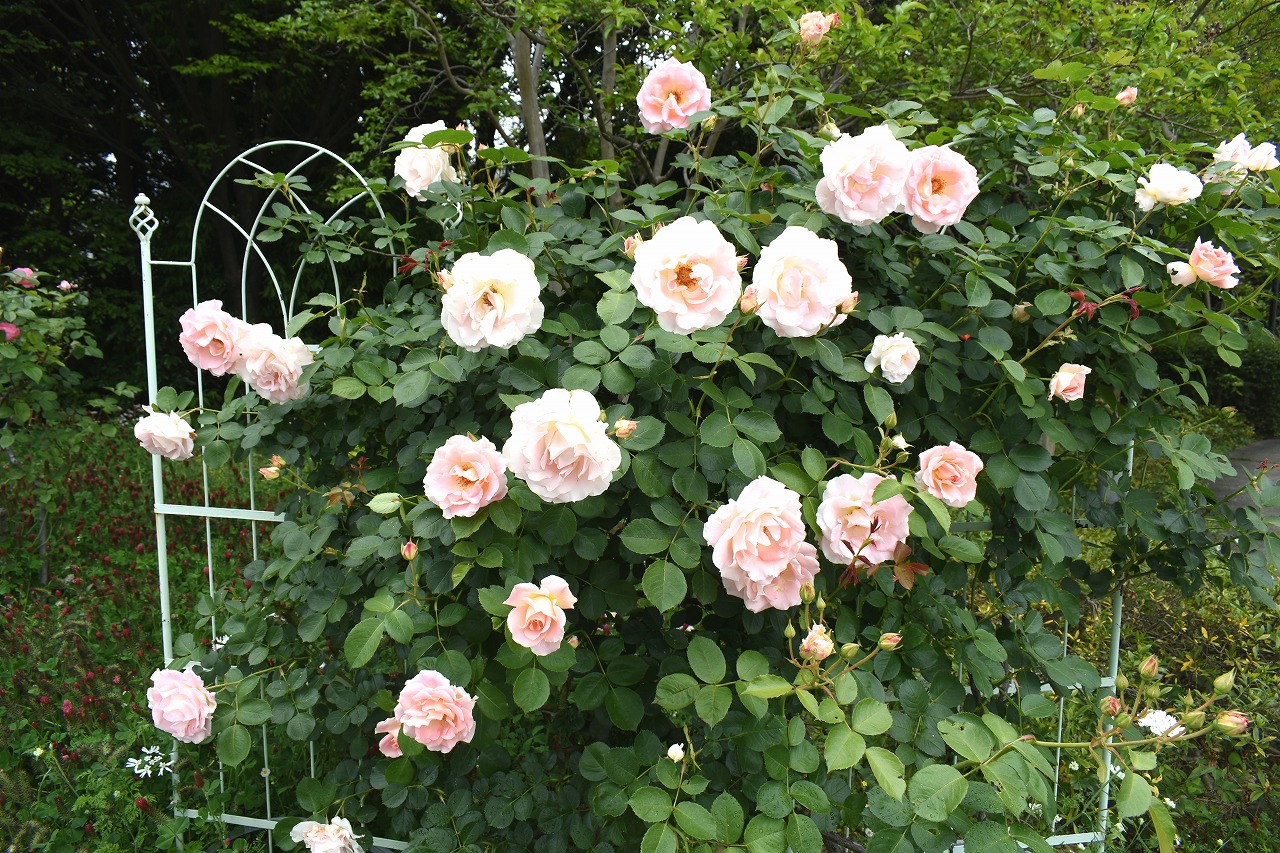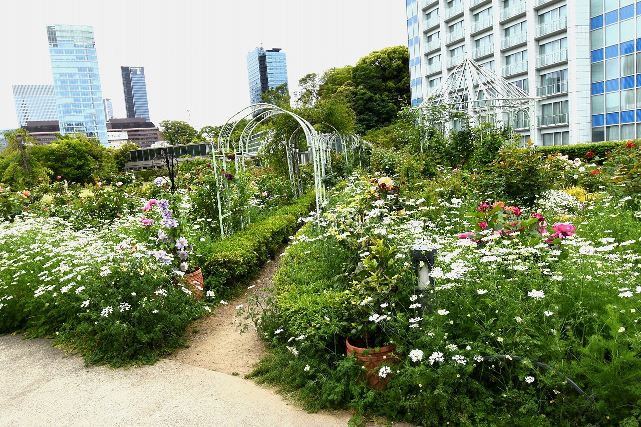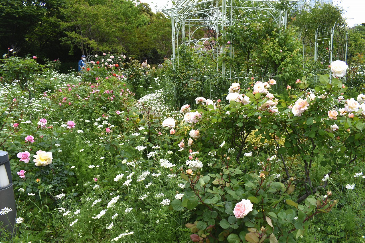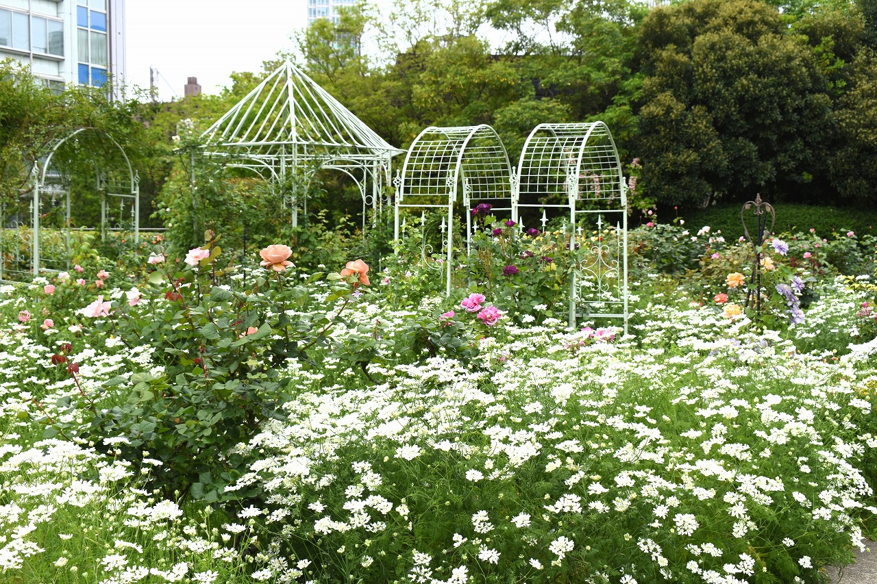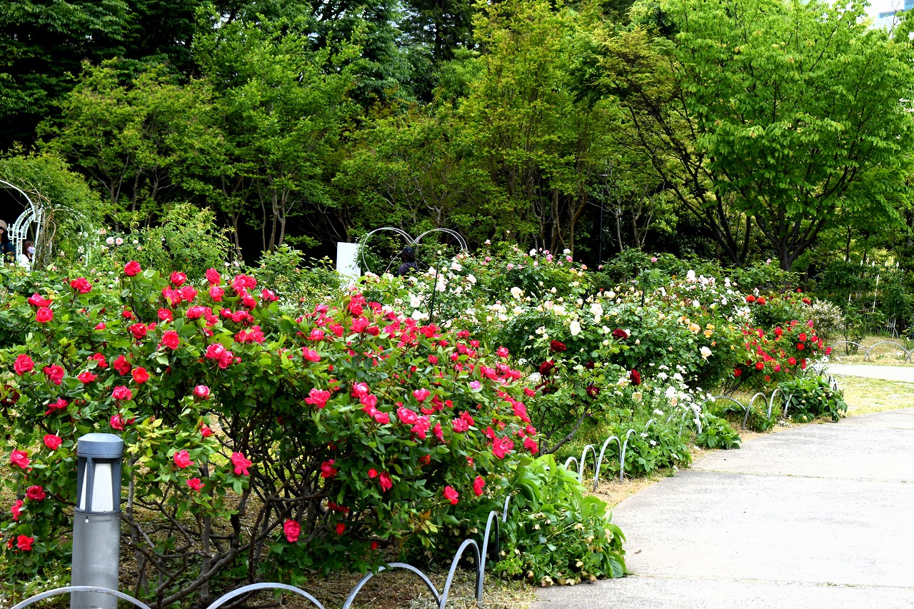 芝公園は新緑が綺麗です。広場にバラの門が出来ました。ベニバナトチノキに花が咲きました。花壇には色々な花が咲いています。